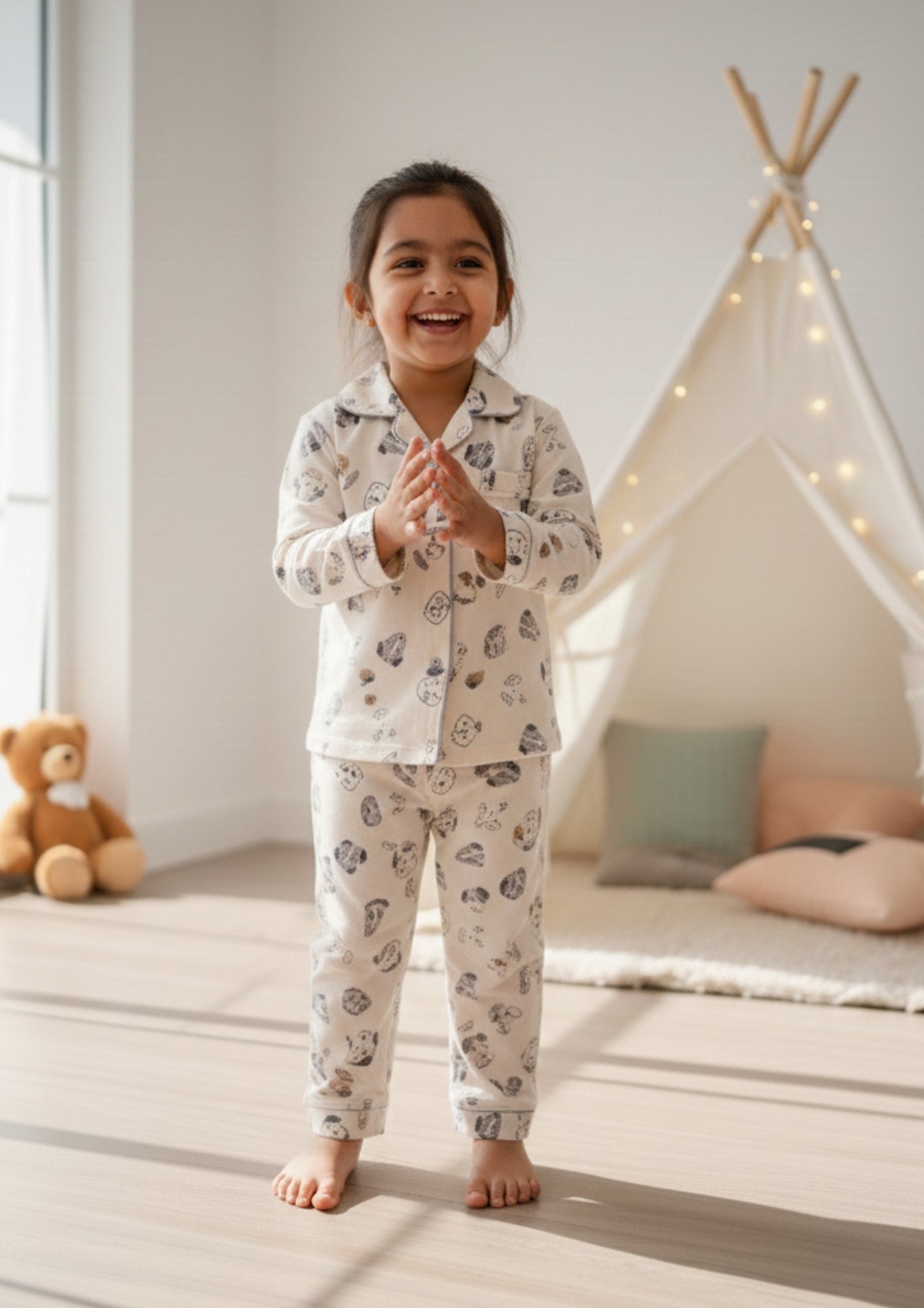 The Snow Pup Kids Set brings cozy charm to nightwear with its delightful all-over puppy face print set against a soft, light base. Designed in a coordinated two-piece silhouette, it features a full-sleeve collared shirt with a classic button-down front, paired with matching straight-fit pants for a clean, timeless look. The relaxed structure allows easy movement through playtime, storytime, and bedtime, while the playful print adds warmth and personality. Perfect for both boys and girls, this unisex kids night suit combines comfort, ease, and an irresistibly cheerful appeal.