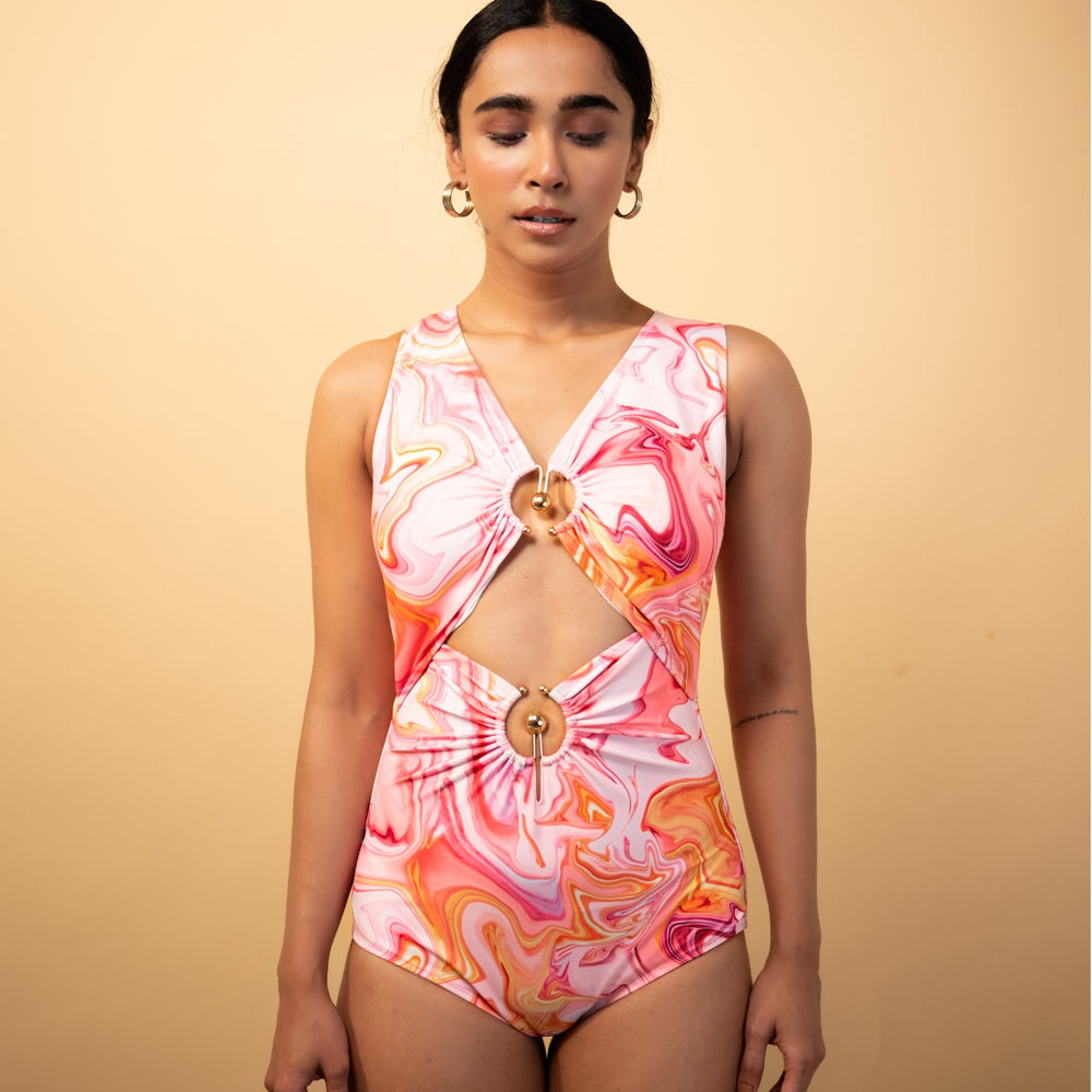 Romance meets rhythm in our Rose Rhapsody Swim Set — a swirl of blush pinks, coral tones, and golden accents that mirror the beauty of marbled art. The twisted front design with a gold embellishment gives a luxe lift to the top, while the high-waisted ruched bottoms enhance your curves and provide confident coverage. Whether you're lounging poolside or catching waves, this suit makes a bold yet feminine statement.