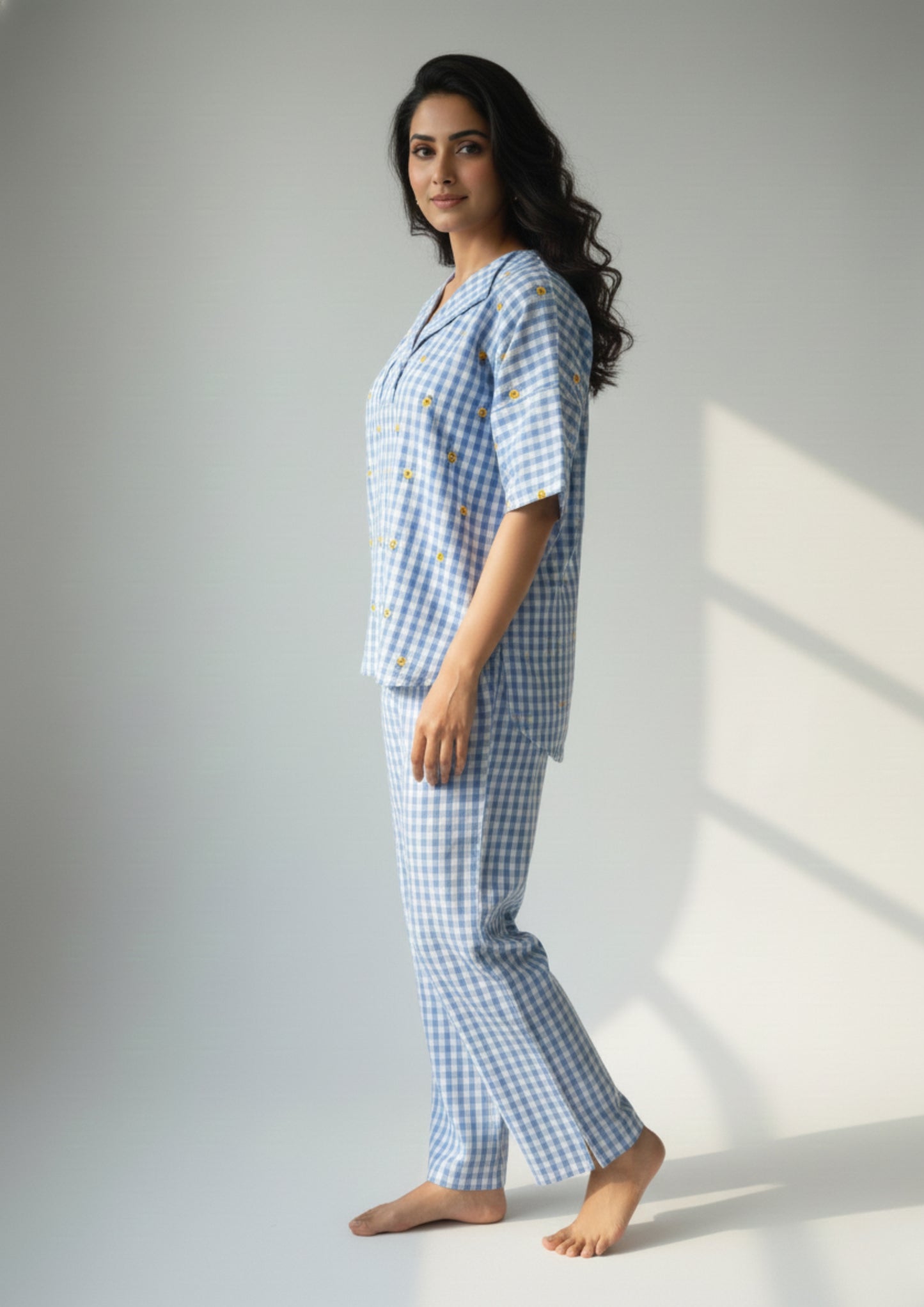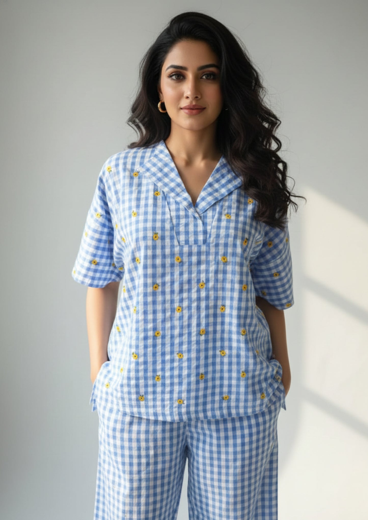 The Sunflower Check Embroidered Co-Ord Set brings together playful charm and everyday comfort. Crafted in airy cotton, this two-piece set features timeless blue checks accented with subtle yellow floral embroidery that adds a fresh, cheerful touch.