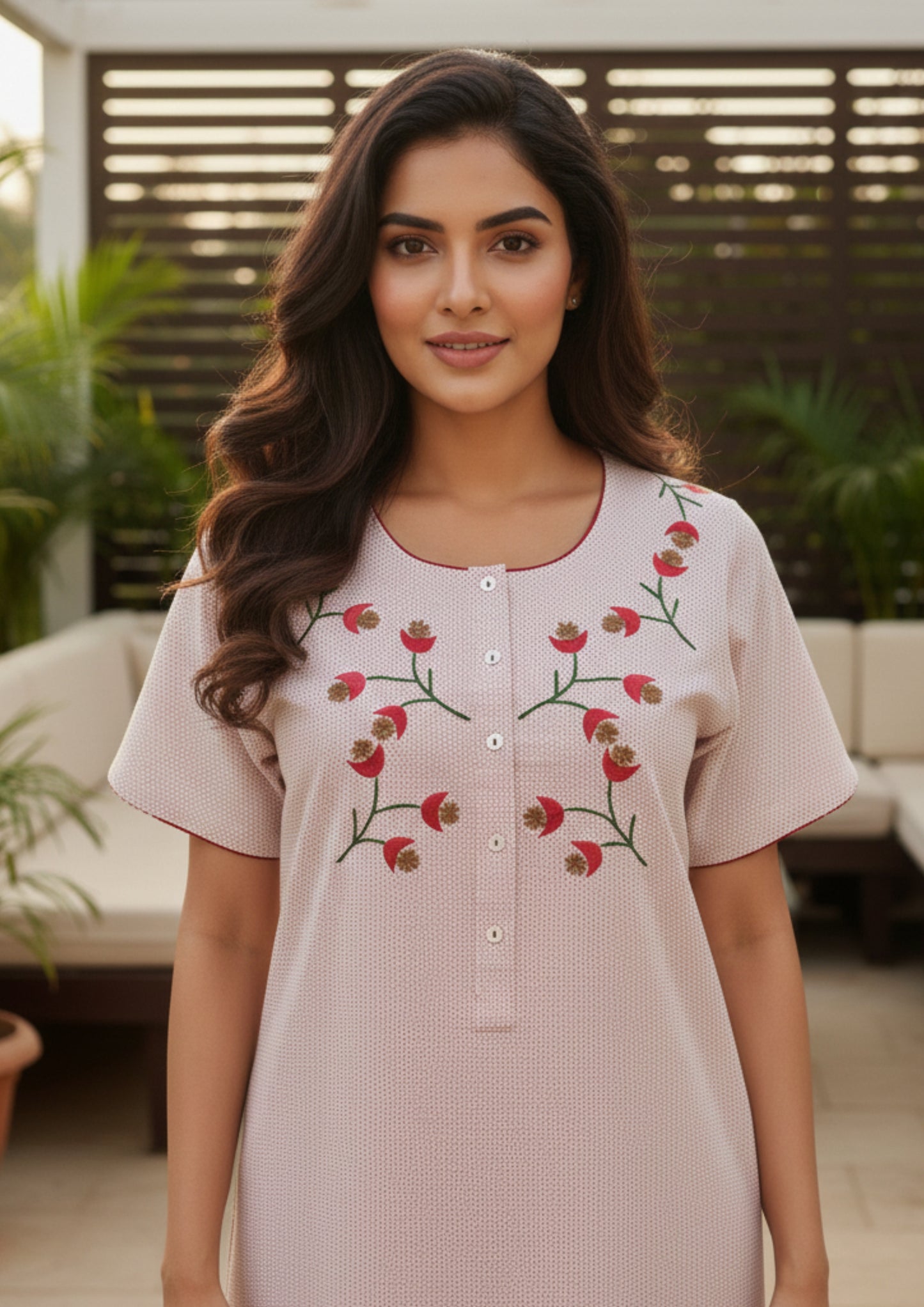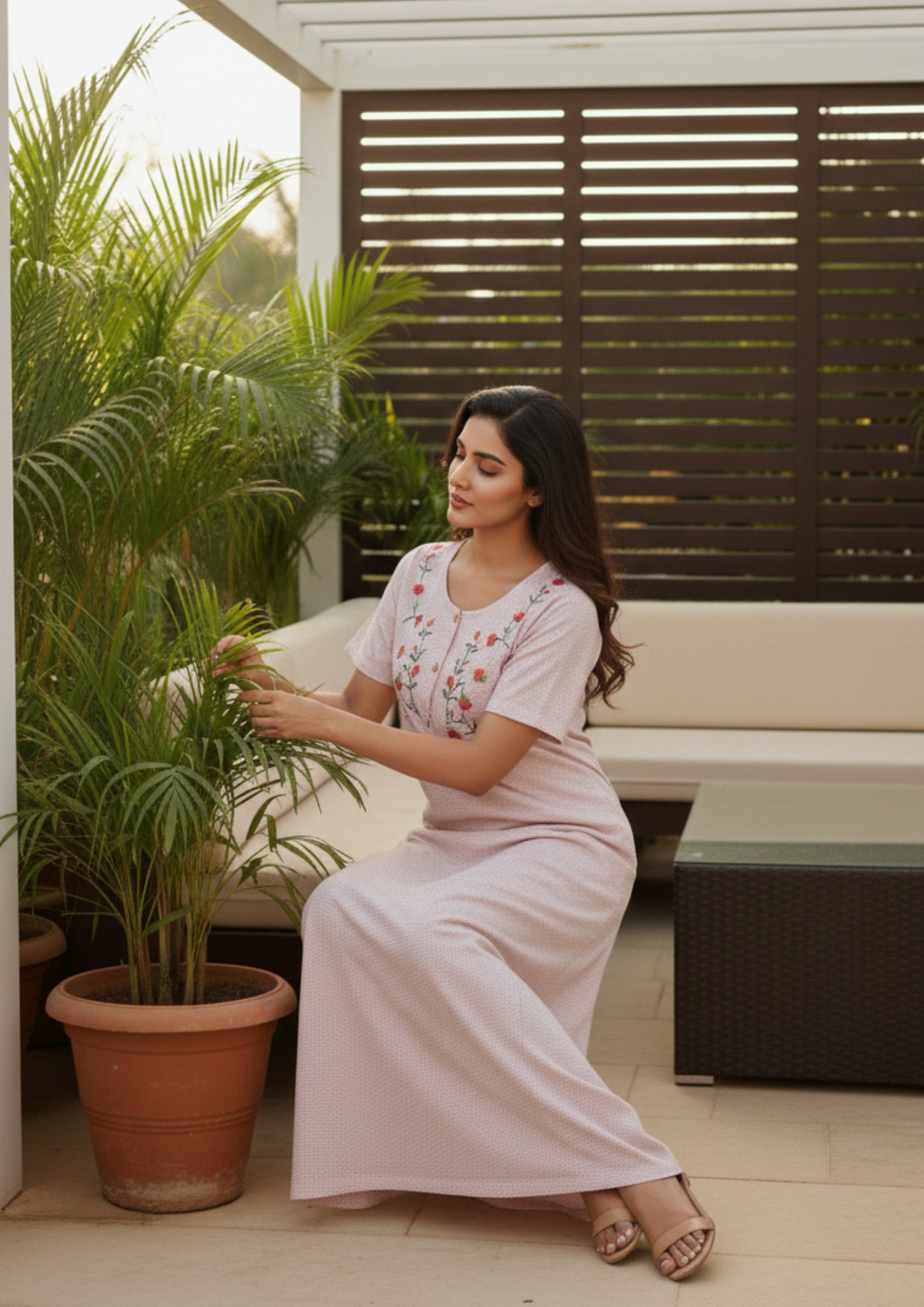 Effortless elegance meets everyday comfort in our Blossom Harmony Hand-Embroidered Nighty. Crafted in a soft pastel base with a subtle textured weave, this piece is elevated with beautifully detailed floral embroidery—bringing a touch of charm and femininity to your nightly unwind routine.