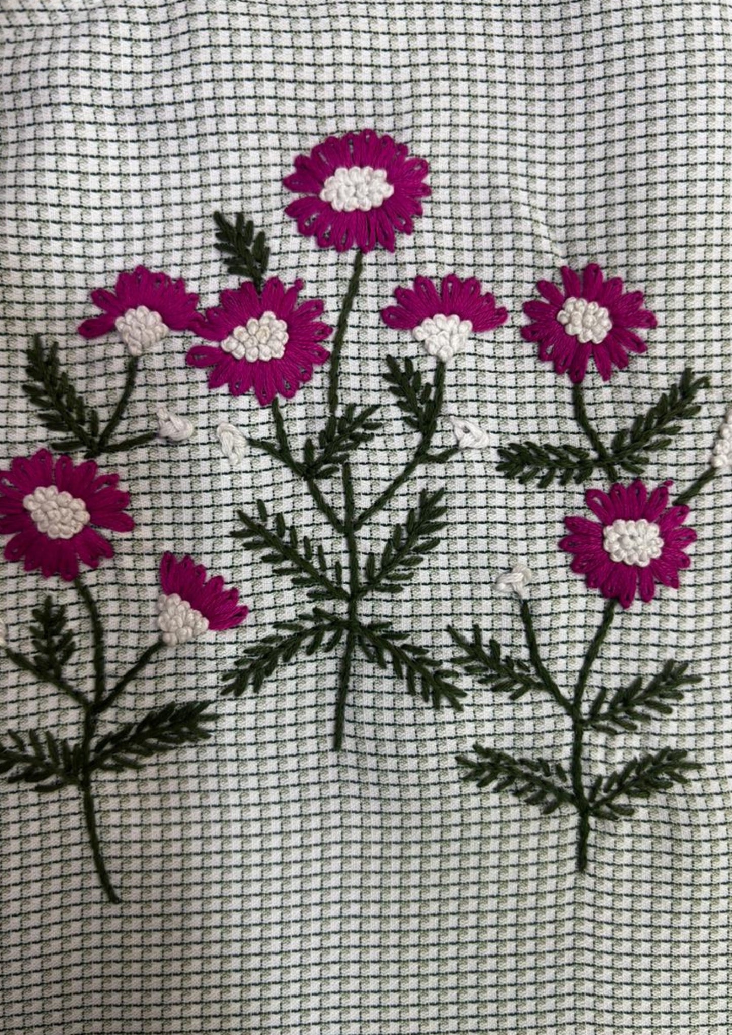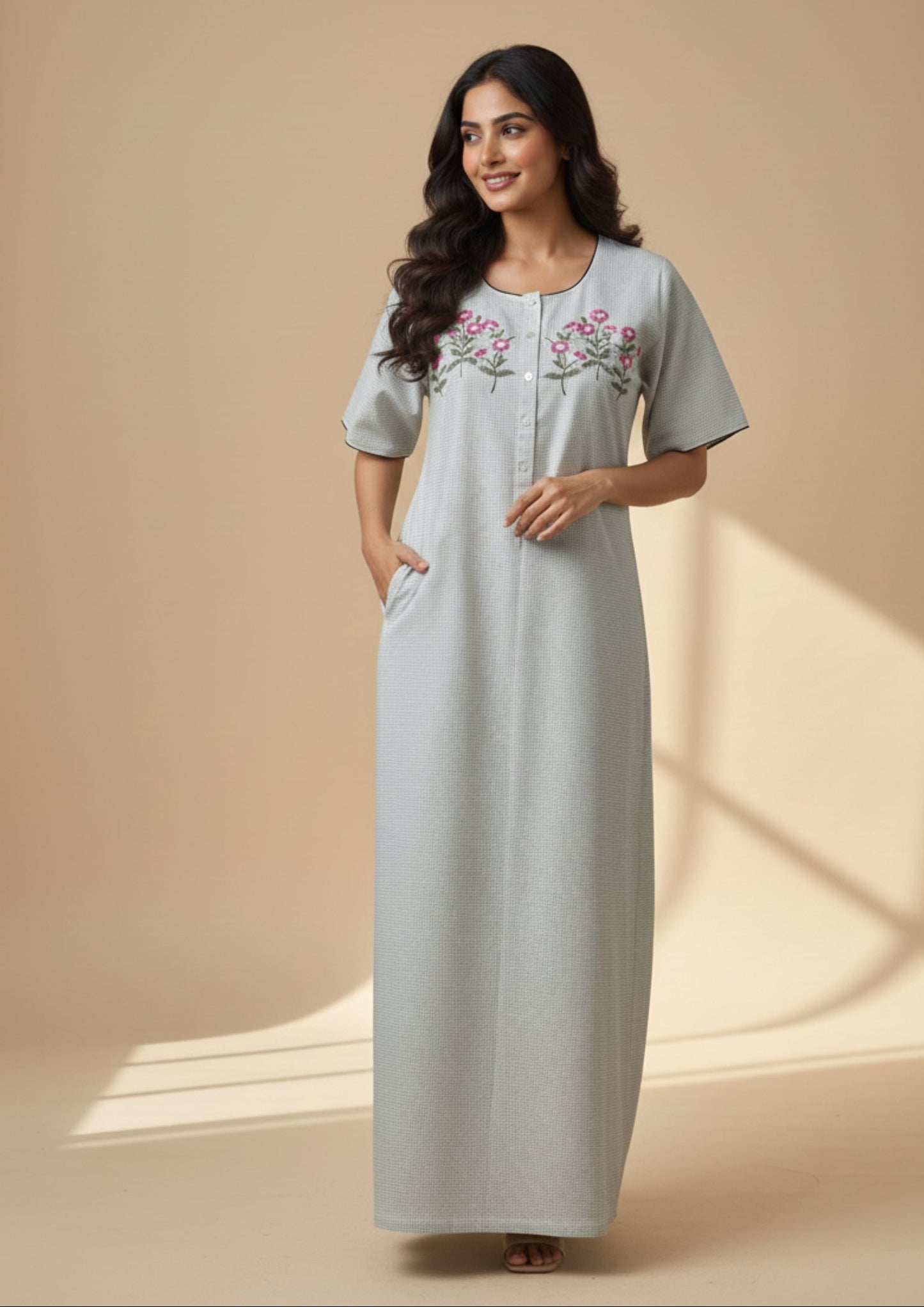 The highlight is its delicate hand embroidery—vibrant floral motifs blooming across the yoke, adding a refined, feminine touch. Finished with a classic round neckline, button placket, and airy short sleeves, this nighty blends tradition, charm, and modern sophistication in one timeless piece.