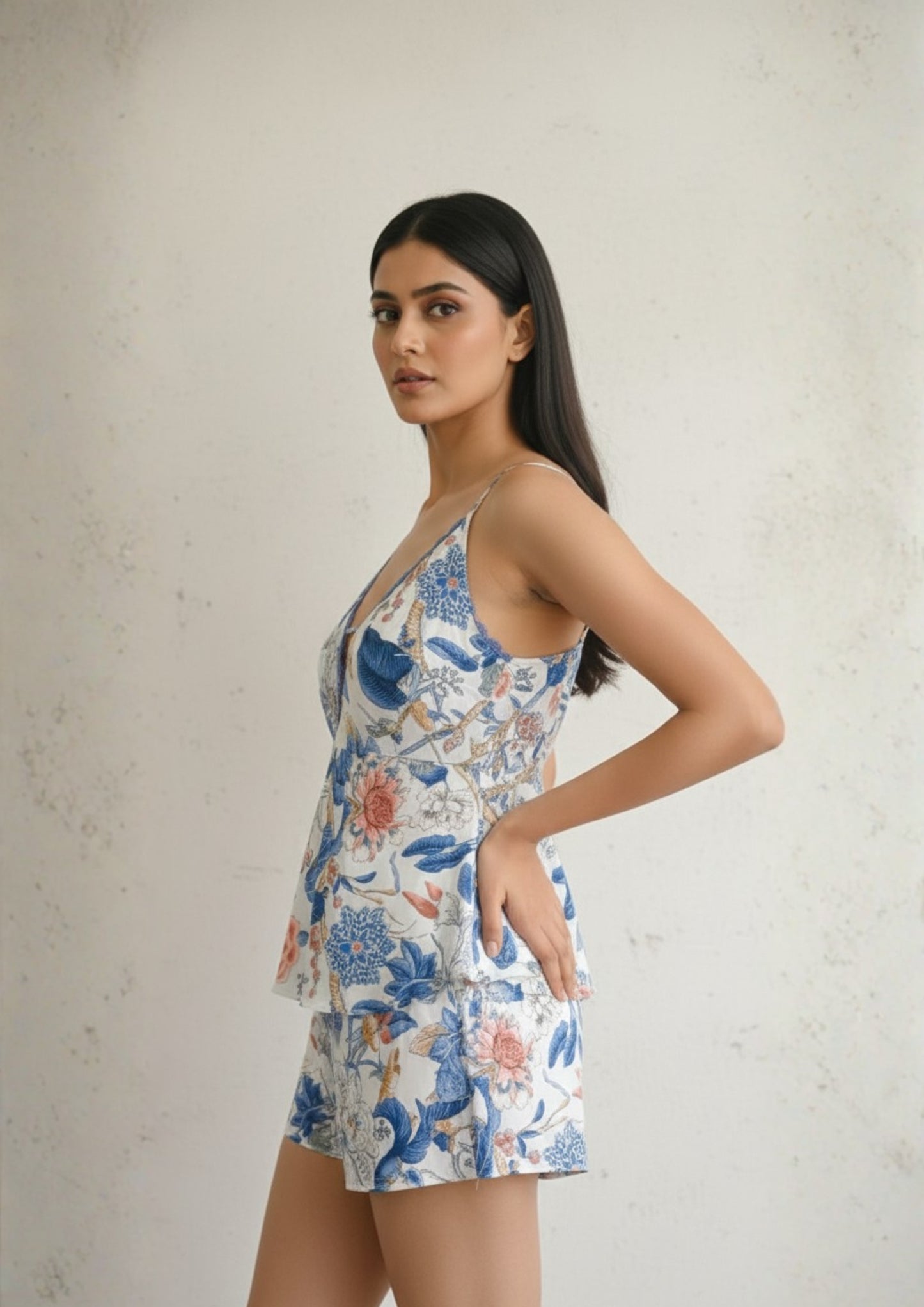 The floral print evokes calm elegance, while the lace-detailed camisole adds just the right hint of allure. Paired with easy-fit shorts, this set is perfect for honeymoon nights, bridal trousseau packing, or simply indulging in self-care moments before the big day.