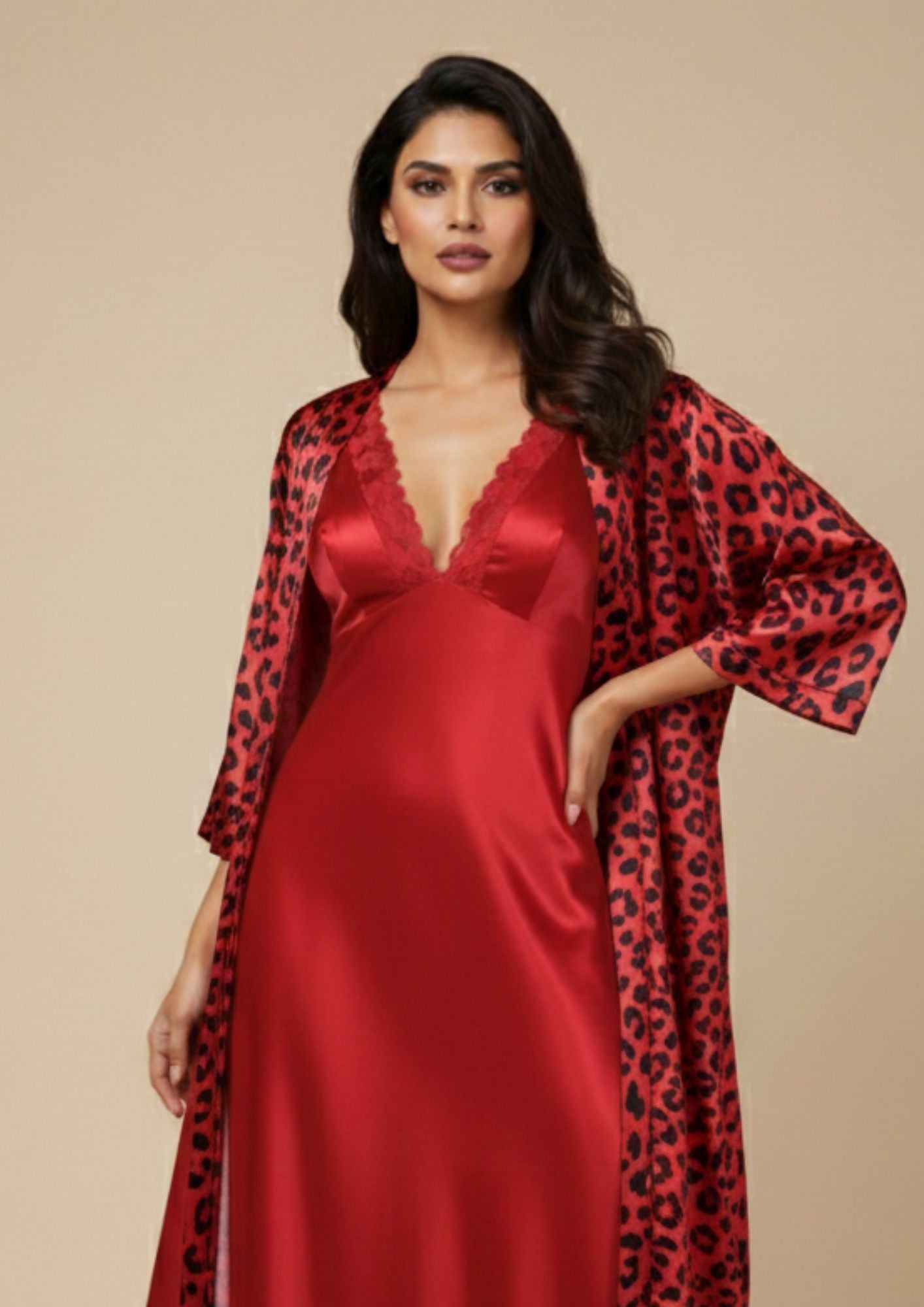 The Scarlet Temptation Satin 2-Piece Nighty Gown Set is designed for women who embrace confidence with elegance. Crafted in rich satin, the inner gown offers a sleek silhouette enhanced by delicate lace detailing at the neckline, while the matching printed robe adds drama and allure with its bold pattern. The silky texture glides effortlessly on the skin, making it as comfortable as it is striking. Perfect for bridal wear or indulgent evenings, this set is a refined blend of sensuality, luxury, and timeless sophistication.