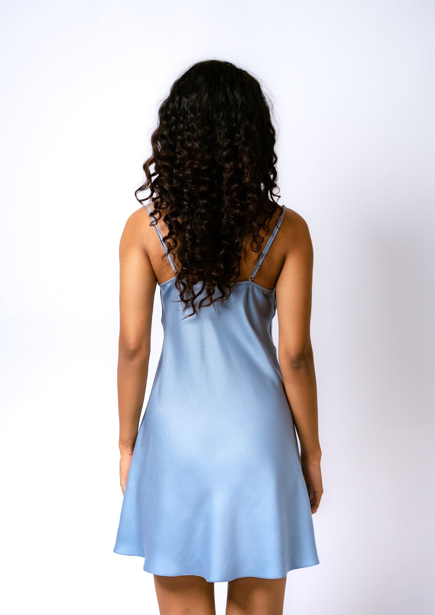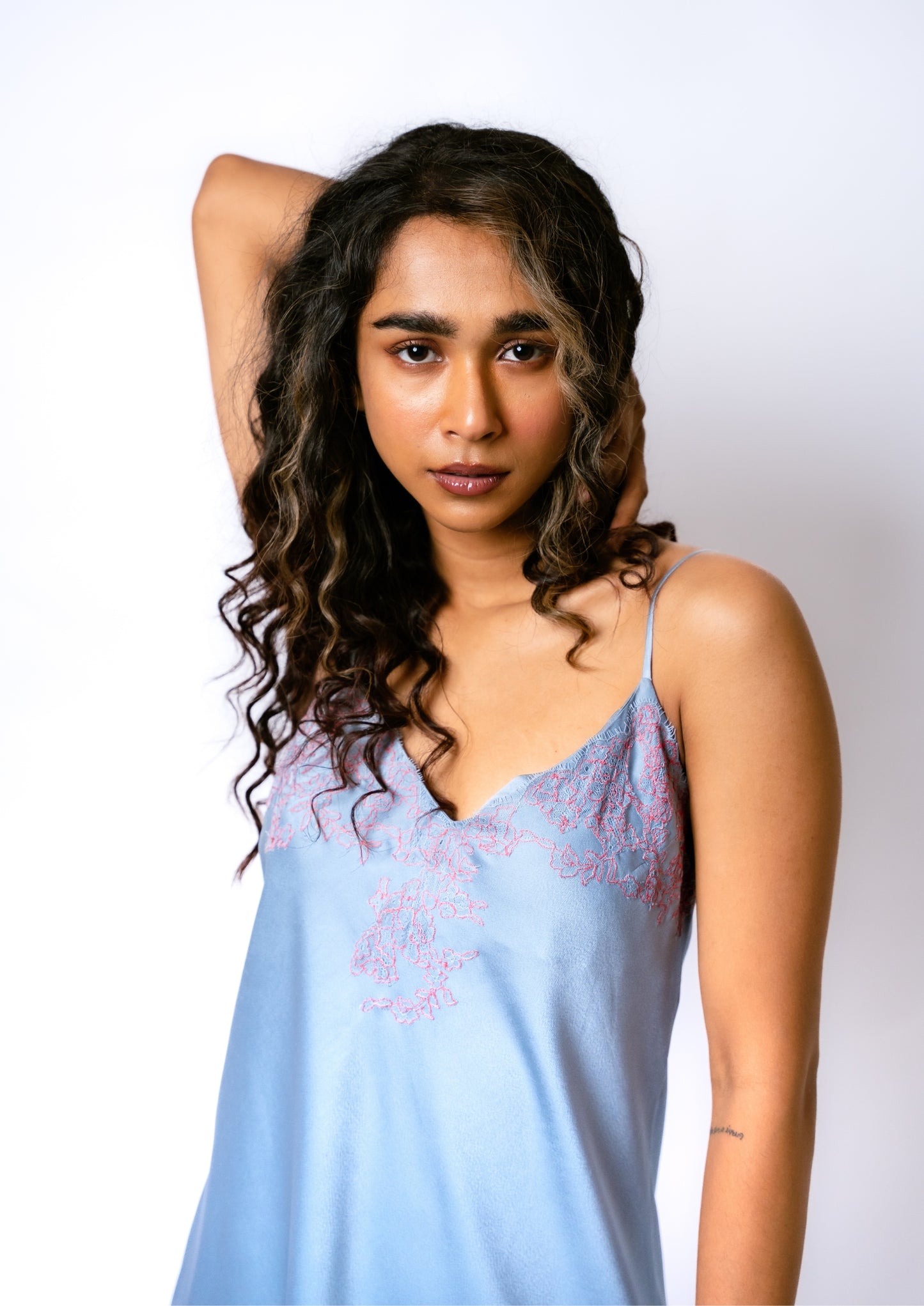 The Powder Blue Bridal Chemise is a modern expression of bridal elegance with a soft, romantic edge. Designed in a flattering A-line silhouette, it features delicate floral embroidery tracing the V-neckline, adding texture and feminine definition. Slim shoulder straps enhance its graceful shape, while the gently flared hem creates effortless movement. Perfect for wedding nights, honeymoon moments, or intimate evenings, this embroidered bridal nighty blends sensual simplicity with timeless charm.