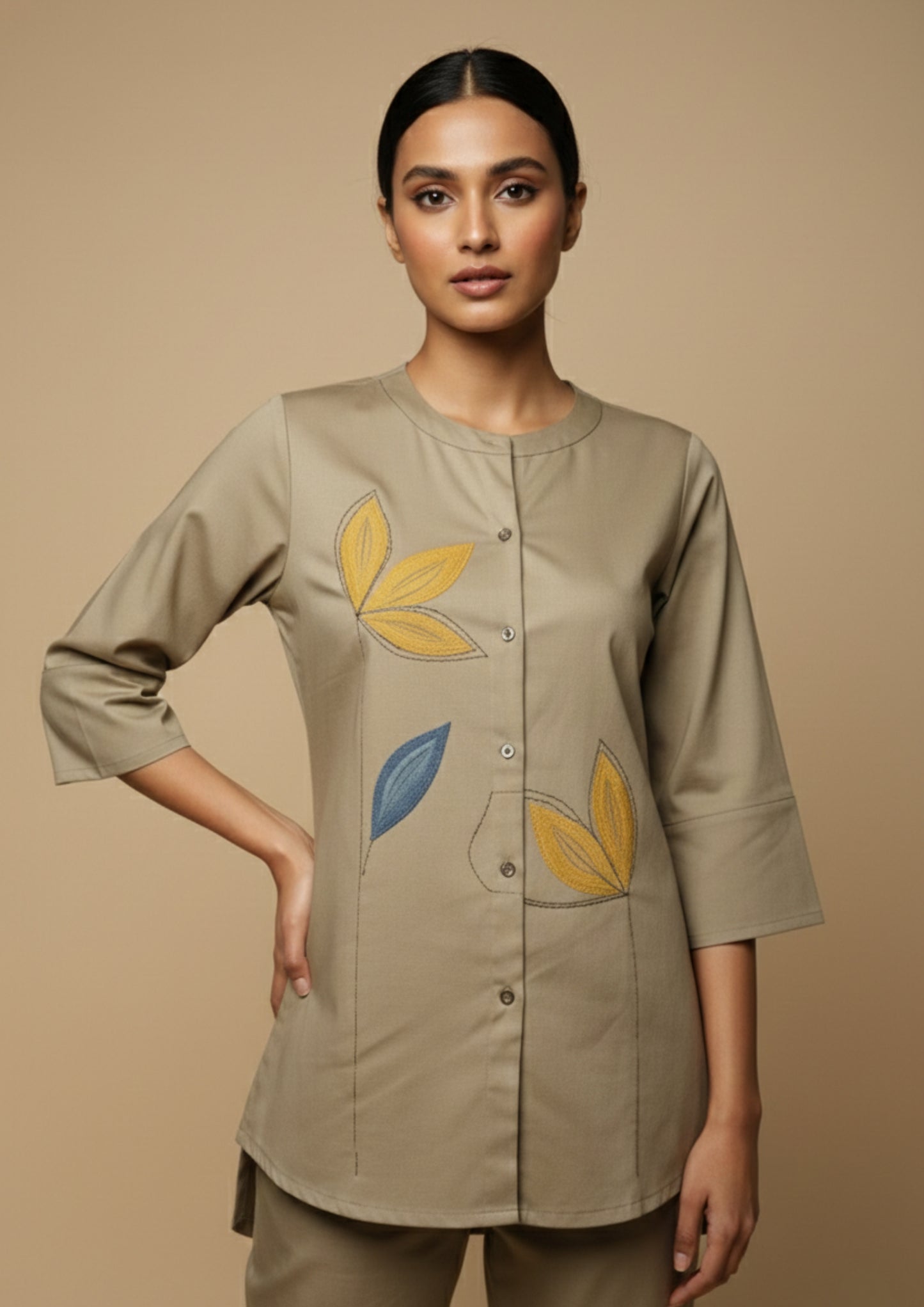 Make everyday dressing feel artful with the Beige Bloom Applique Co-ord Set — a modern fusion of comfort and creativity. Crafted from soft cotton, this relaxed-fit ensemble features hand-cut floral appliqué in cheerful yellow and sky-blue tones, bringing life and vibrant to a minimal beige canvas.