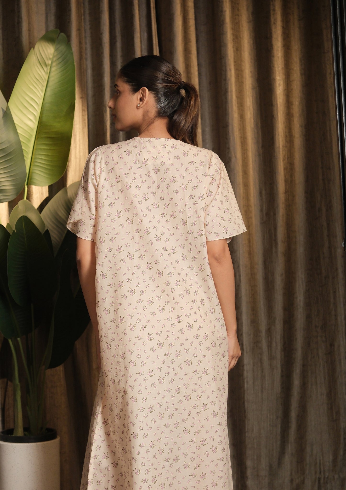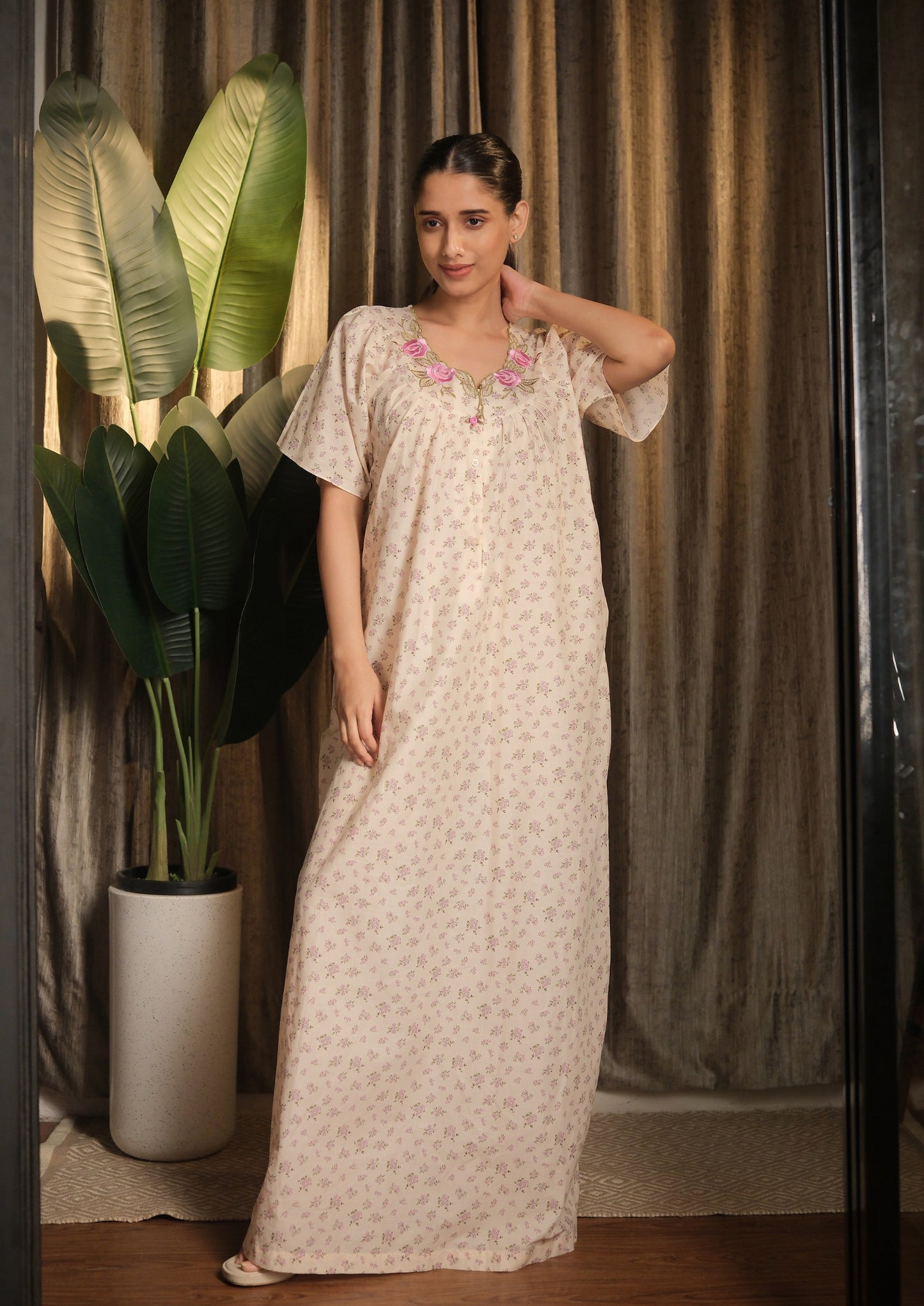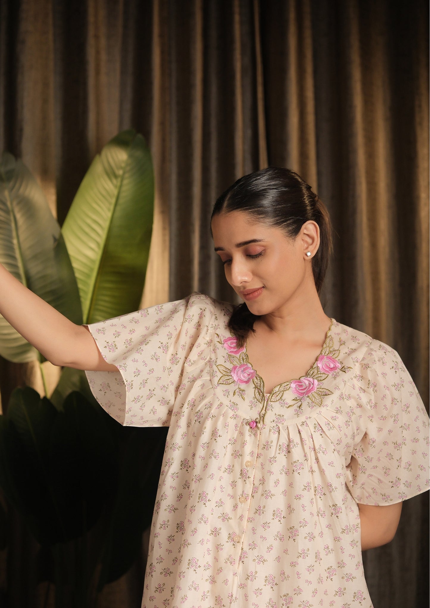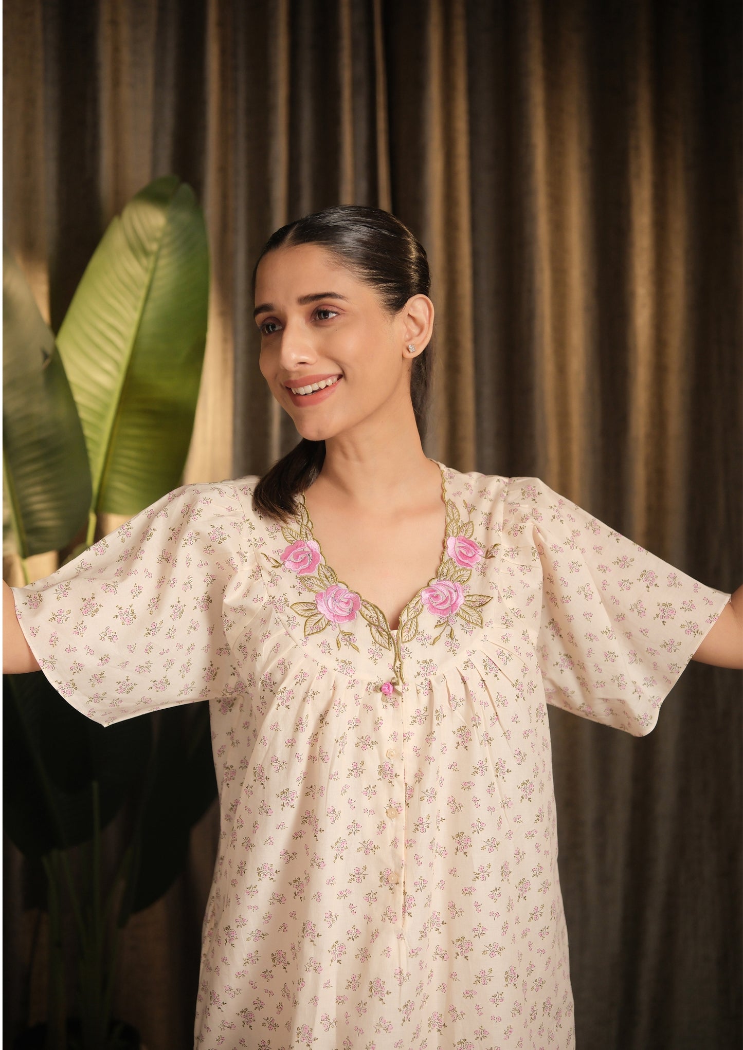 Designed for women who value comfort with subtle elegance, the Blush Bloom Hand-Embroidered Nighty is a beautiful blend of tradition and ease. Crafted in soft cotton, it features delicate hand embroidery along the neckline, adding a gentle touch of craftsmanship without overpowering the design.