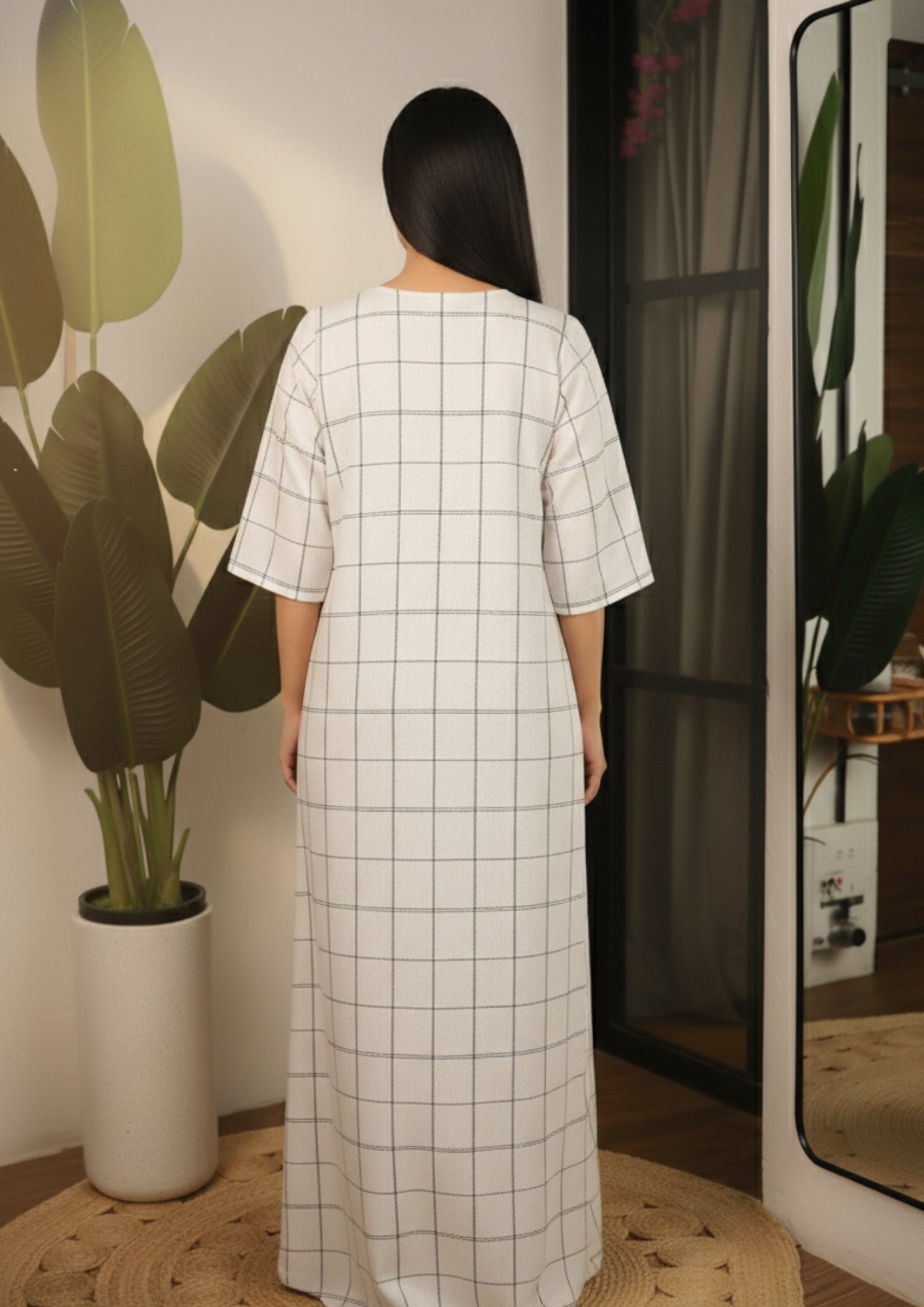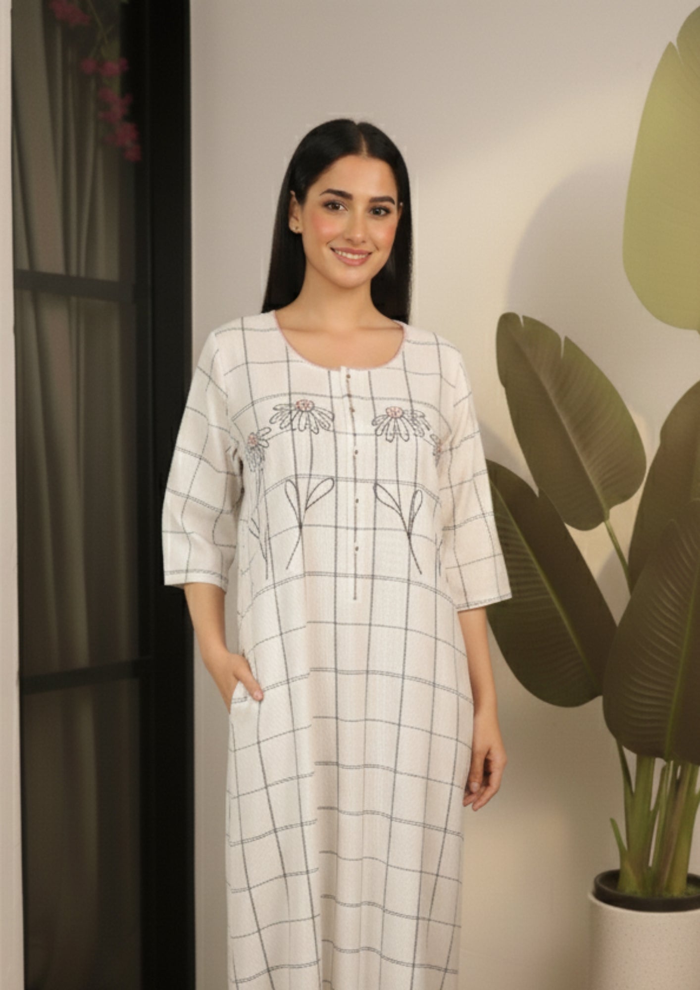 Ivory Grid Garden 3/4th Sleeve Nighty