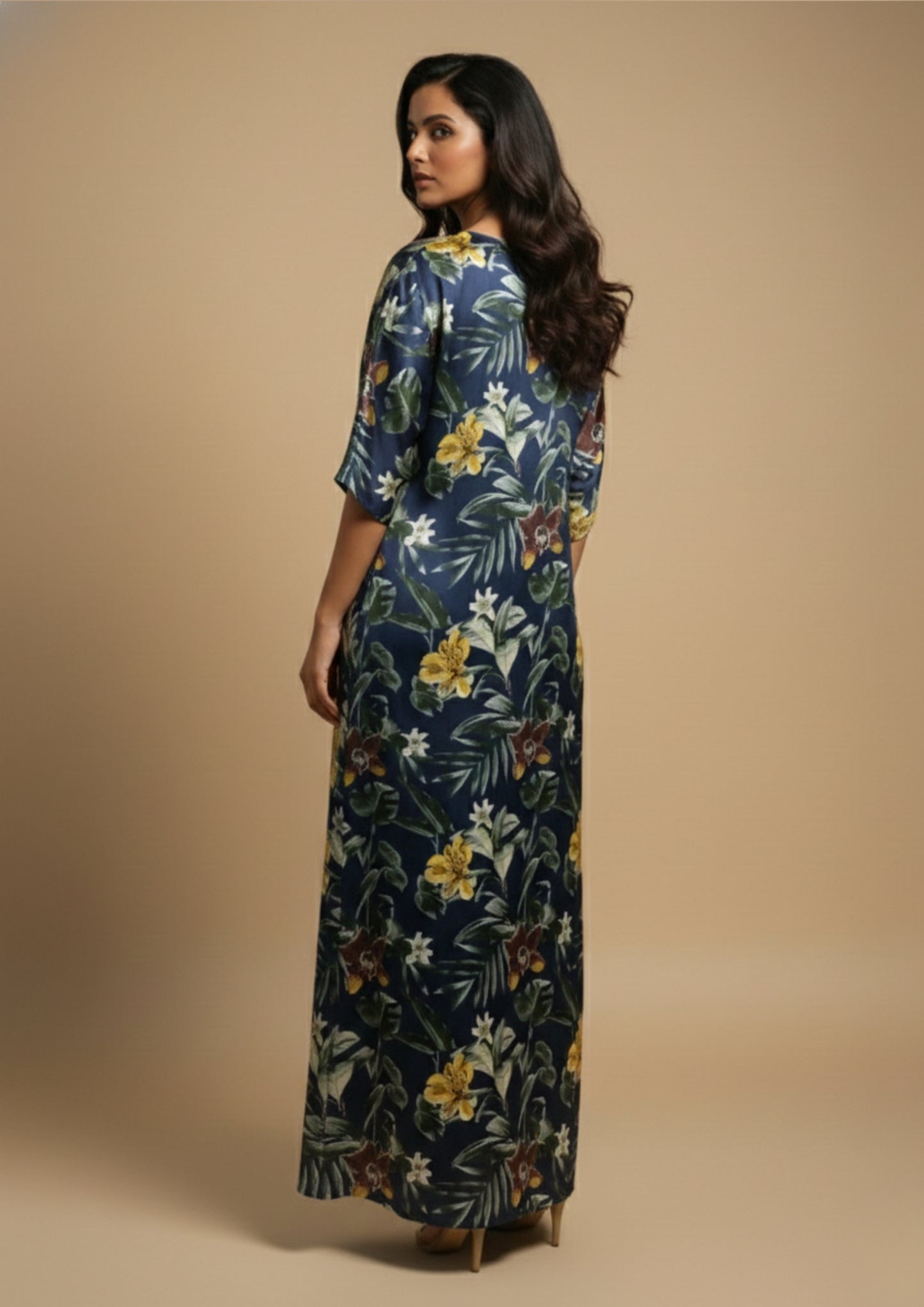 The rich floral print brings depth and sophistication, beautifully contrasted by thoughtfully placed patchwork detailing that adds a refined design element. Its relaxed yet flattering silhouette allows effortless movement, making it ideal for unwinding after long days or lounging in quiet luxury.