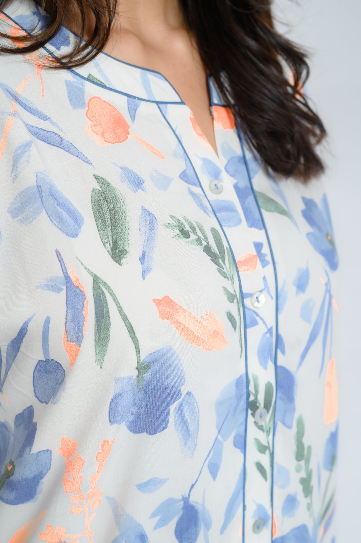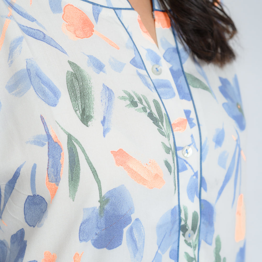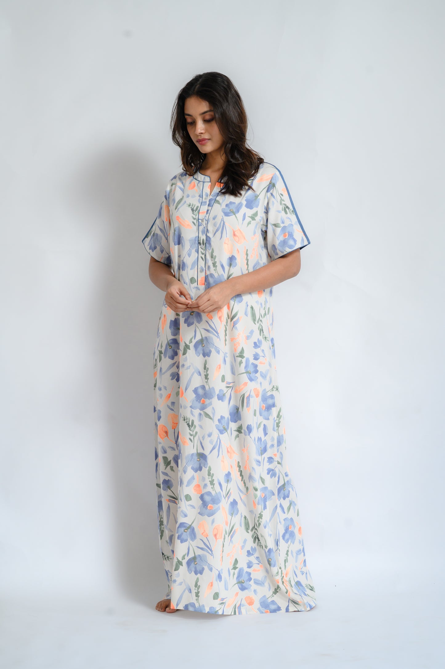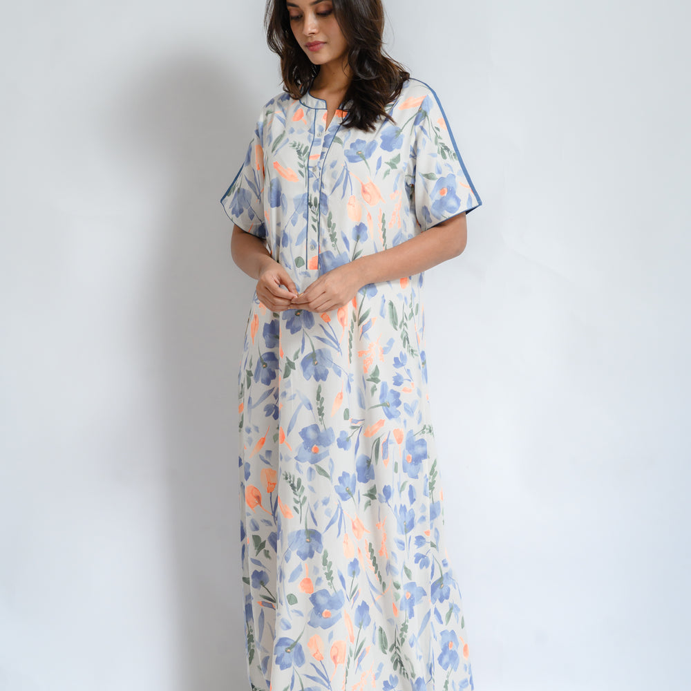 Embrace relaxed luxury with this rayon cotton floral nighty, designed for effortless comfort and grace. Featuring a soft pastel floral print and elegant piping details, it offers a look that’s both soothing and sophisticated. The breathable fabric keeps you cool, while the relaxed fit ensures all-night ease.