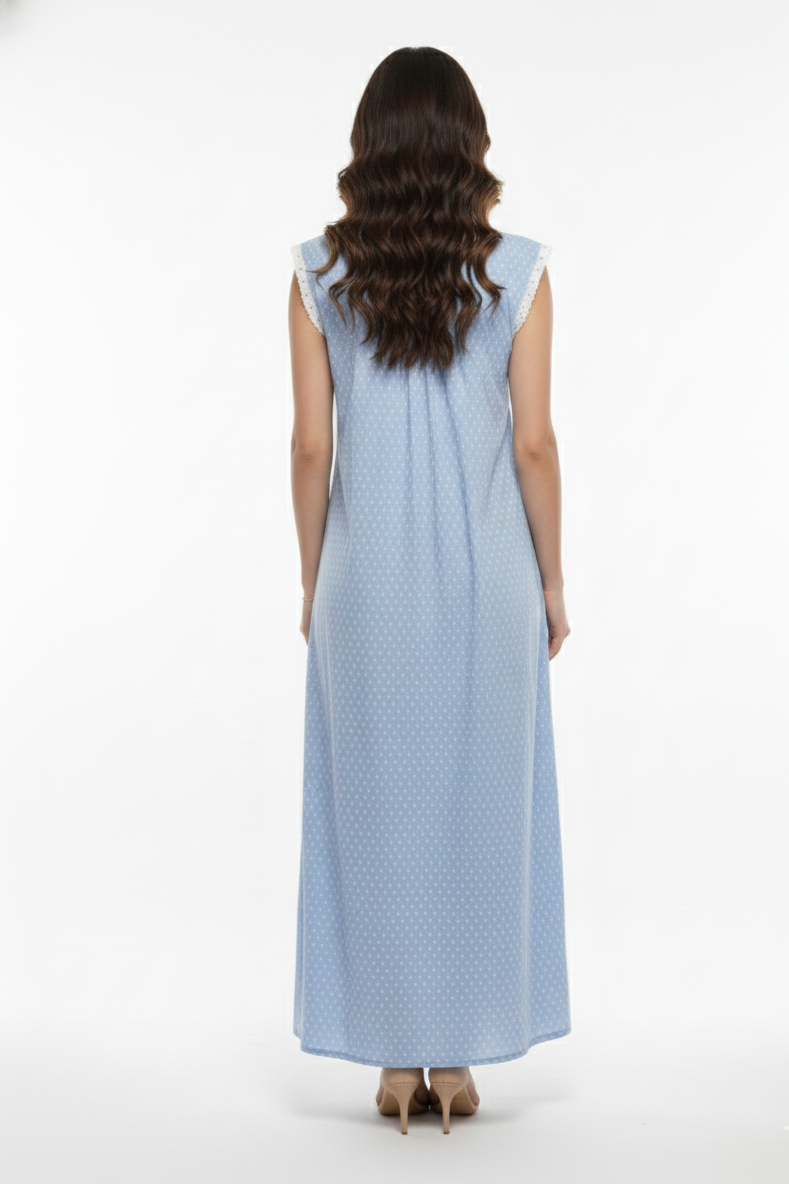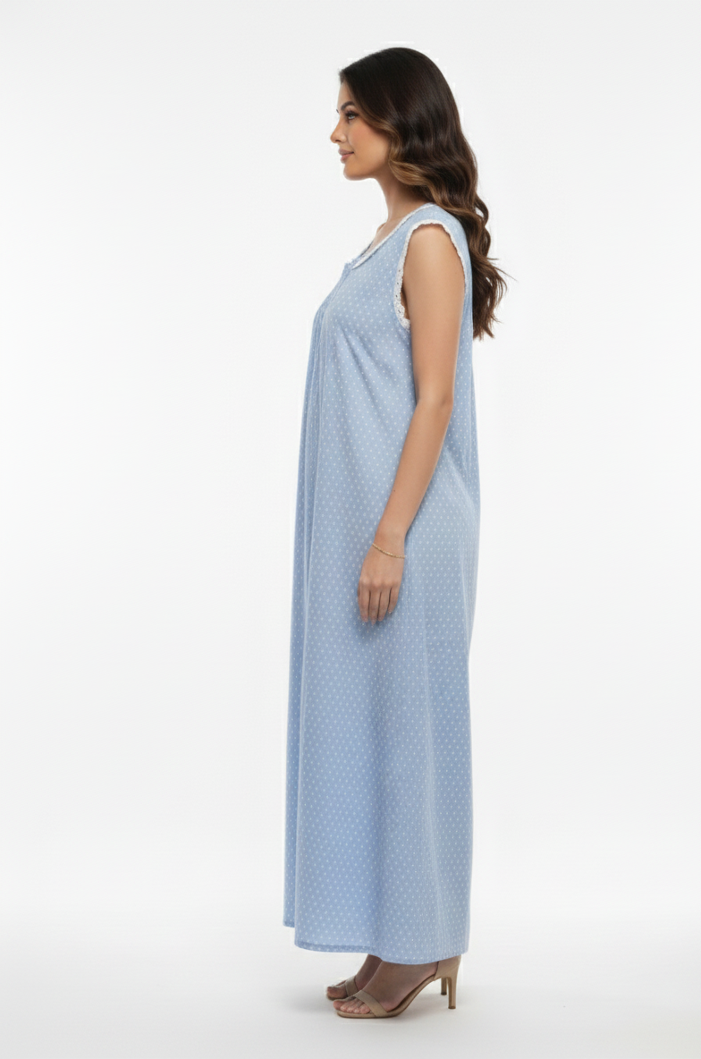 The Bluebell Whisper Sleeveless Nighty is designed for women who love understated elegance in their everyday nightwear. Crafted in a breathable, skin-friendly fabric, this nighty features a soothing polka dot print paired with subtle lace accents along the armholes for a refined finish.