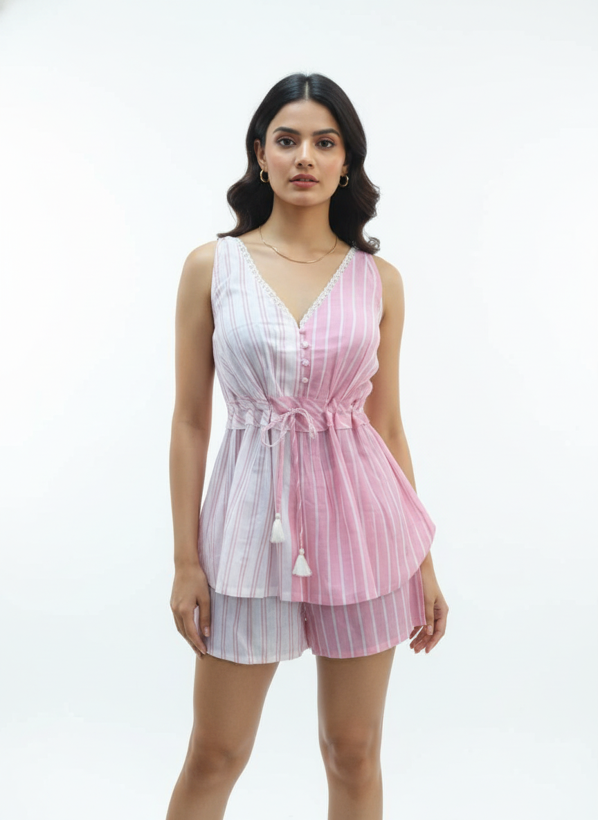 Sweet, comfortable, and effortlessly stylish — the Blush Stripe Sleep Set is designed for nights when you want to feel relaxed yet put together. The sleeveless top features a flattering V-neckline highlighted with delicate lace and an adjustable drawstring waist that gently defines the silhouette without clinging.