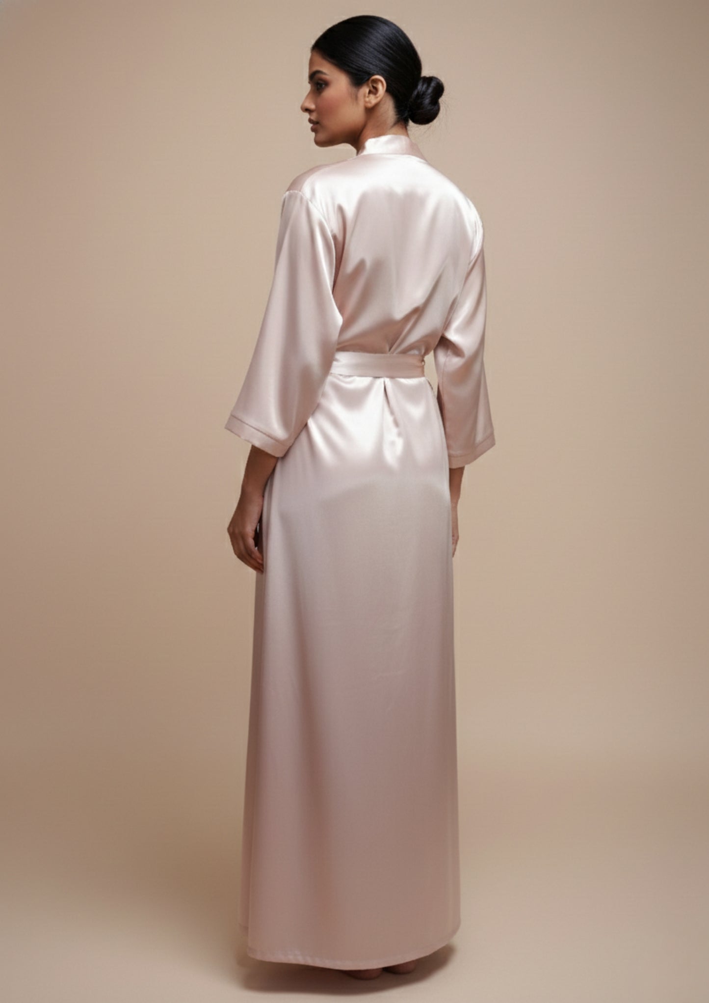 The Champagne Glow Satin Robe is designed for moments of quiet luxury and effortless sophistication. Cut in a fluid, floor-length silhouette, it drapes gracefully over the body, creating a sleek and elongating effect. The wrap-style front and deep V neckline enhance its feminine appeal, while the adjustable self-tie belt defines the waist with ease. Subtle contrast detailing along the front panel adds a refined touch, making this satin bath robe the perfect layer for elevated lounging, bridal mornings, or indulgent evenings at home.