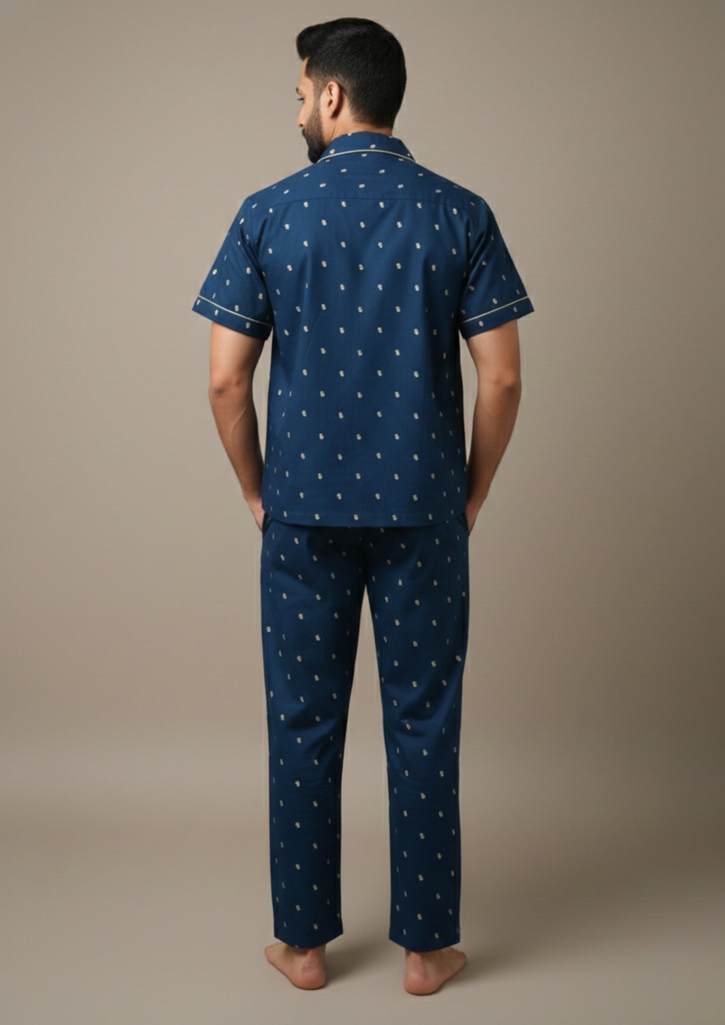 The subtle all-over print adds understated character, while contrast piping along the collar, placket, and sleeves delivers a sharp, tailored finish. Paired with straight-fit pajama pants, this night suit offers ease of movement without compromising on style—perfect for restful nights, relaxed mornings, and elevated lounging.