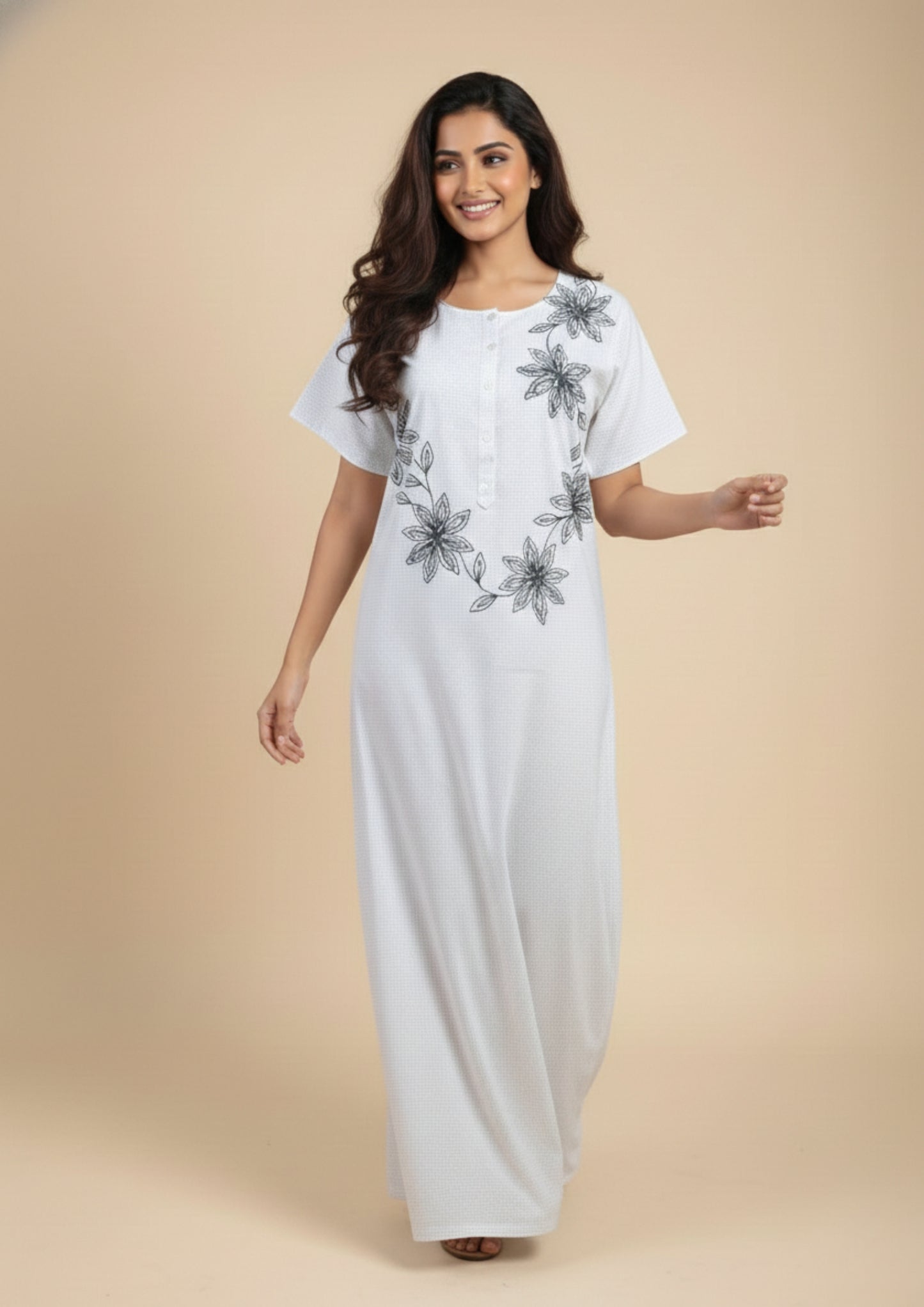 The Noir Bloom Embroidered Night Dress is designed for women who appreciate quiet luxury and understated elegance. Crafted in a soft, breathable fabric, this night dress drapes gently over the body, offering a feeling of lightness and comfort through every moment of wear.