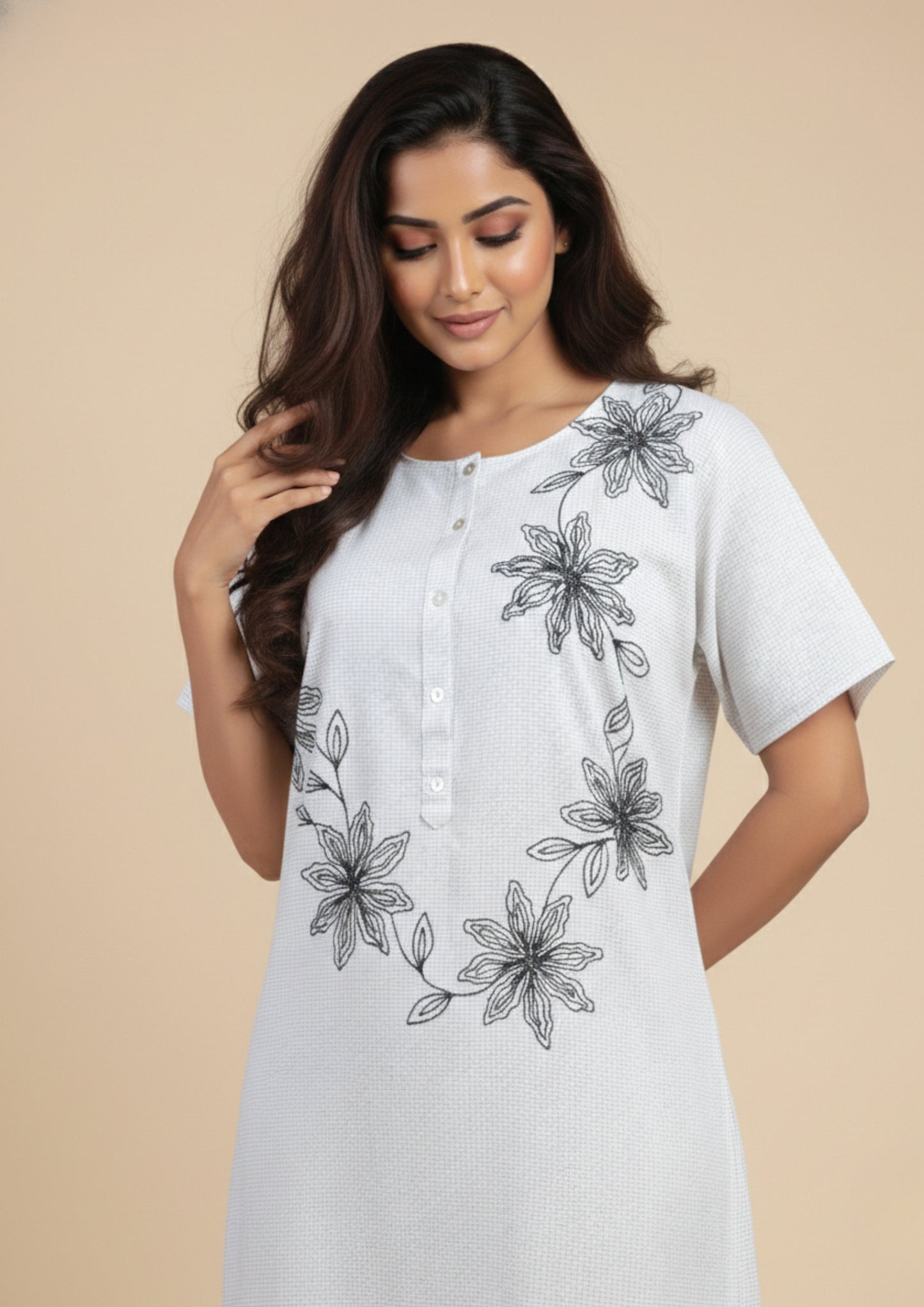 The highlight lies in its refined black floral embroidery, delicately placed to create a subtle statement without overwhelming the design. The clean round neckline with button detailing adds a touch of classic charm, while the straight silhouette ensures ease of movement and a flattering fit for all body types.
