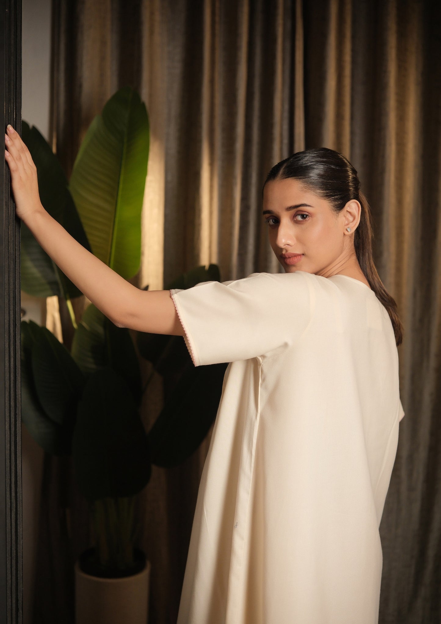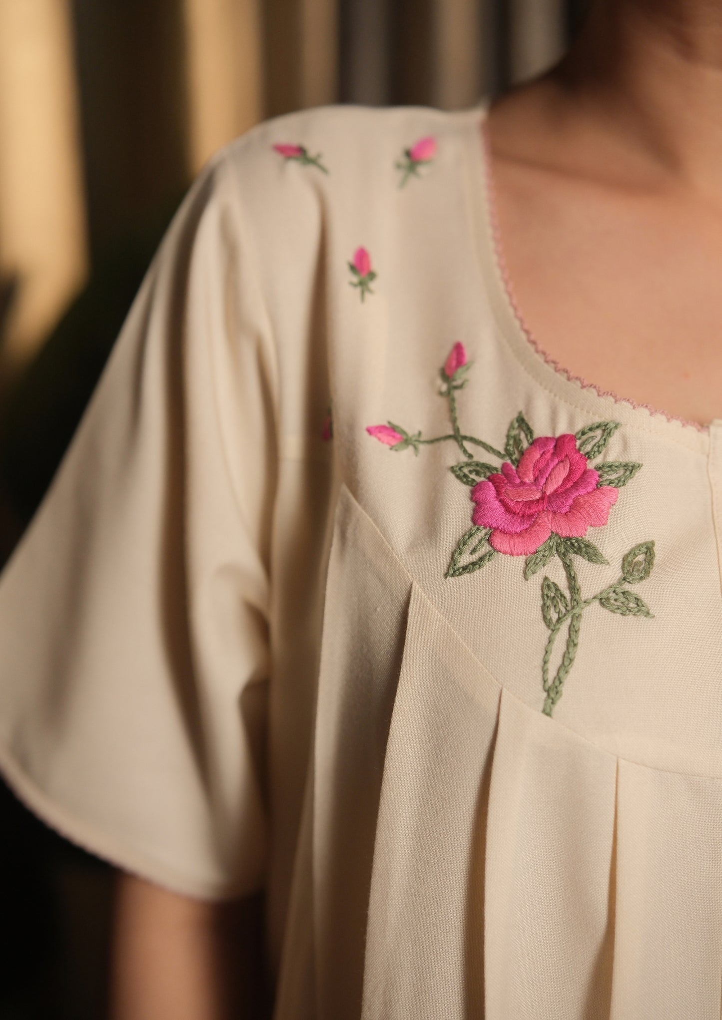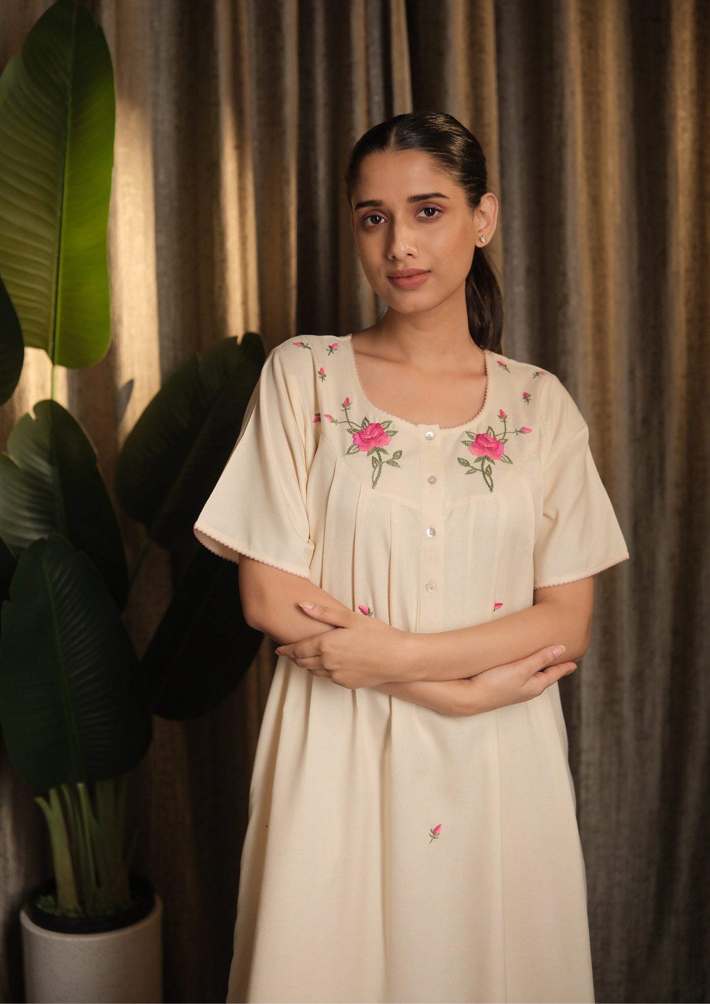 Experience the softness of serenity with our Blush Petals Hand-Embroidered Nighty — a luxe, airy silhouette crafted for effortless comfort. Designed in a soothing cream tone, this nighty features delicate hand-embroidered floral motifs across the neckline and scattered buds along the body, adding a refined feminine charm. The relaxed round neck, soft pleating, and flowy drape ensure you stay comfortable through warm days and restful nights. Perfect for women who appreciate elegance even in their everyday unwind moments.