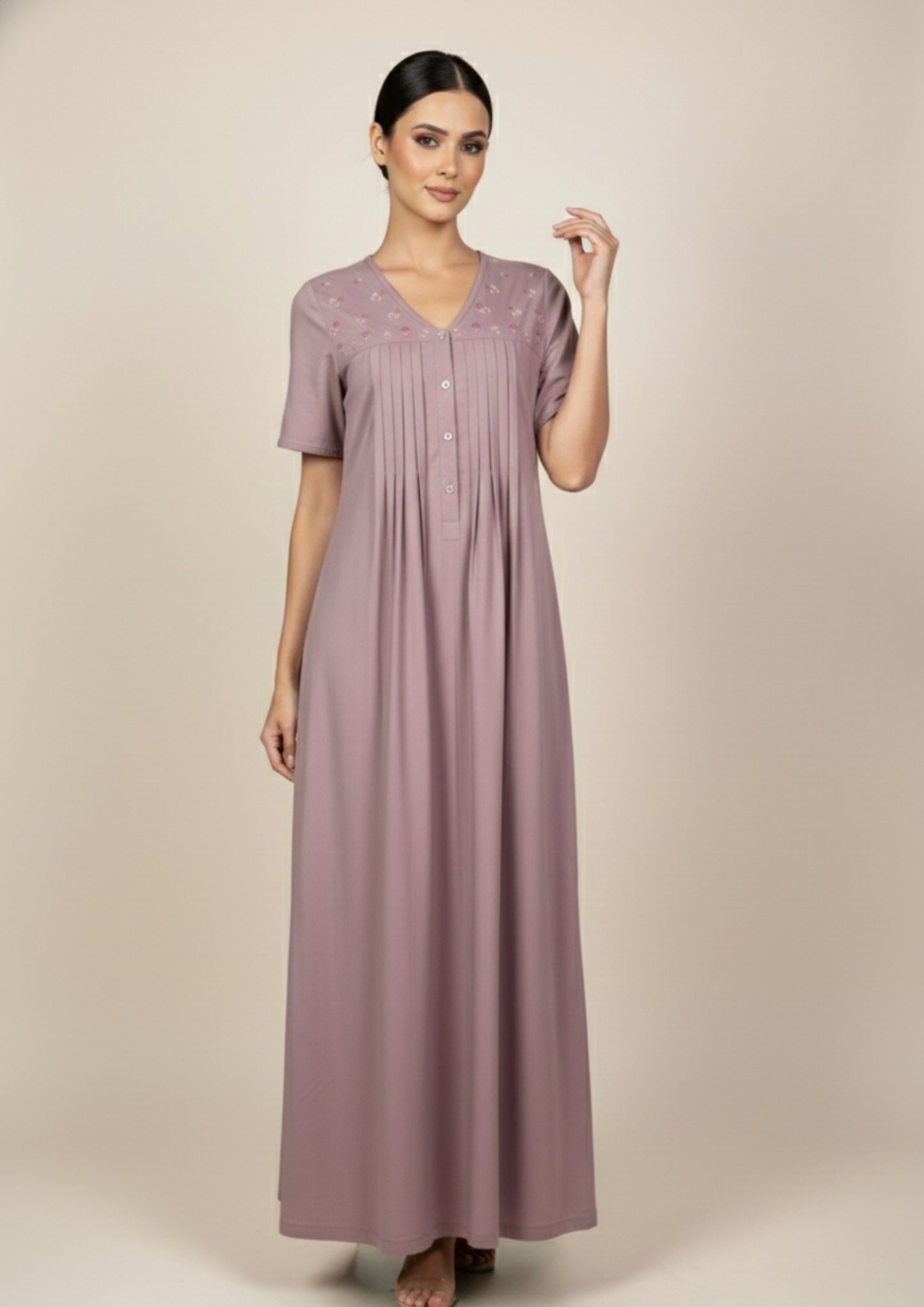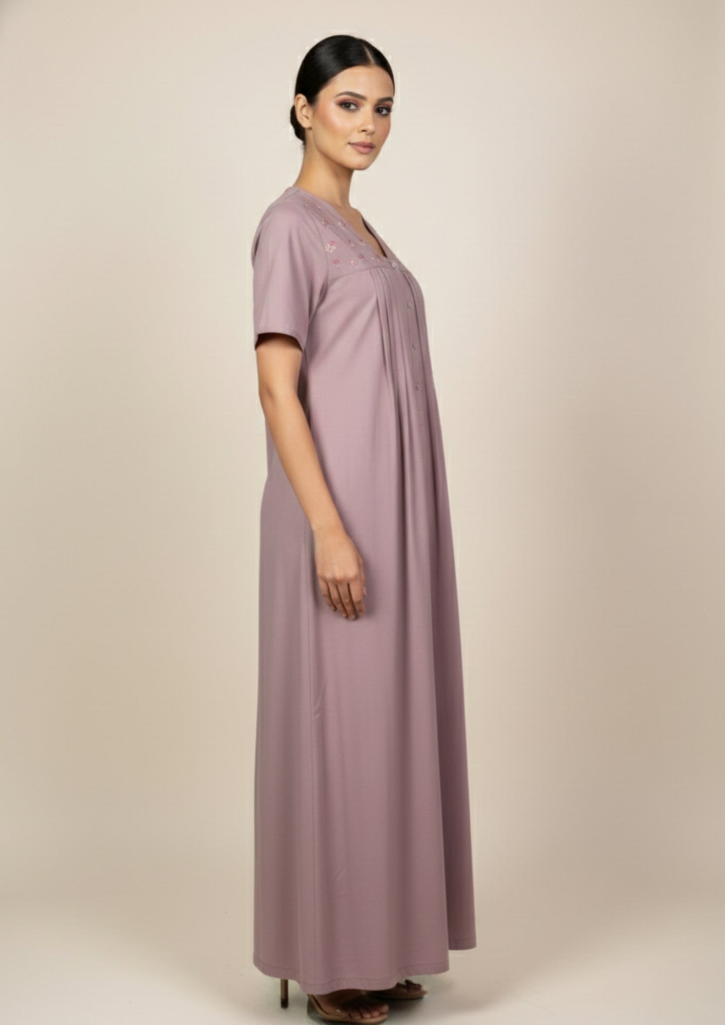 Woven in exquisite 100% Spun Cotton, this nighty is a testament to refined taste. The machine embroidery details trace across the fabric with precision, while the soft and structured composition creates an embrace of pure indulgence. A piece designed for those who understand that true luxury lies in the seamless blend of comfort and grace.