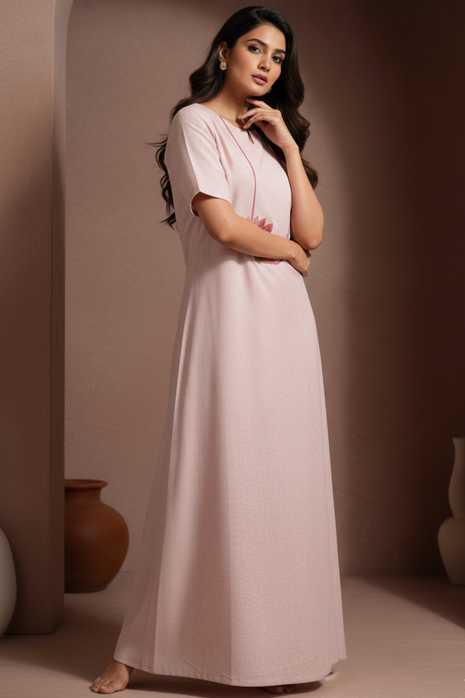 Make a statement in this beautifully hand-embroidered nighty, where confident color meets gentle comfort. The pink-red hue brings warmth and personality, while the delicate embroidery adds a touch of artisanal grace. Whether you're lounging or winding down for the night, this piece wraps you in cozy elegance with a hint of bold sophistication.