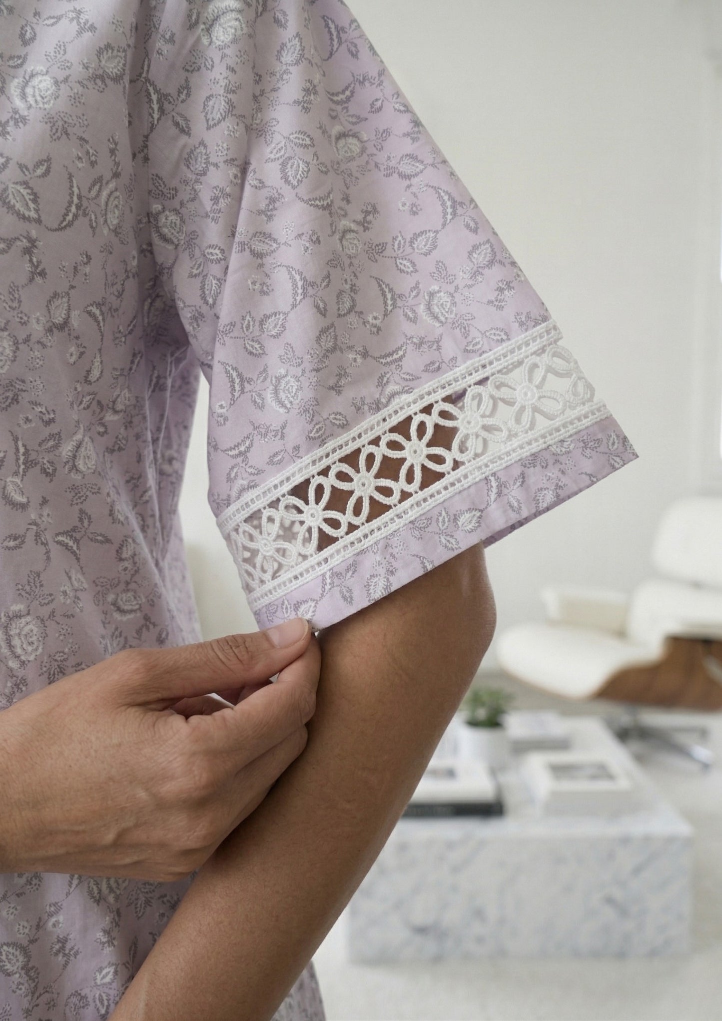 A soothing lavender printed nighty elevated with delicate lace accents, designed for effortless elegance and comfort.