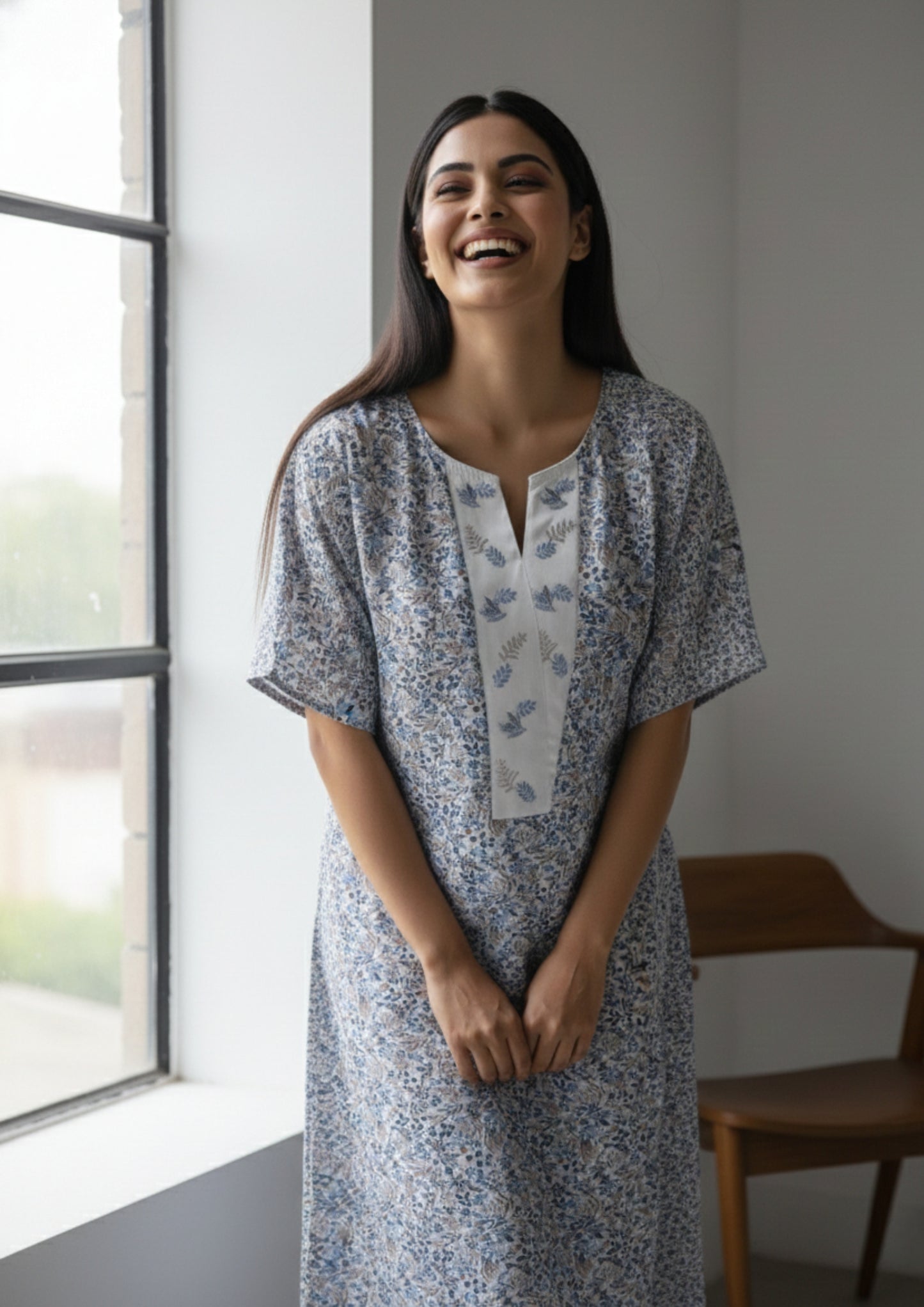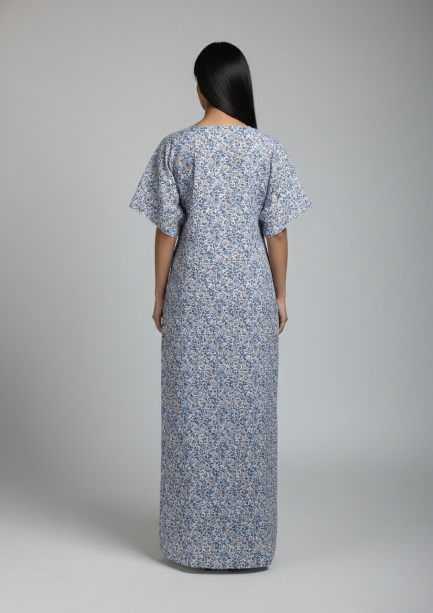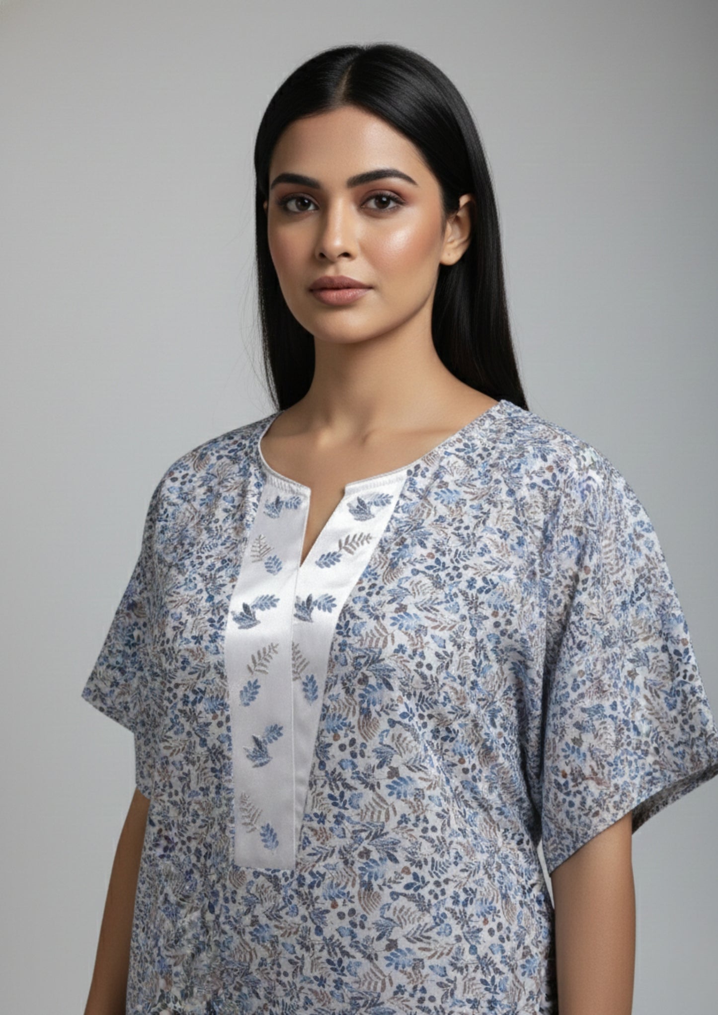 The Willow Satin Panel Nighty blends subtle elegance with everyday ease. Designed in a delicate all-over print, this full-length nighty is elevated by contrast satin detailing along the neckline panel, adding a refined focal point to its soft silhouette. The split V-neck and structured front placket enhance its polished appeal, while the relaxed cut and short sleeves ensure effortless movement and comfort. Ideal for restful nights and slow mornings, this printed nighty delivers timeless style with a touch of satin sophistication.