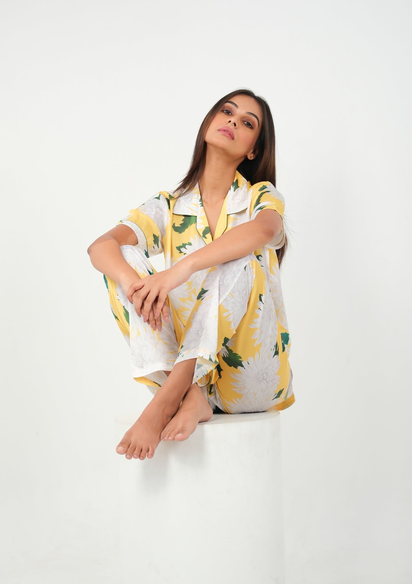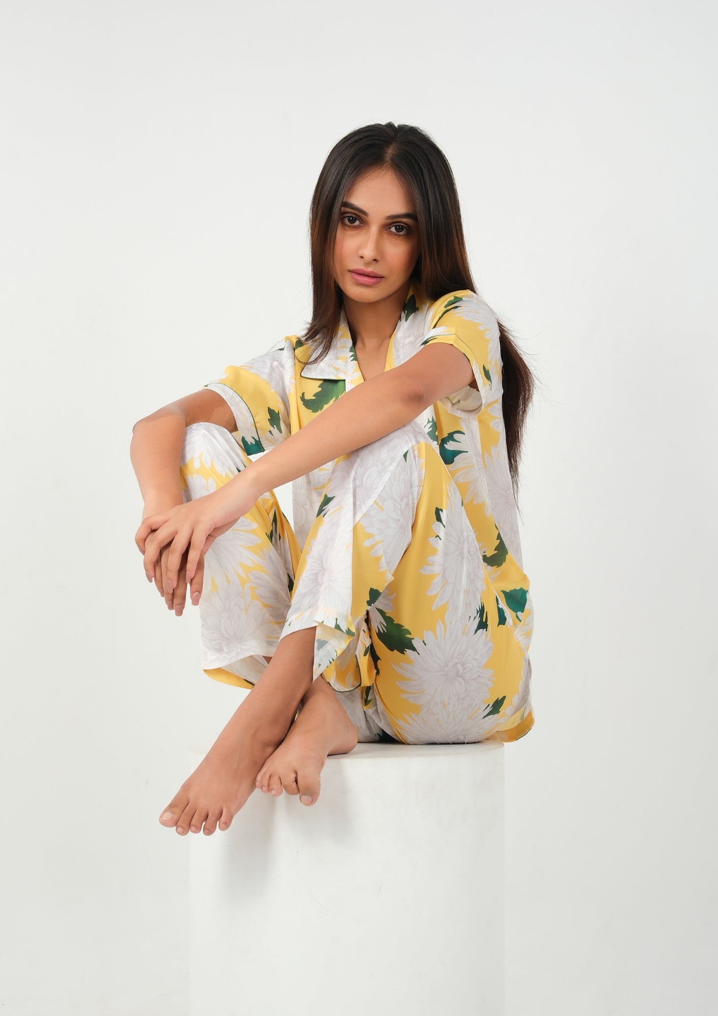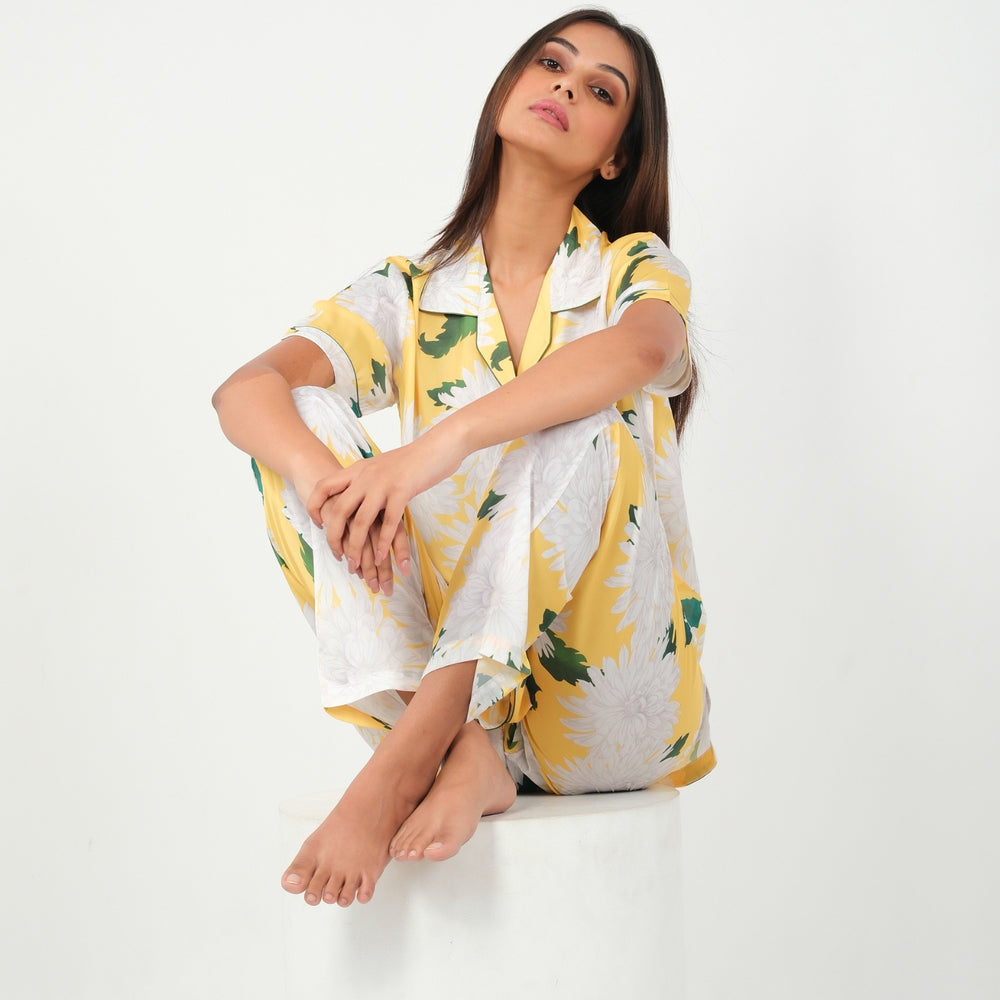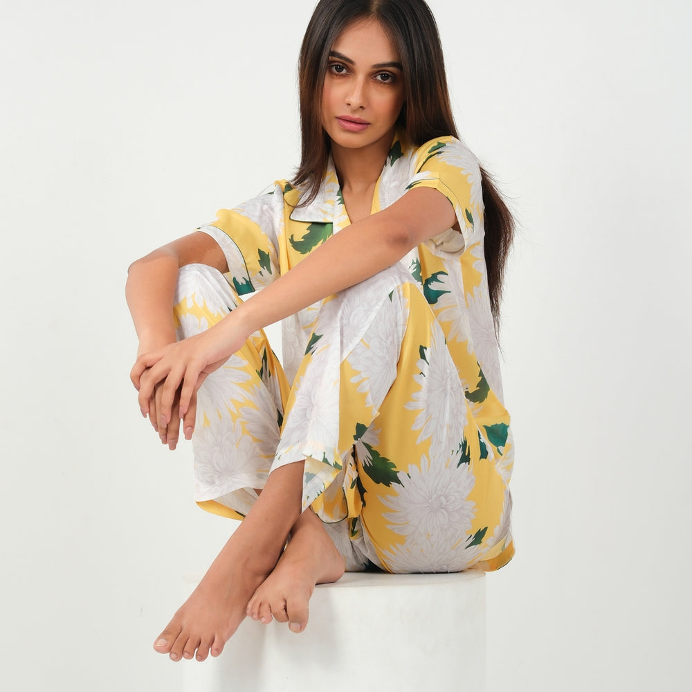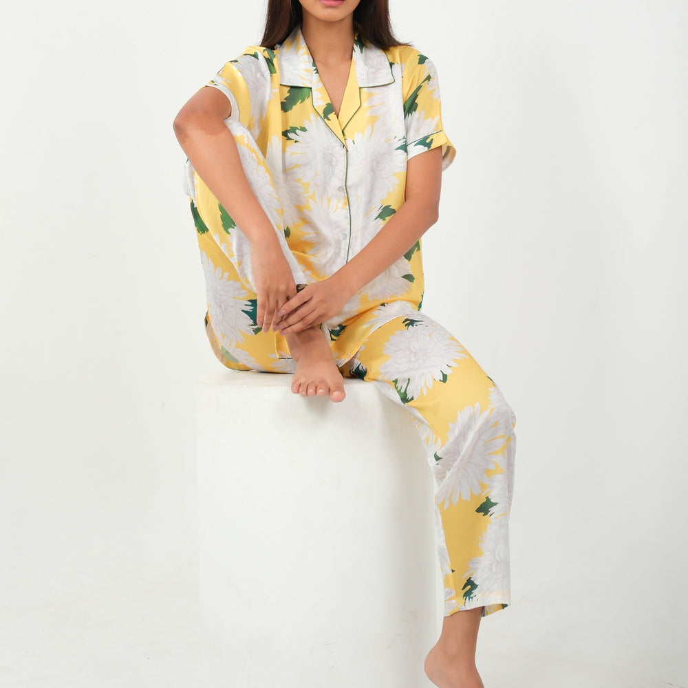 Slip into Sunlit Bloom, where comfort meets radiance. Crafted in premium satin, this floral night suit brings a hint of glamour to your nightly ritual. The golden-yellow hue captures warmth and joy, while the crisp white blooms add a soft feminine charm.