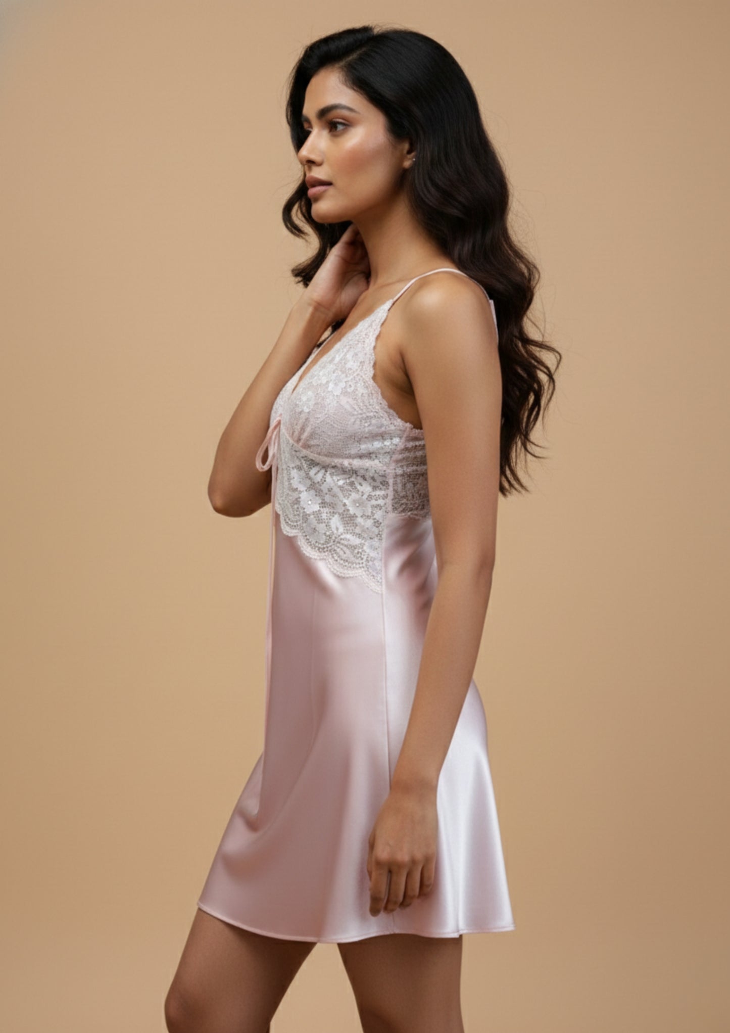 The inner gown features intricate lace detailing that softly contours the body, while the robe drapes beautifully with a self-tie satin belt, adding grace and allure in every movement. Light, fluid, and indulgently soft, this set is perfect for wedding nights, honeymoon mornings, and every special moment in between.