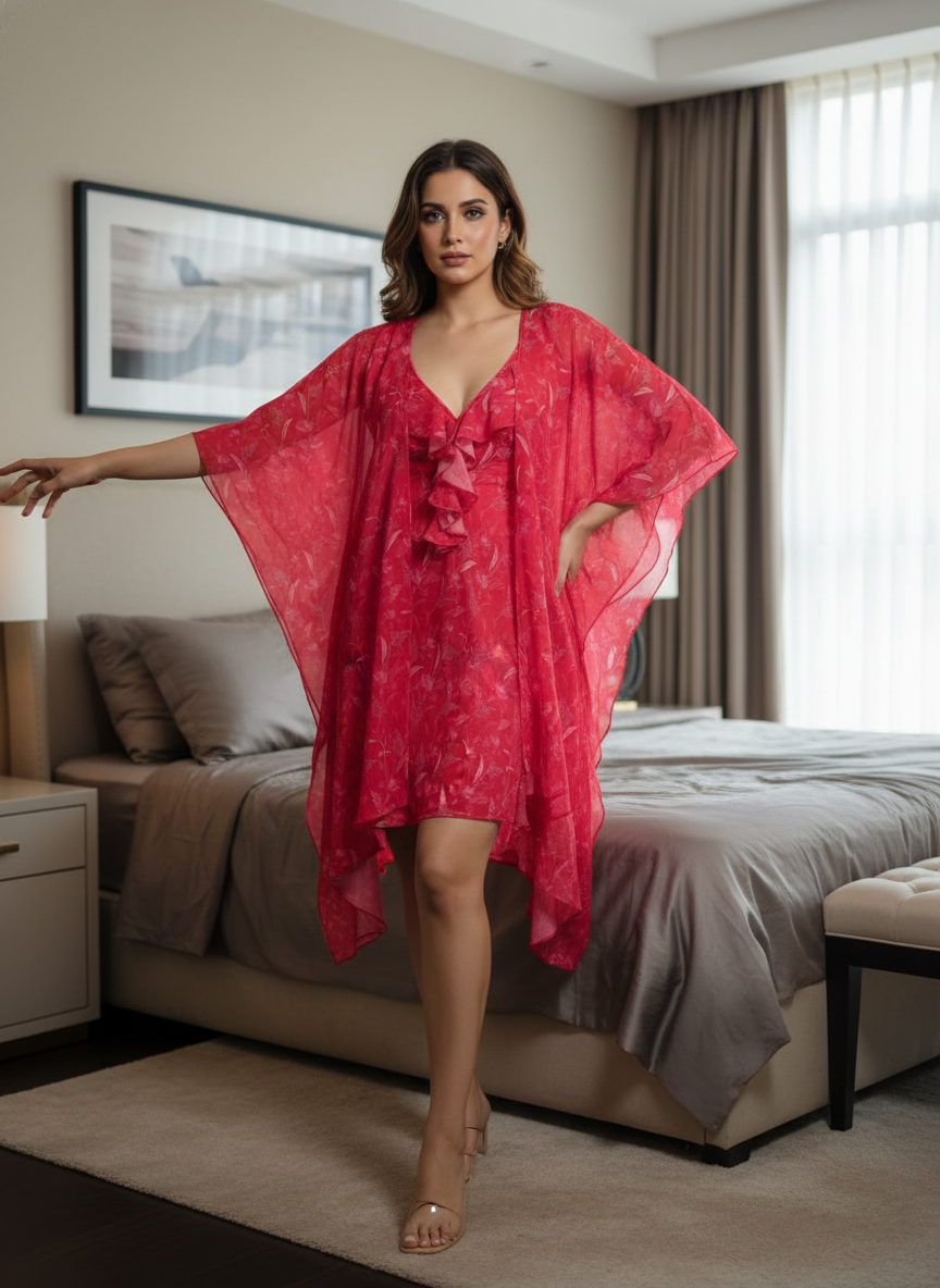 Rendered in a passionate red hue with delicate prints, this babydoll gown features a flattering wrap-inspired neckline and a softly gathered waist that defines without restricting. The sheer, fluid fabric moves gracefully with every step, creating an understated yet undeniably sensual look.