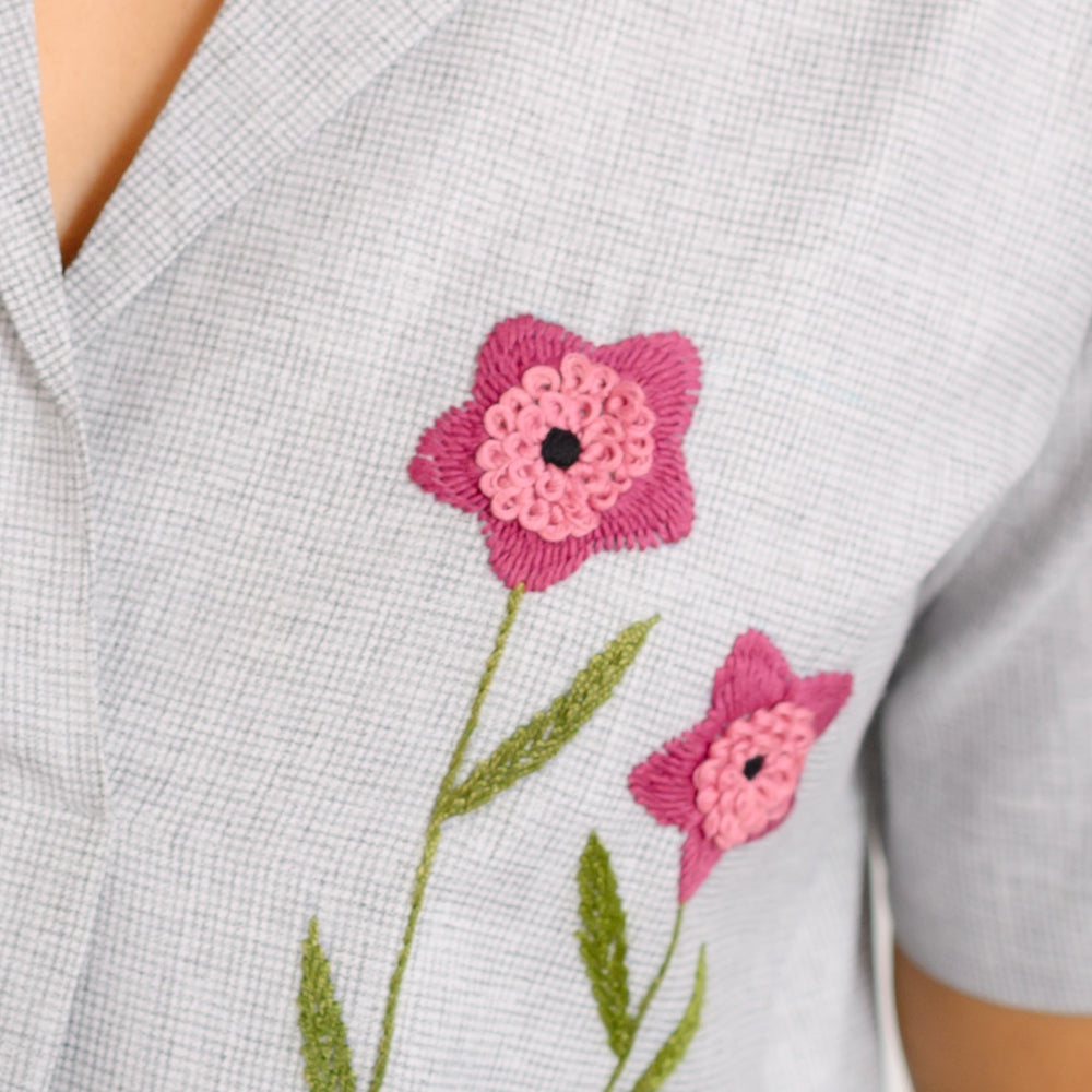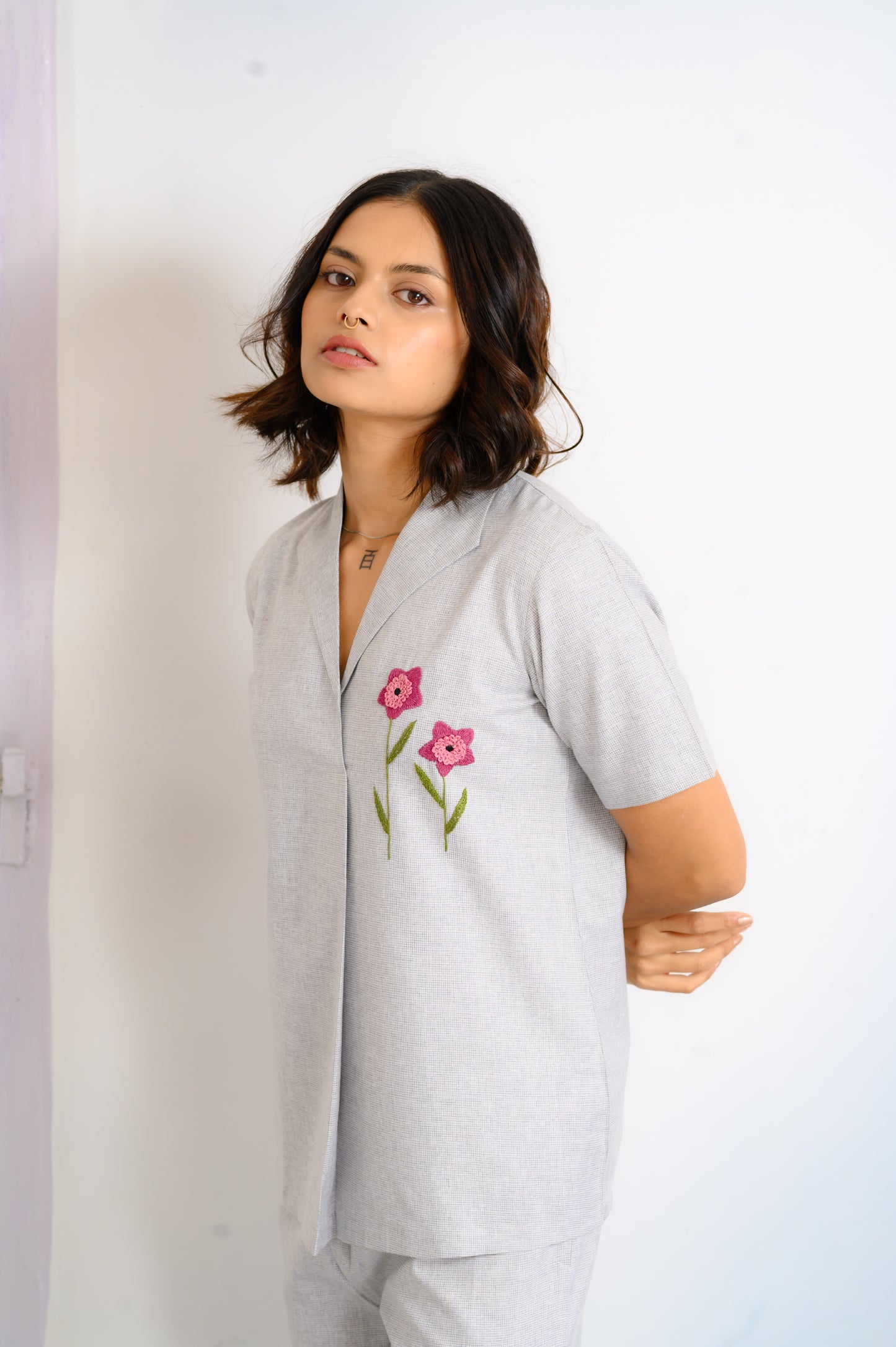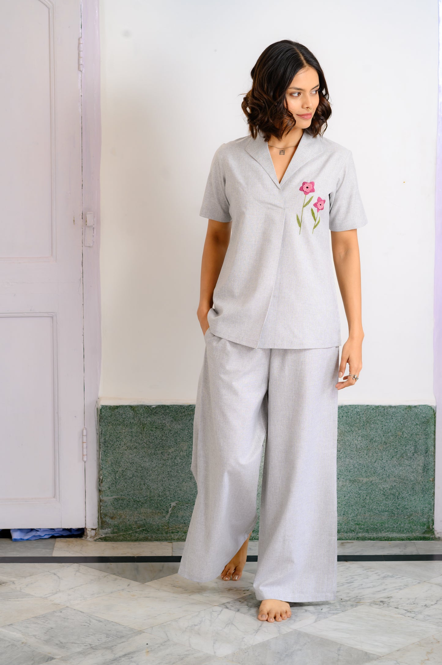 Made from breathable cotton, this grey Night-Suit is your go-to for everyday comfort with a touch of handcrafted charm. The shirt features a relaxed collar and delicate hand embroidery in pink florals, while the matching bottoms offer a comfortable fit for lounging, travel, or casual wear.