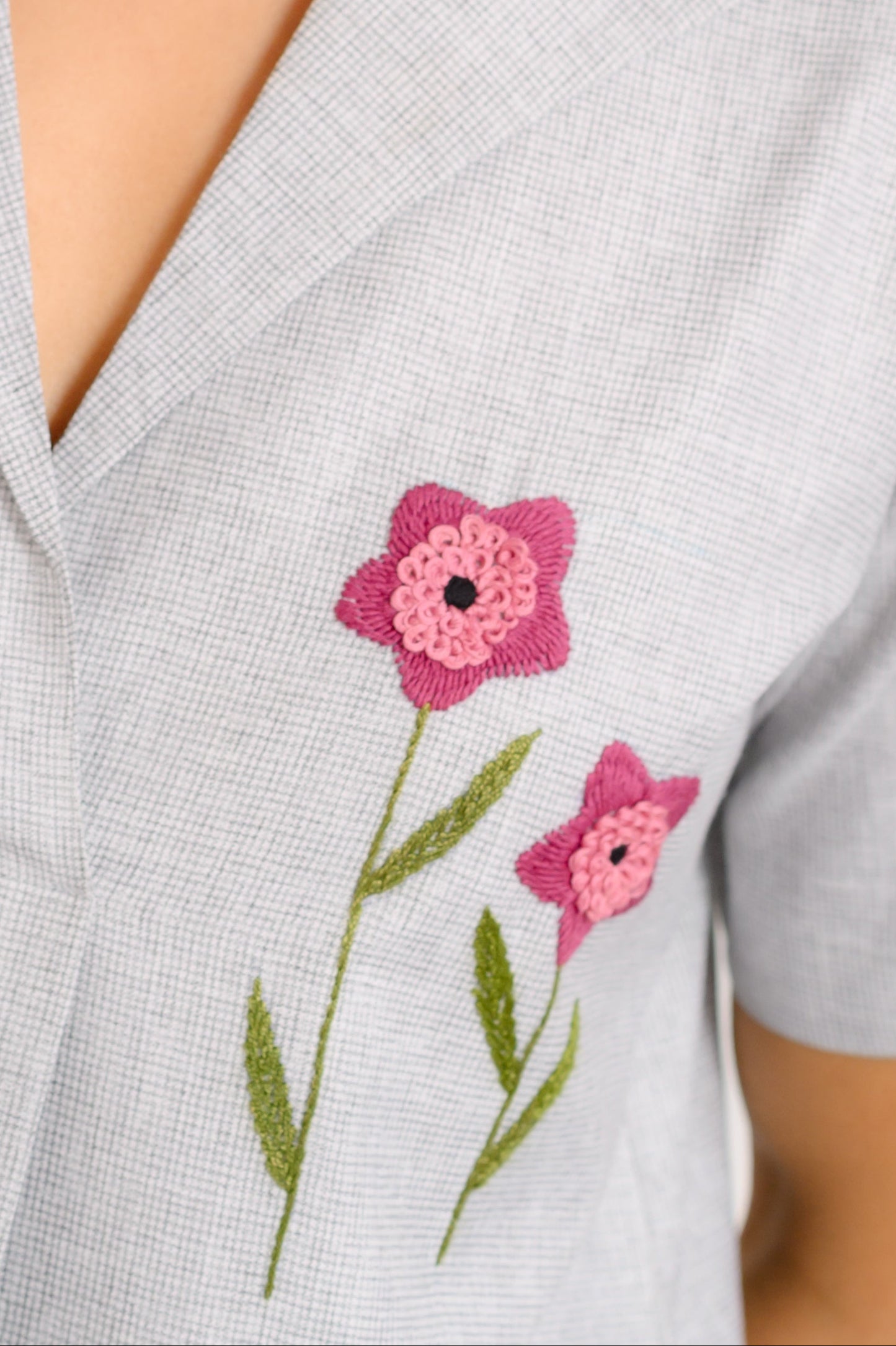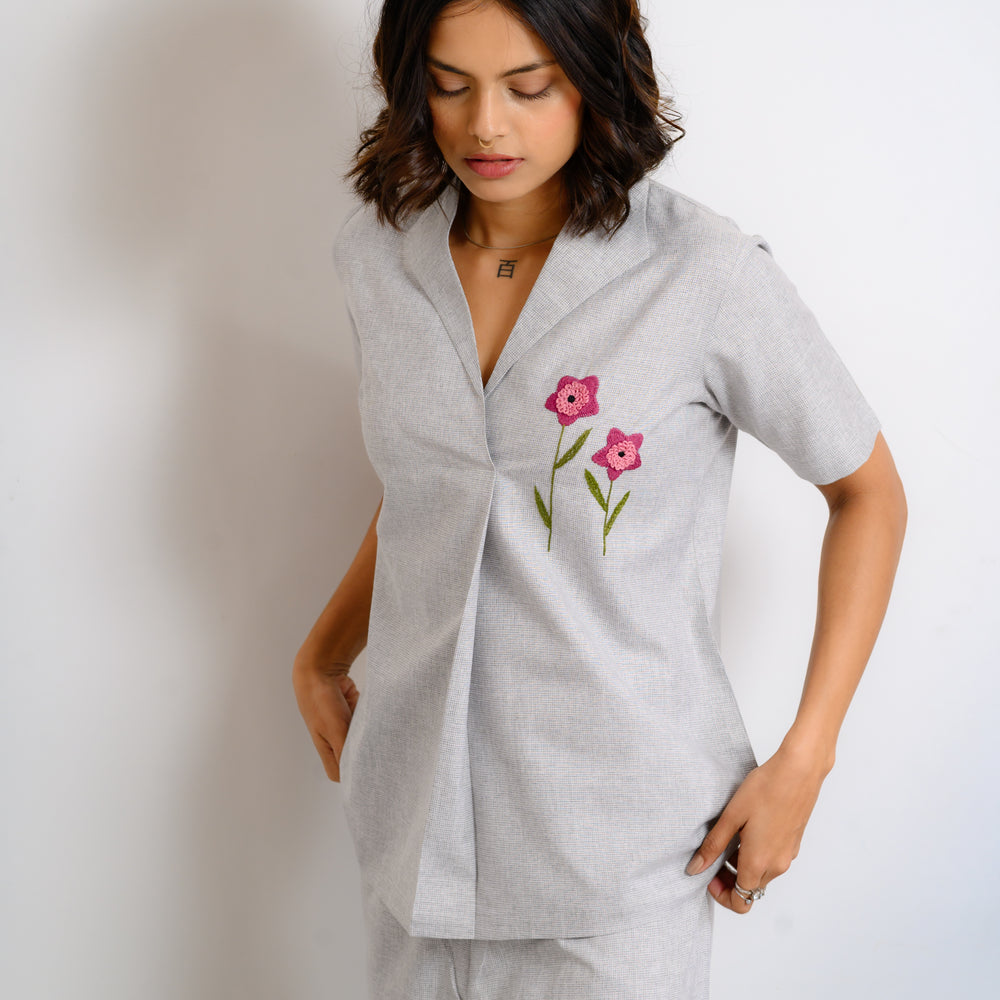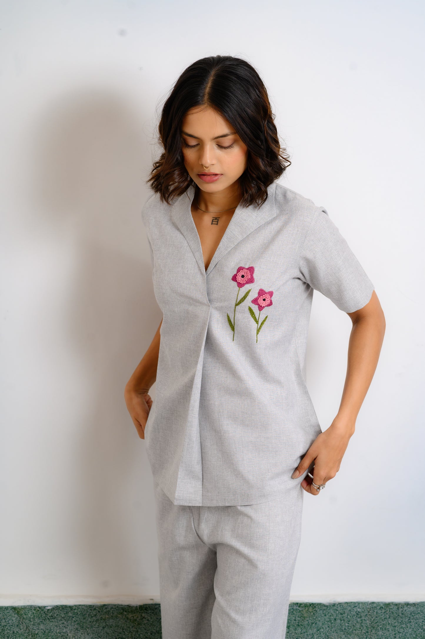 Made from breathable cotton, this grey Night-Suit is your go-to for everyday comfort with a touch of handcrafted charm. The shirt features a relaxed collar and delicate hand embroidery in pink florals, while the matching bottoms offer a comfortable fit for lounging, travel, or casual wear.