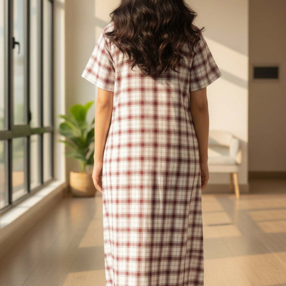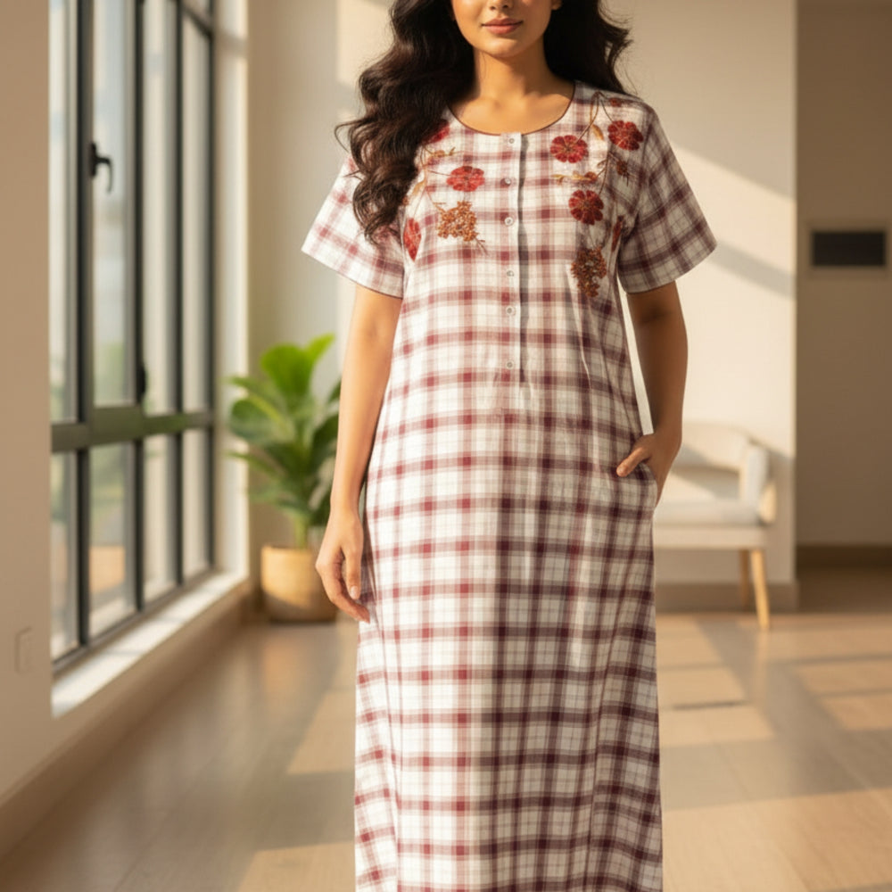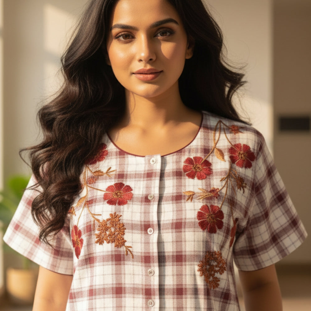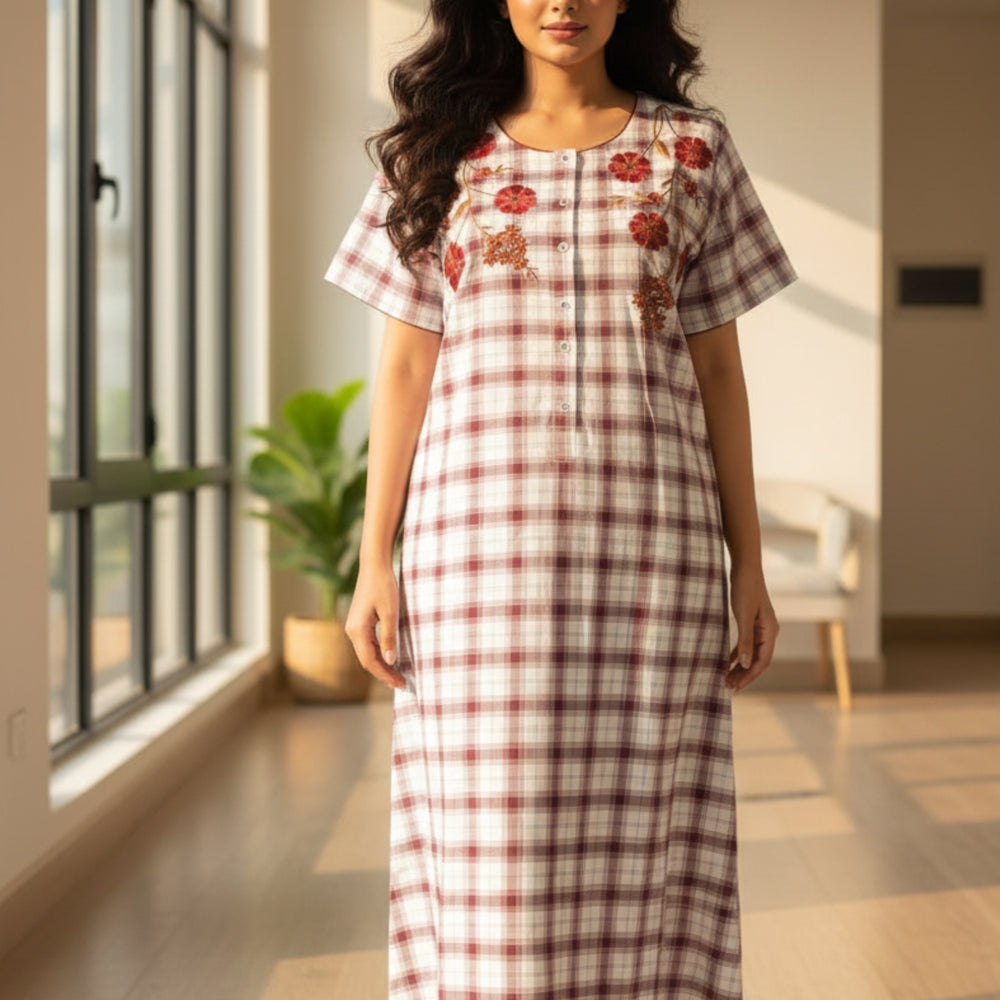 The Crimson Checks Nighty beautifully blends effortless comfort with refined elegance. Designed in a soft maroon checkered pattern, it carries hand-embroidered floral motifs that add a luxurious artisanal touch to your everyday lounging.