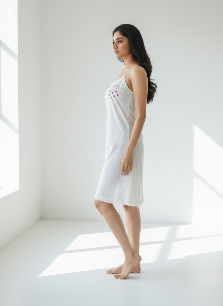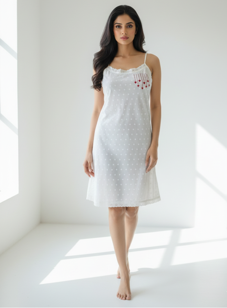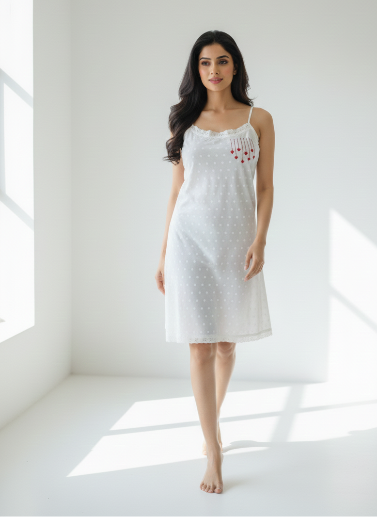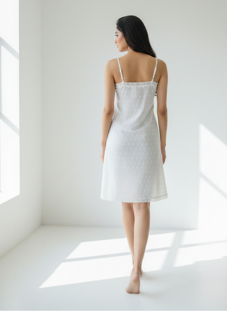 Simple, soft, and quietly beautiful — the Ivory Whisper Sleep Dress is designed for nights when comfort matters most. Crafted in a breathable polka-dot fabric with a gentle fall, this sleep dress feels light against the skin while offering a graceful silhouette.