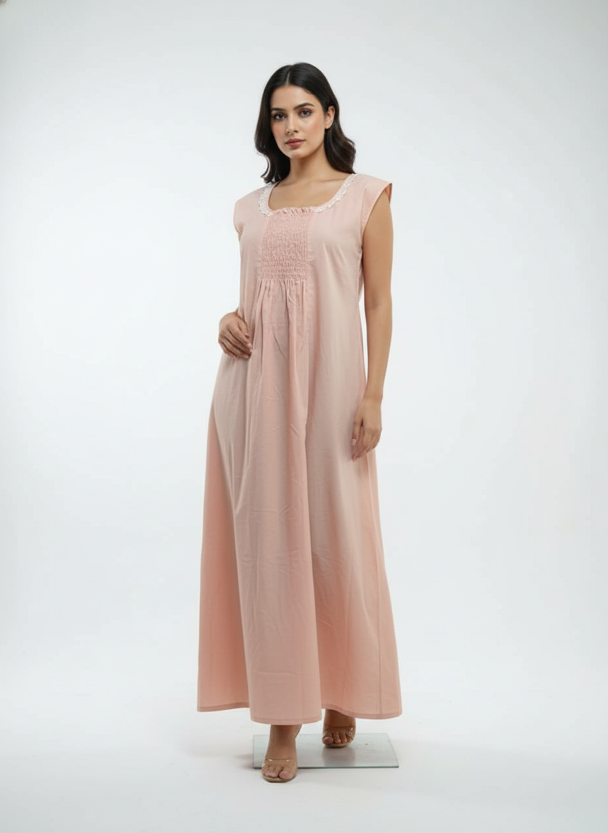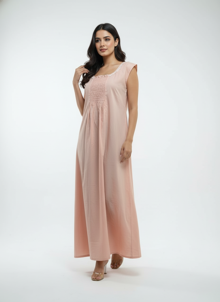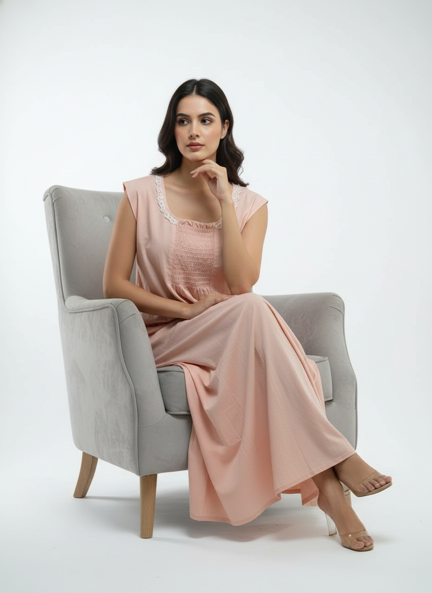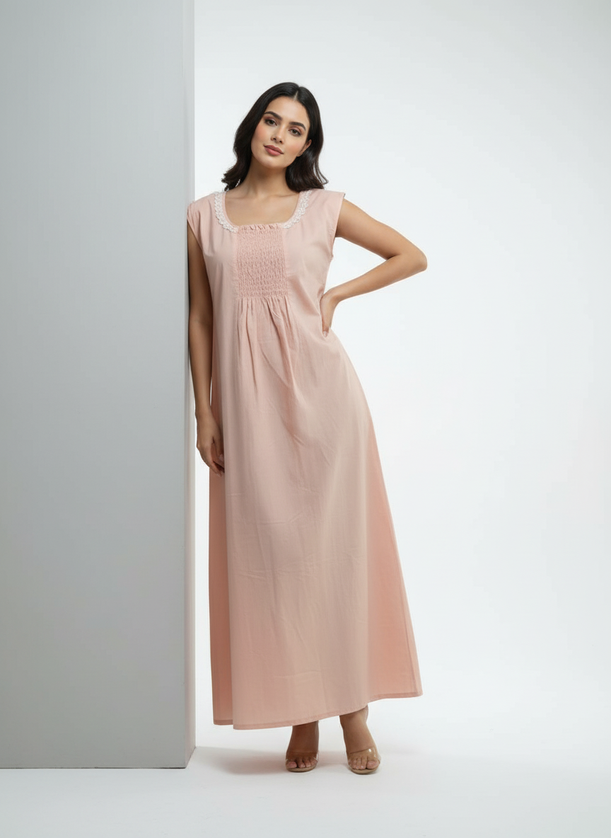 Designed for effortless comfort, the Soft Blush Smocked Nighty is your perfect everyday essential. Featuring a gently smocked yoke that allows natural movement and a soft A-line fall, this nighty feels light, airy, and incredibly comfortable against the skin.