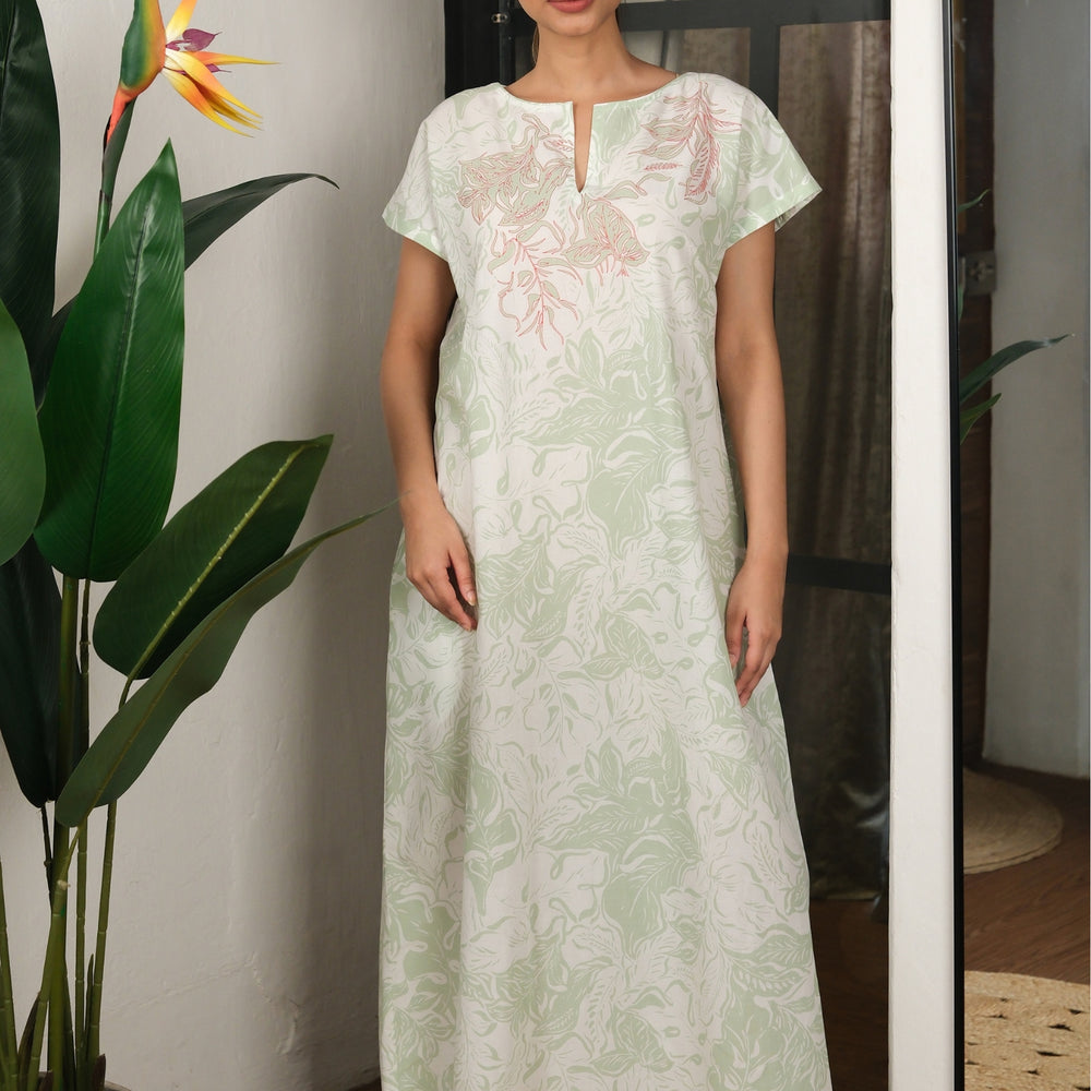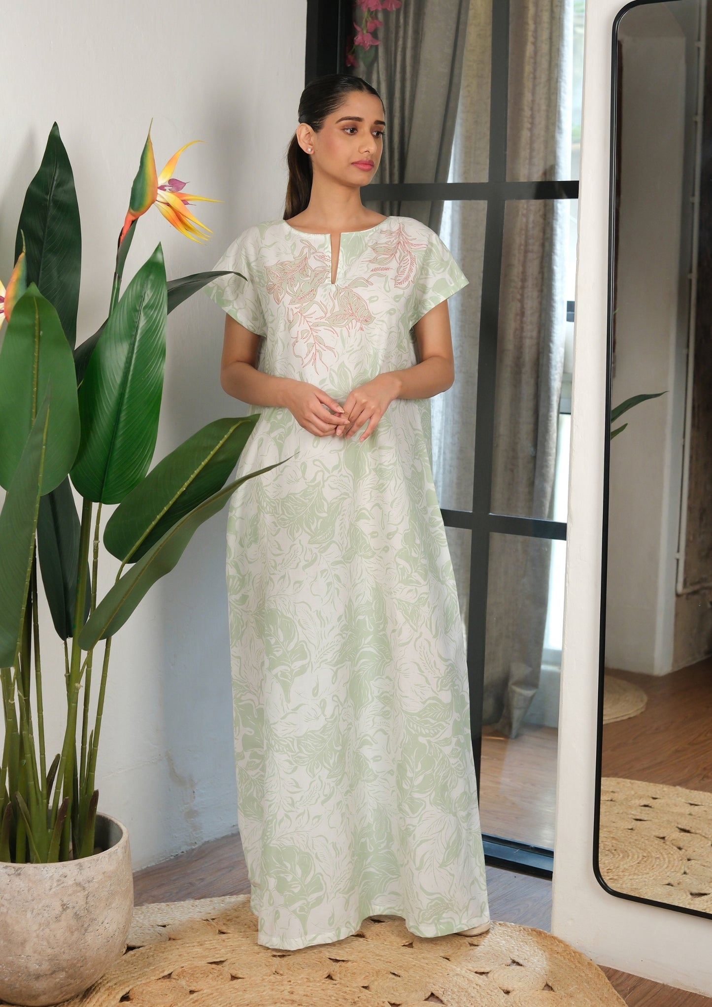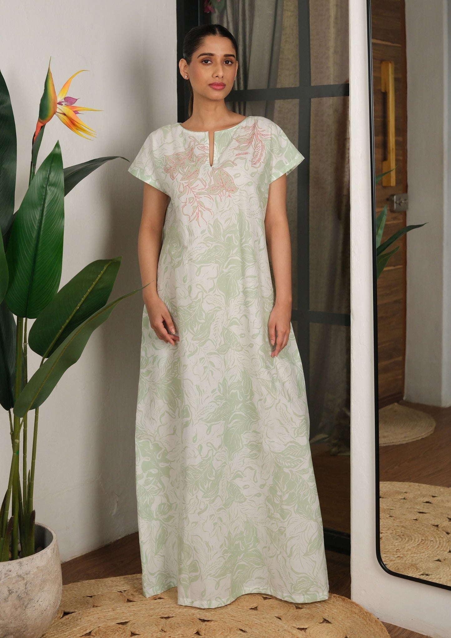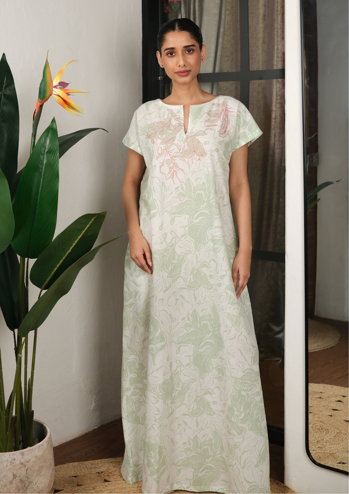The Whispering Fern Nighty brings together the soothing calm of pastel green foliage with subtle hand embroidery that feels like poetry on fabric.