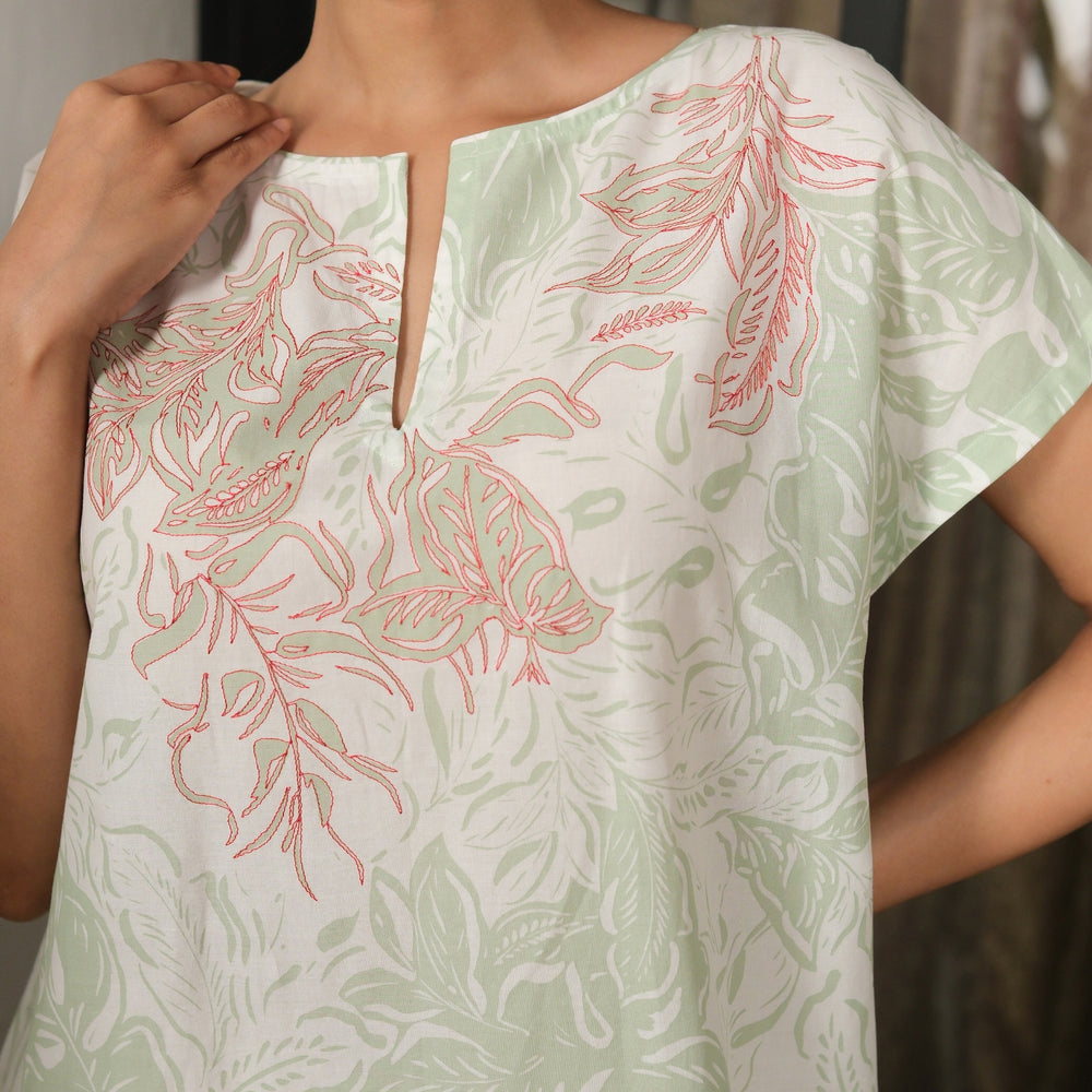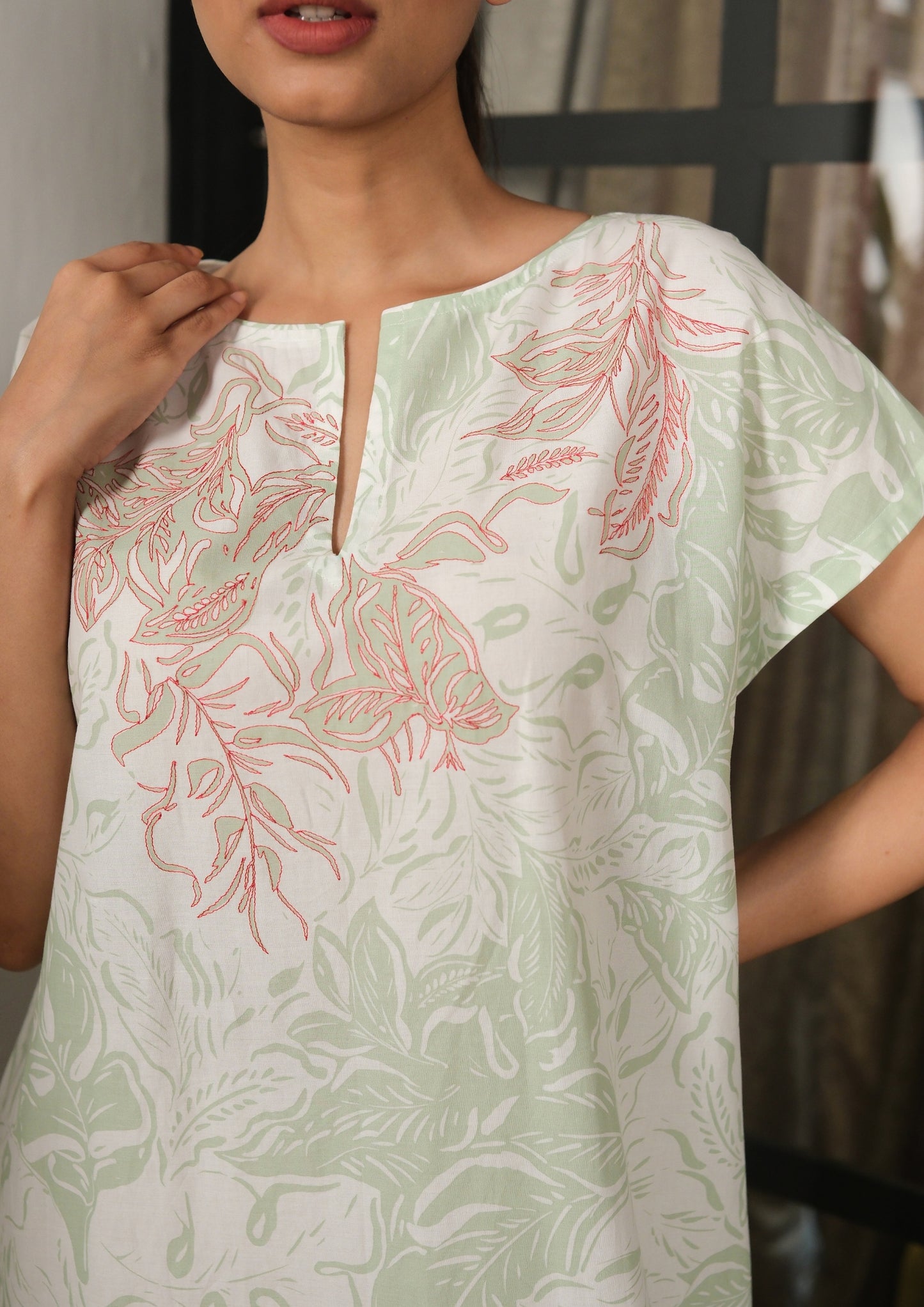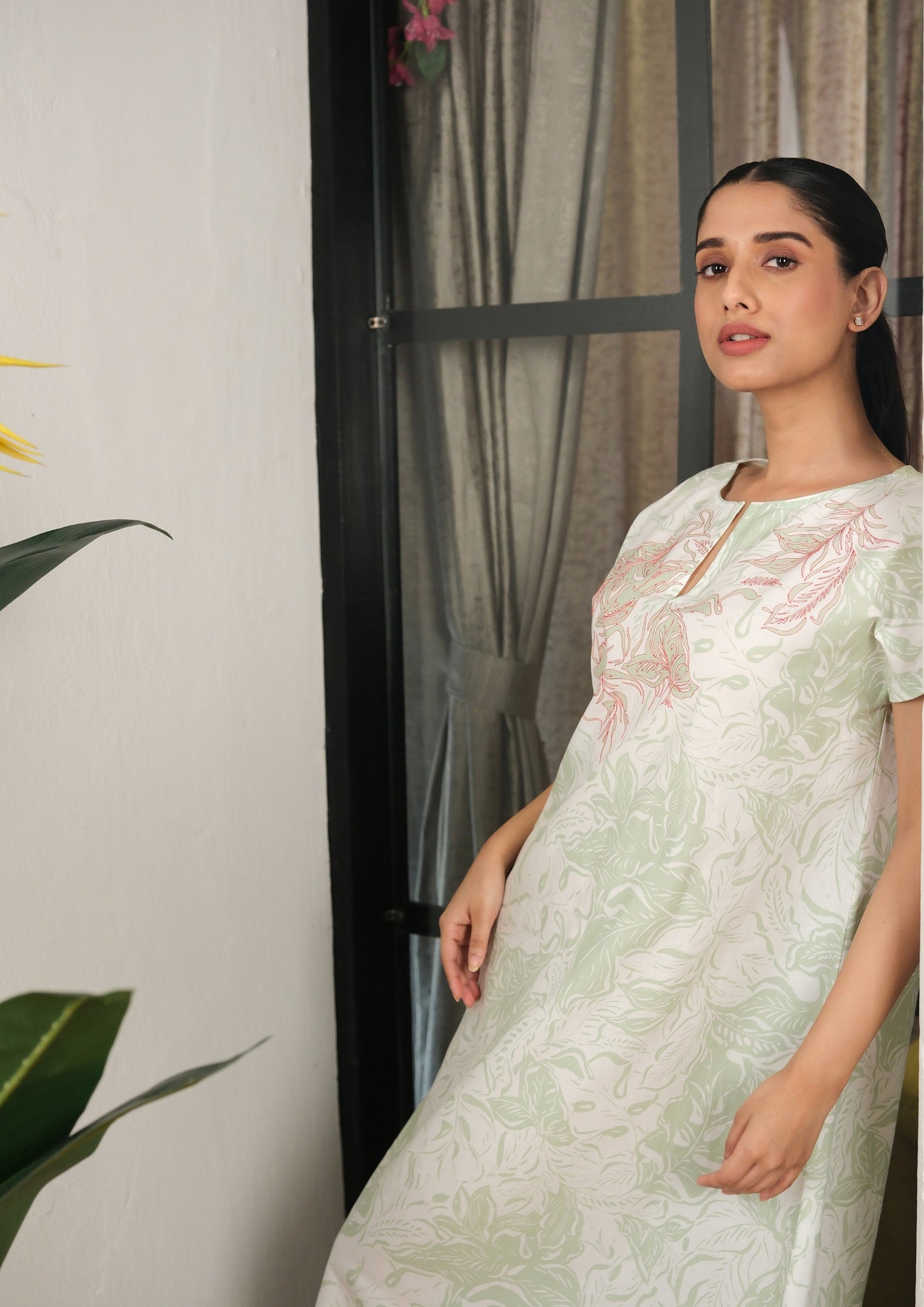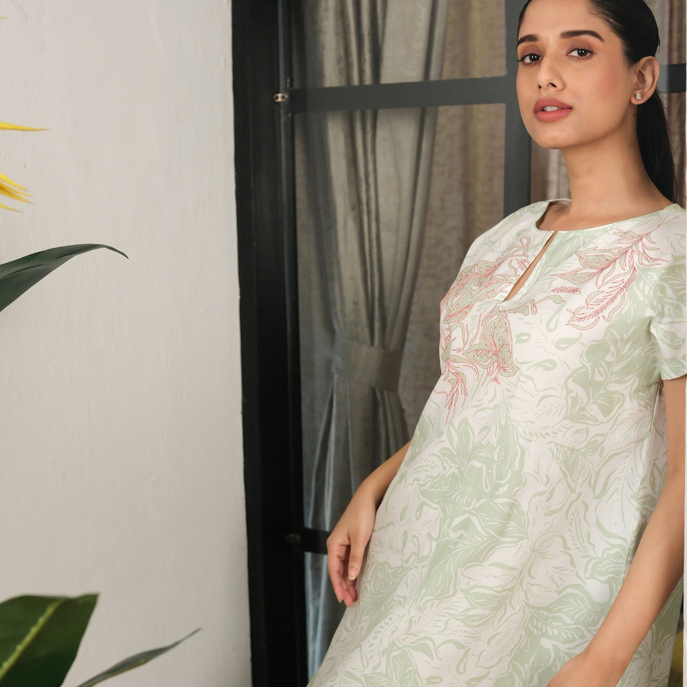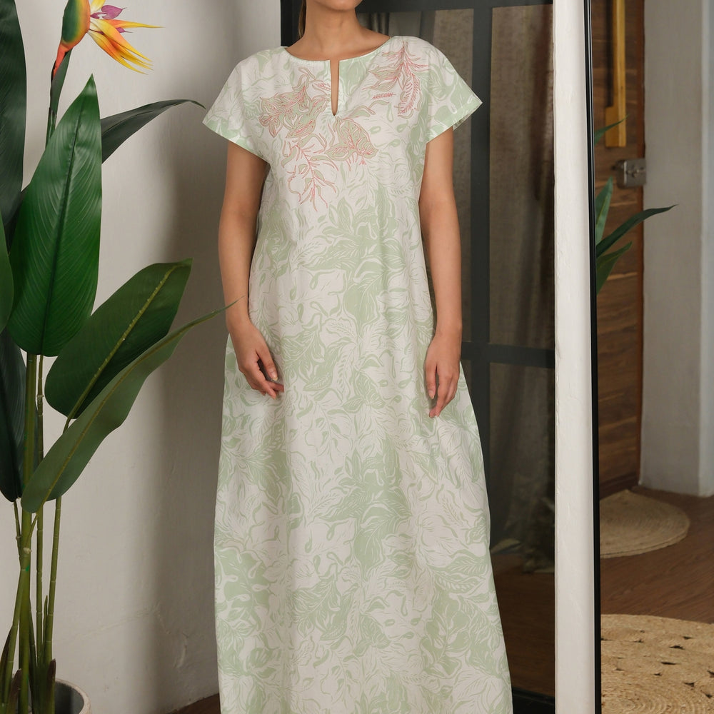 The Whispering Fern Nighty brings together the soothing calm of pastel green foliage with subtle hand embroidery that feels like poetry on fabric.