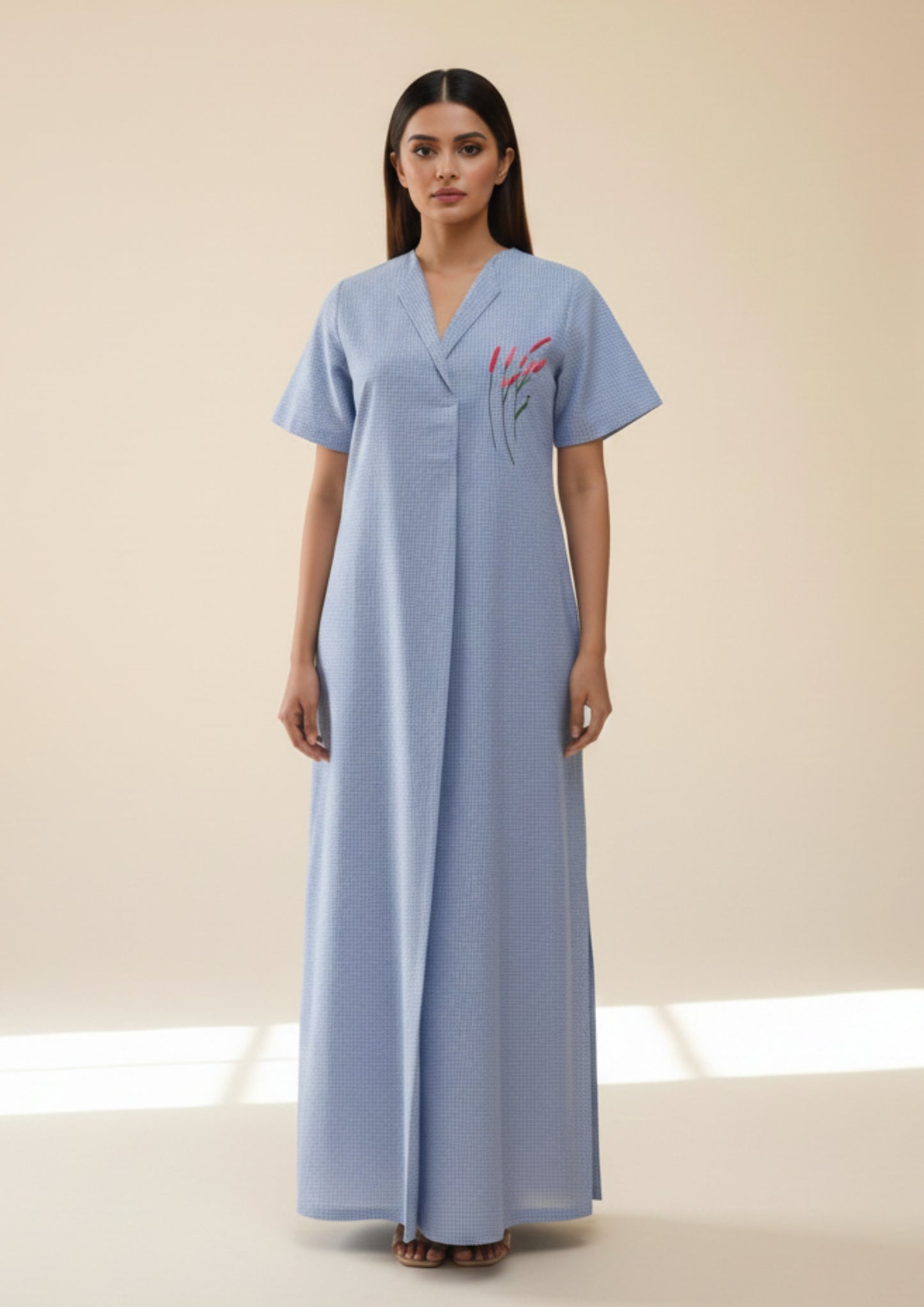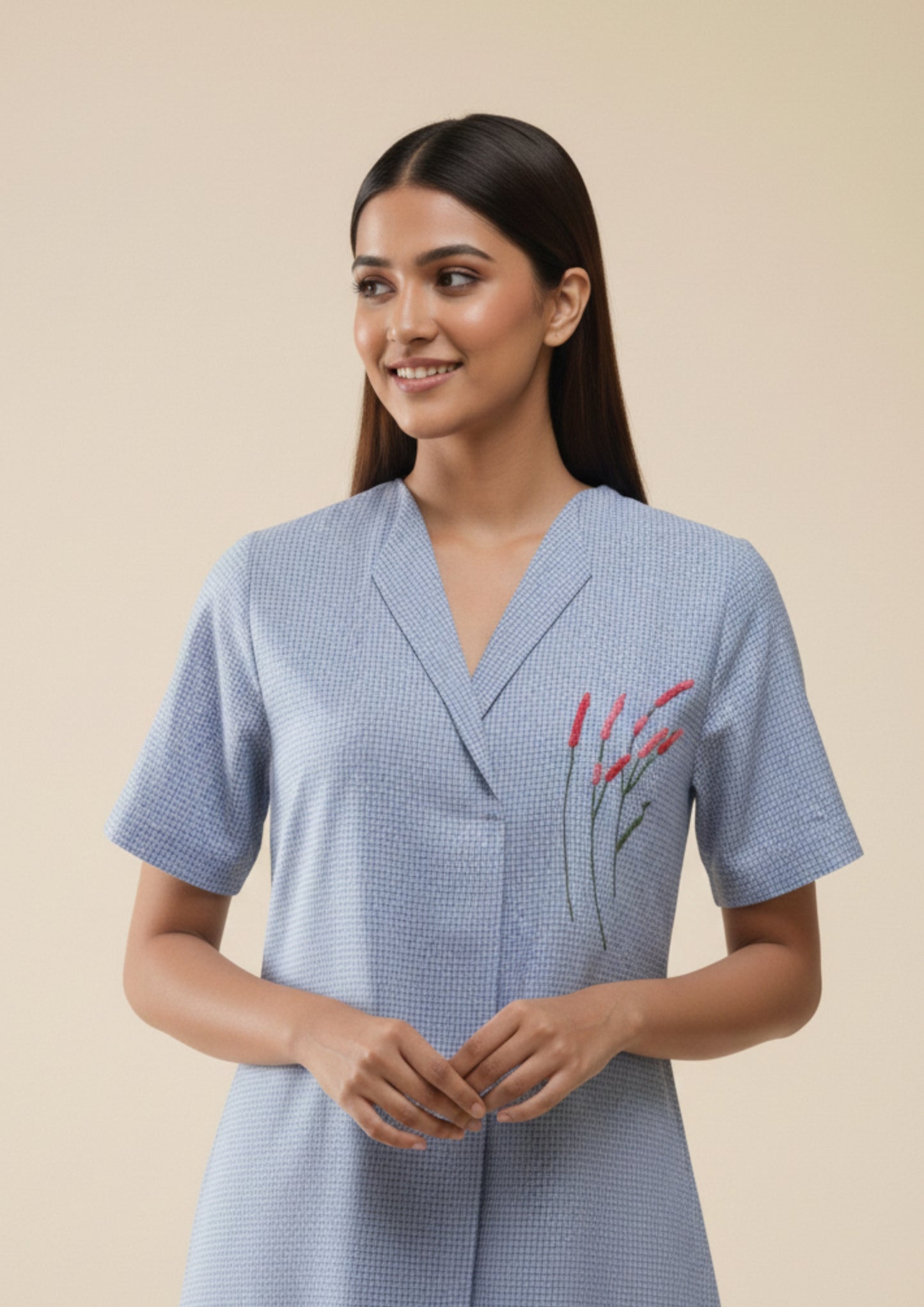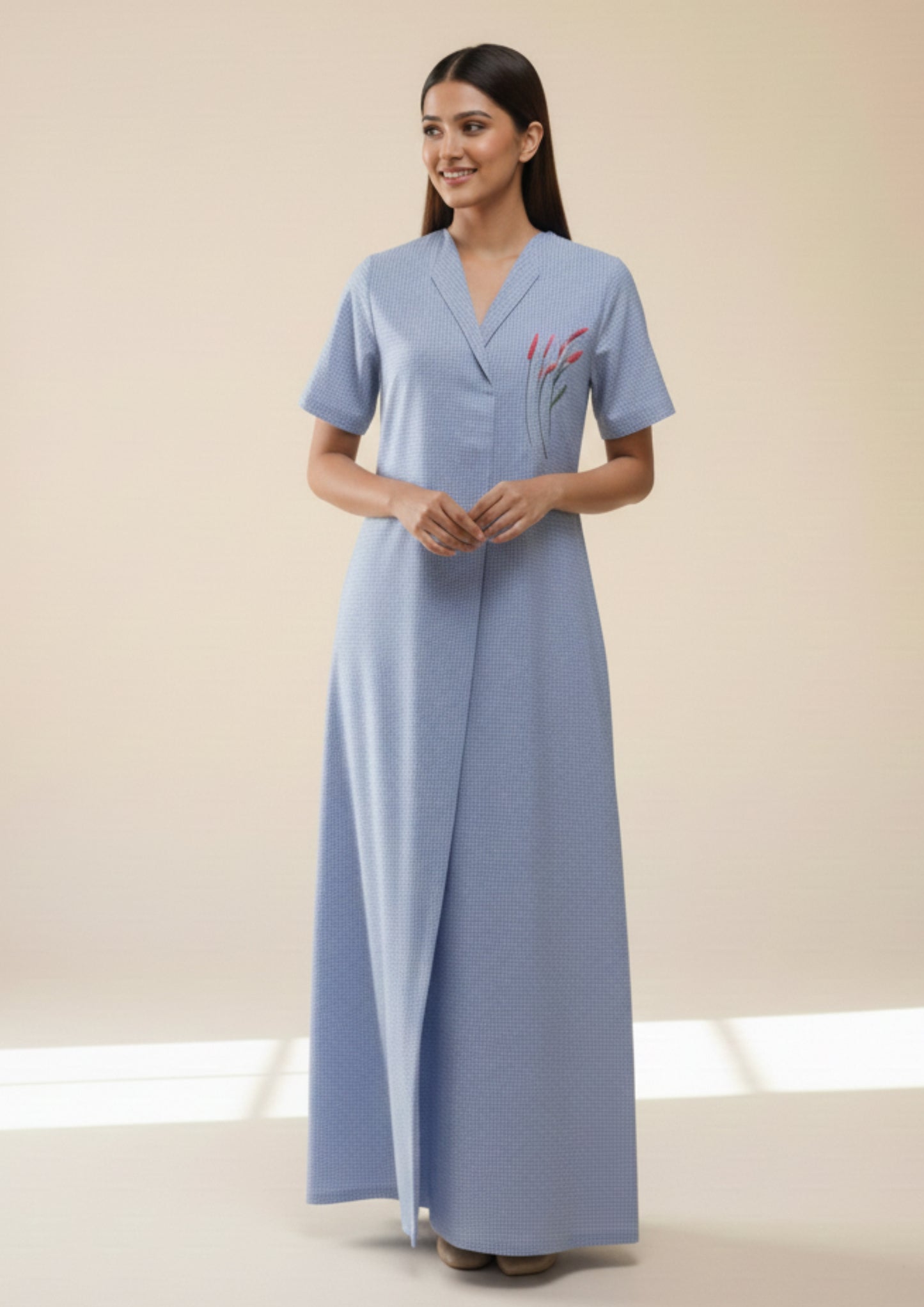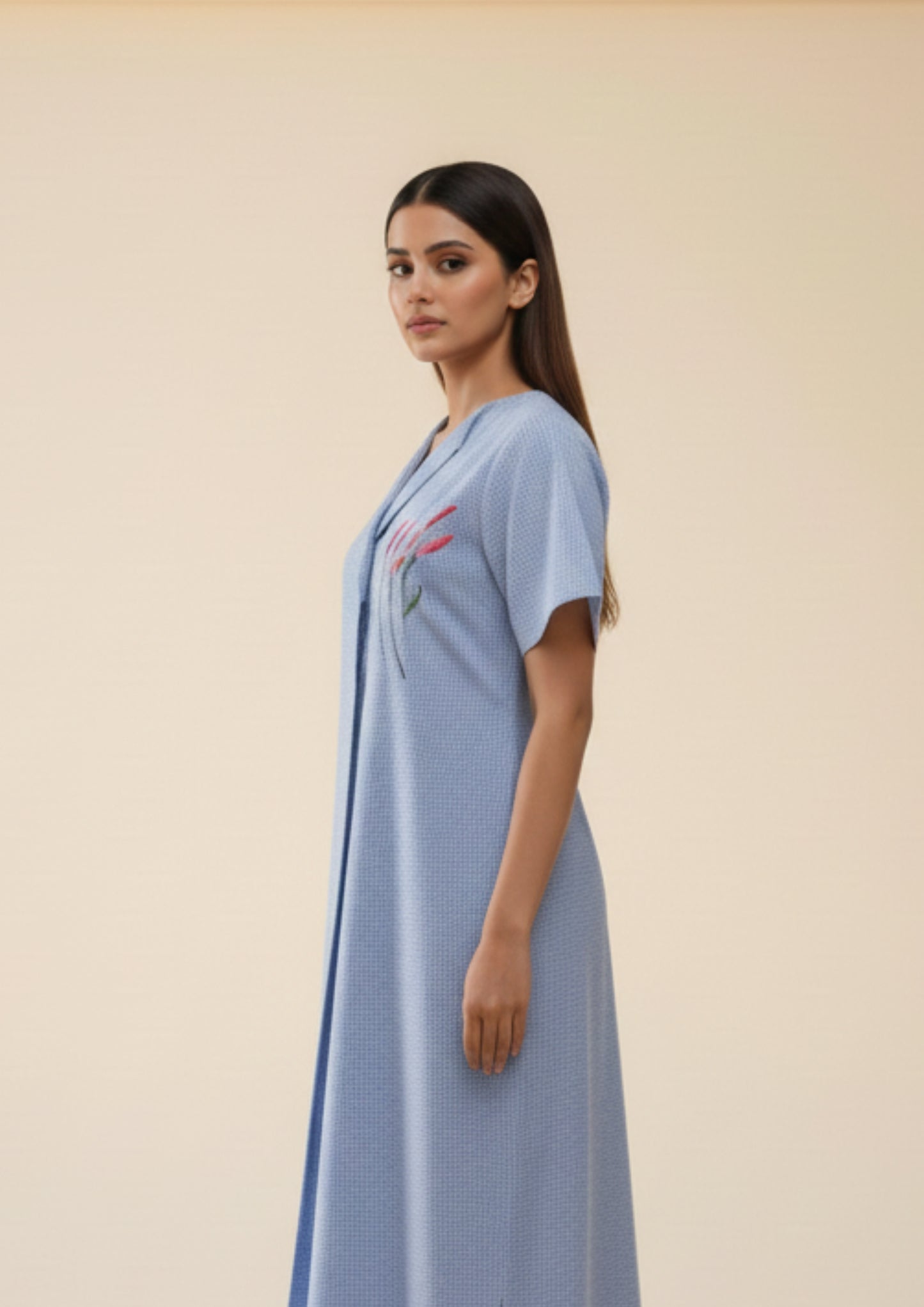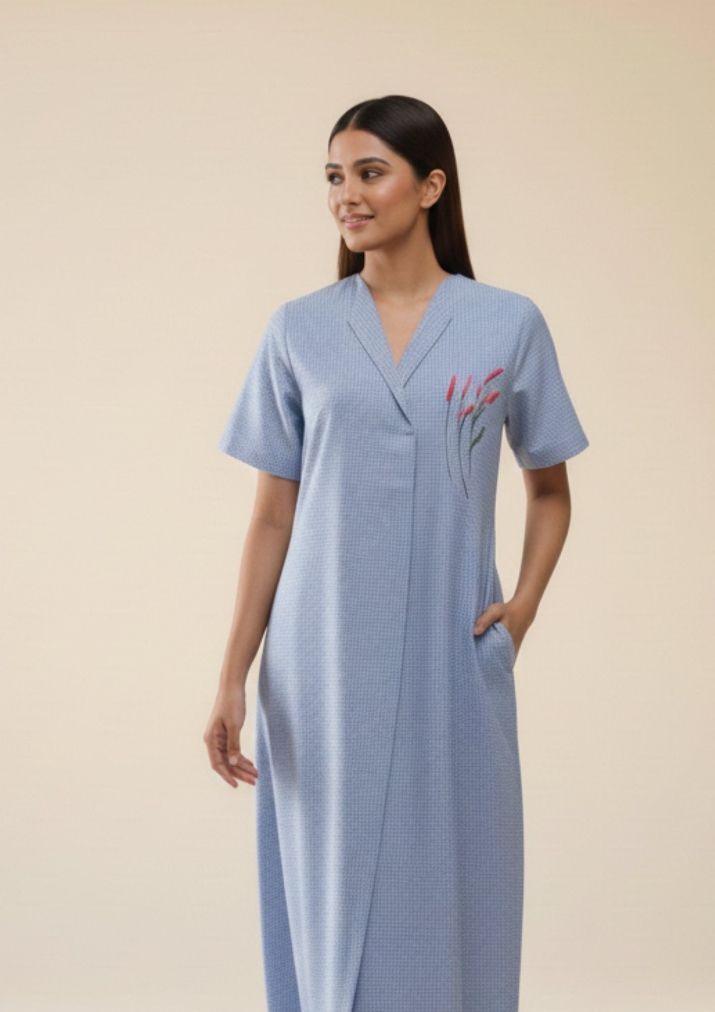 The Bluebell Whisper Hand-Embroidered Nighty blends timeless comfort with subtle craftsmanship. Made from soft, breathable cotton, this nighty is designed to keep you cool and comfortable through the night while feeling effortlessly elegant.