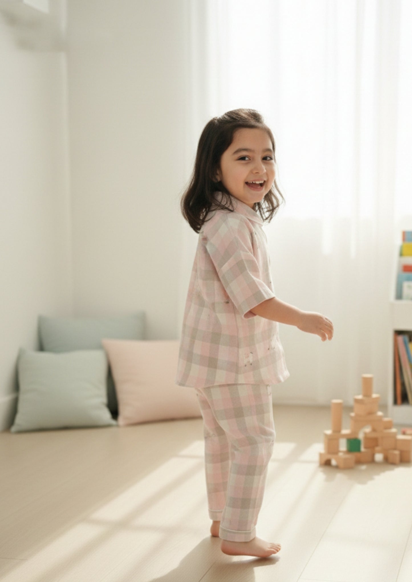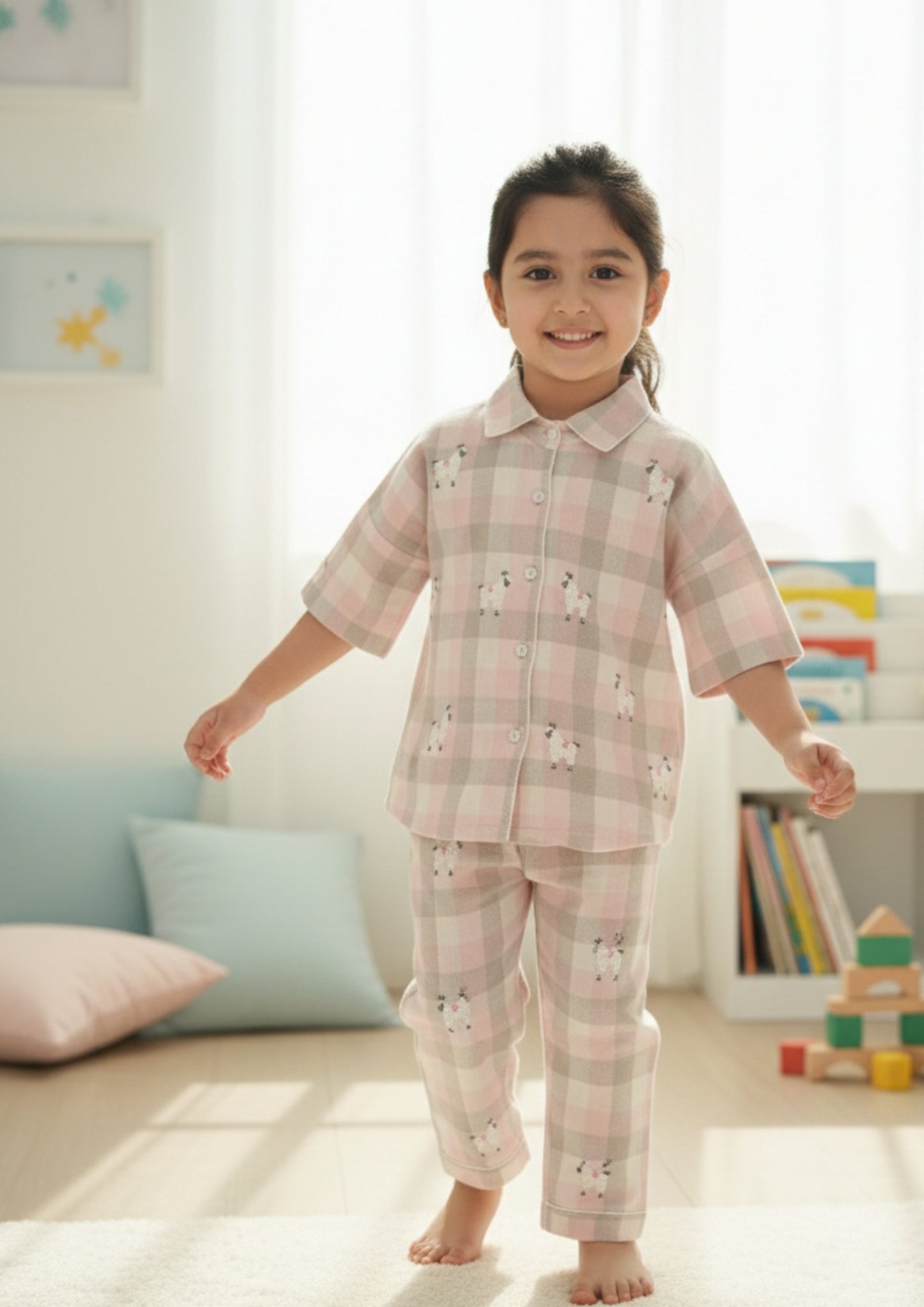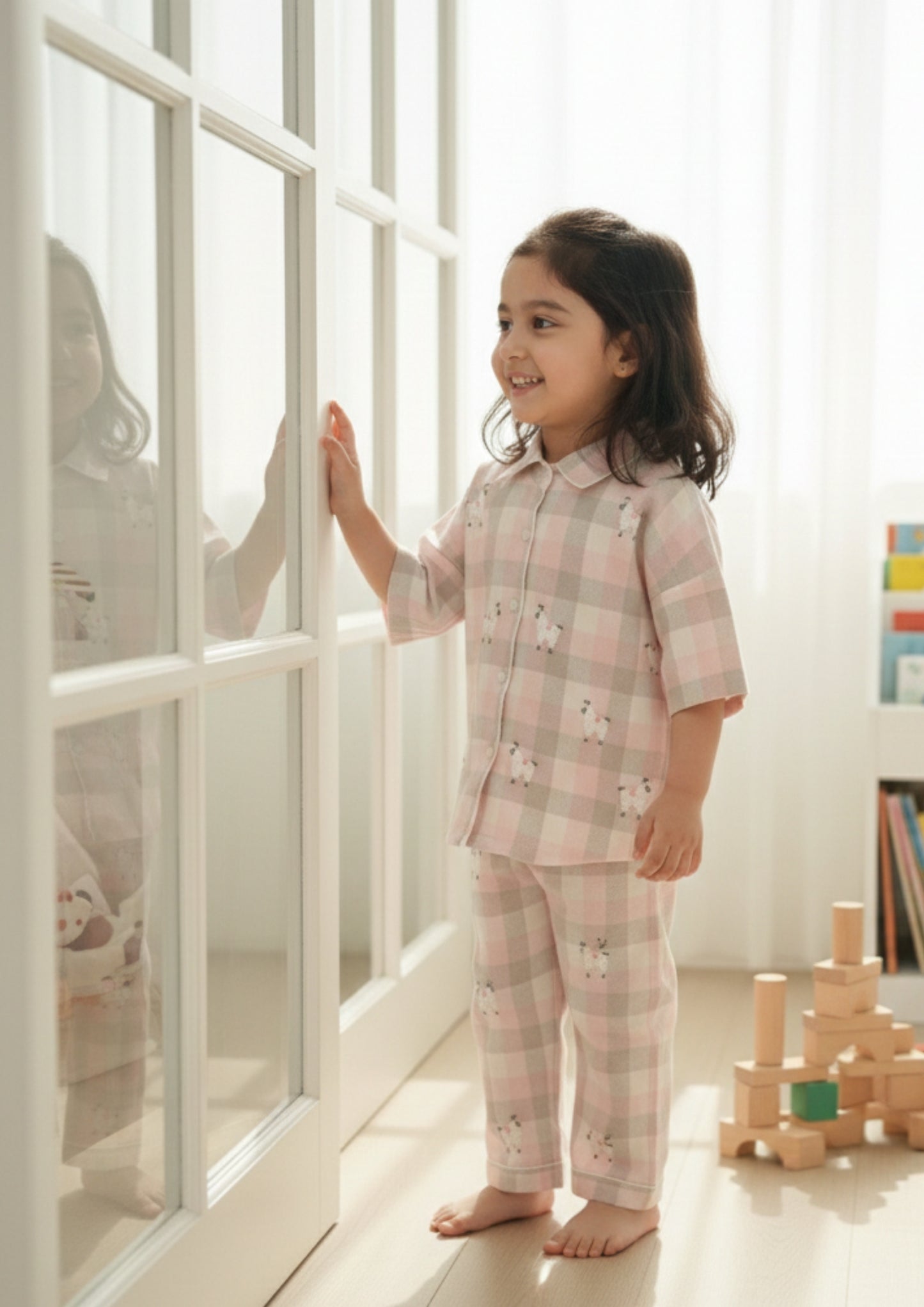 Regular price ₹ 1,365.00The Blush Meadow Kids Set blends timeless checks with charming sheep embroidery for a nightwear look that feels both playful and refined. Crafted in a coordinated two-piece silhouette, it features a short-sleeve collared shirt with a front button-down closure, paired with matching full-length pants for a clean, classic finish. The soft pastel plaid base adds warmth and sweetness, while the subtle embroidered details elevate the overall design. Perfect for both boys and girls, this unisex kids night suit offers comfort, ease of movement, and an effortlessly polished bedtime style.