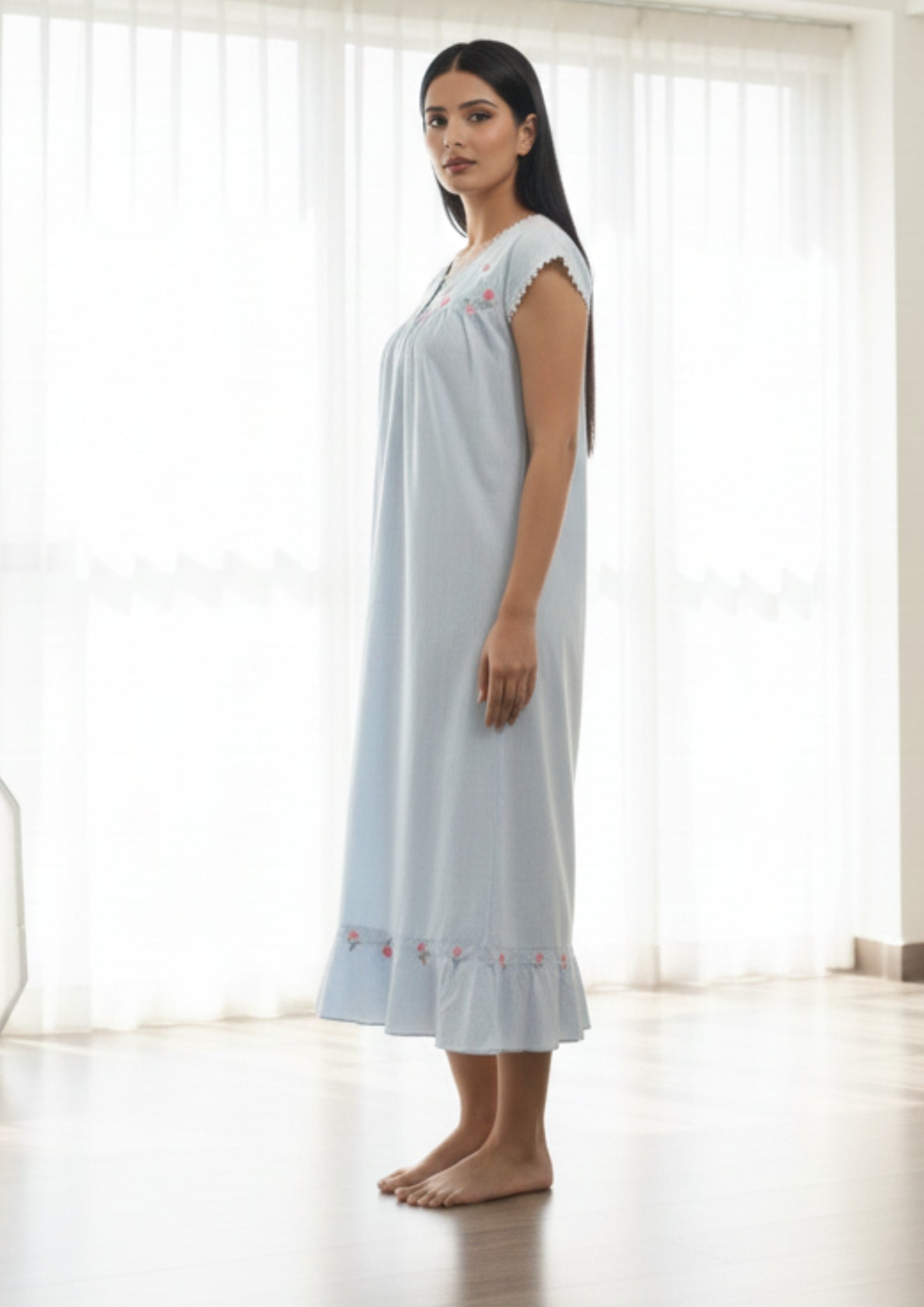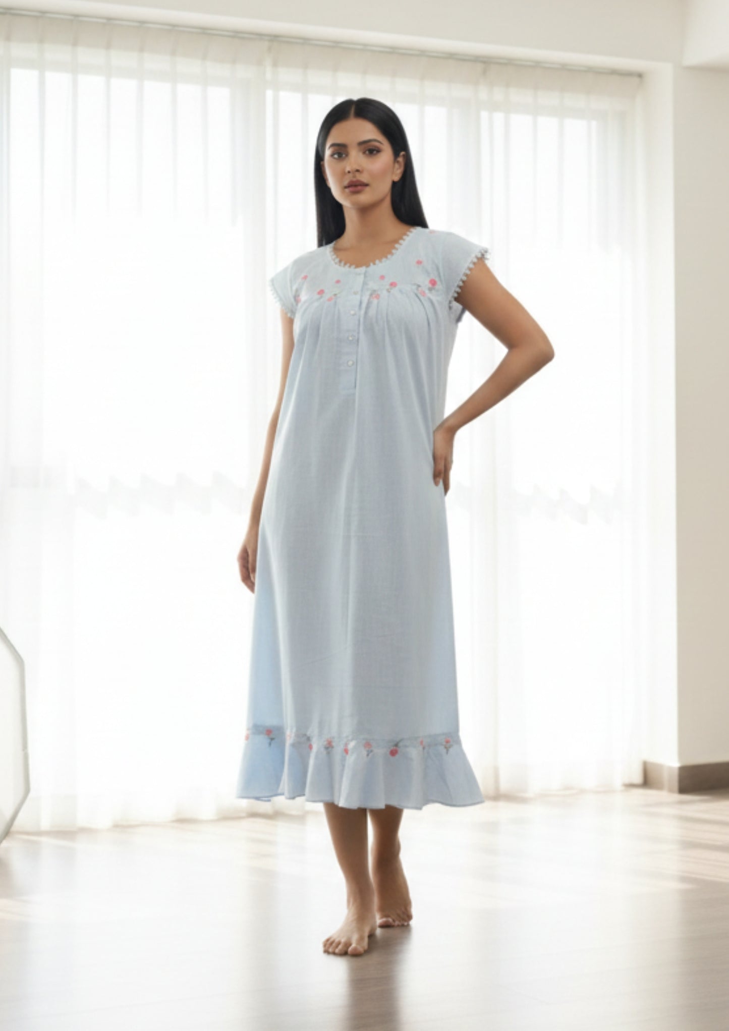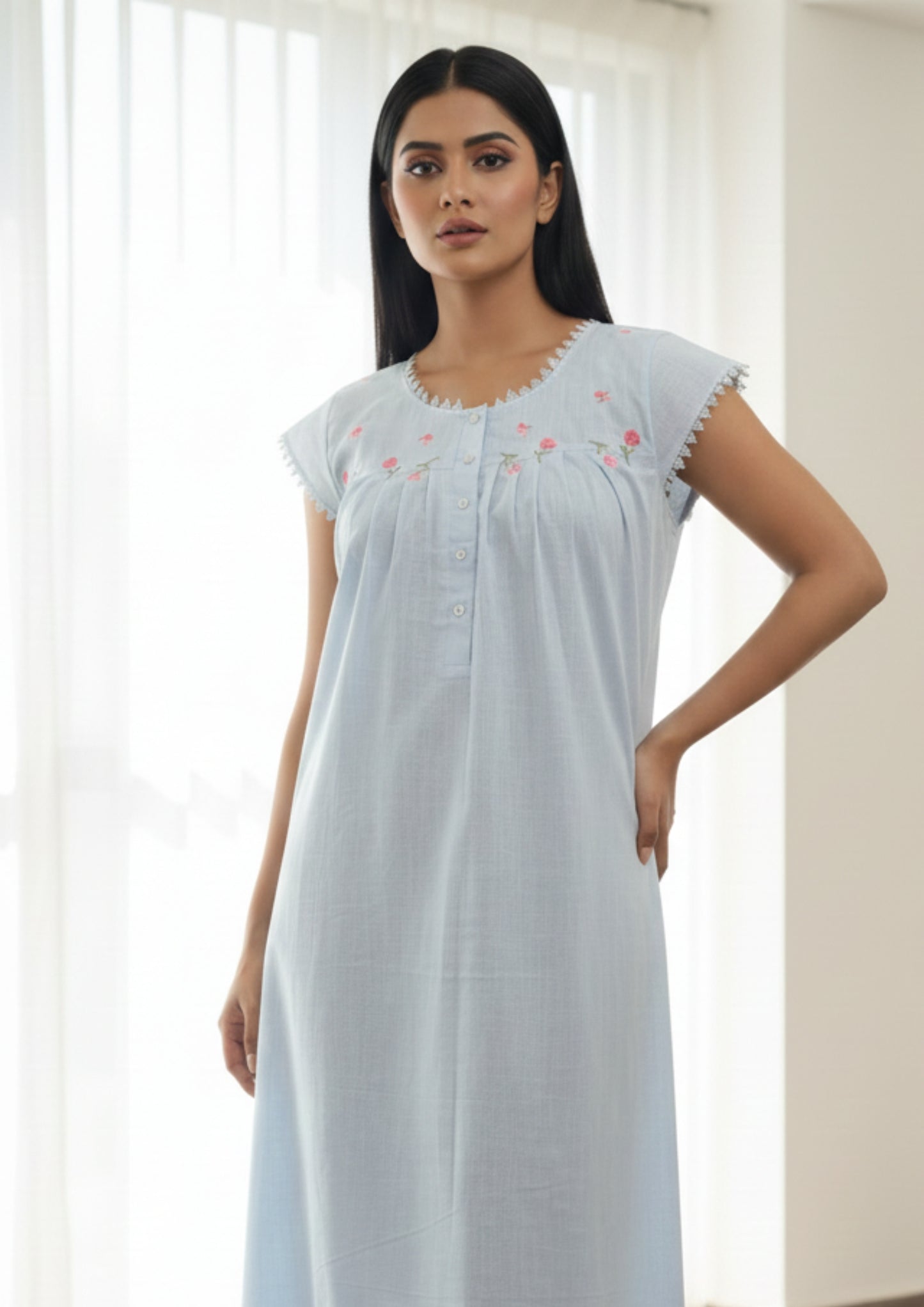 Soft, serene, and beautifully detailed — the Blossom Mist Embroidered Sleeveless Nighty is designed to make every night feel effortlessly comfortable. Crafted in a calming pastel shade, it features delicate floral embroidery along the neckline and hem, adding a charming handcrafted touch to a simple silhouette.