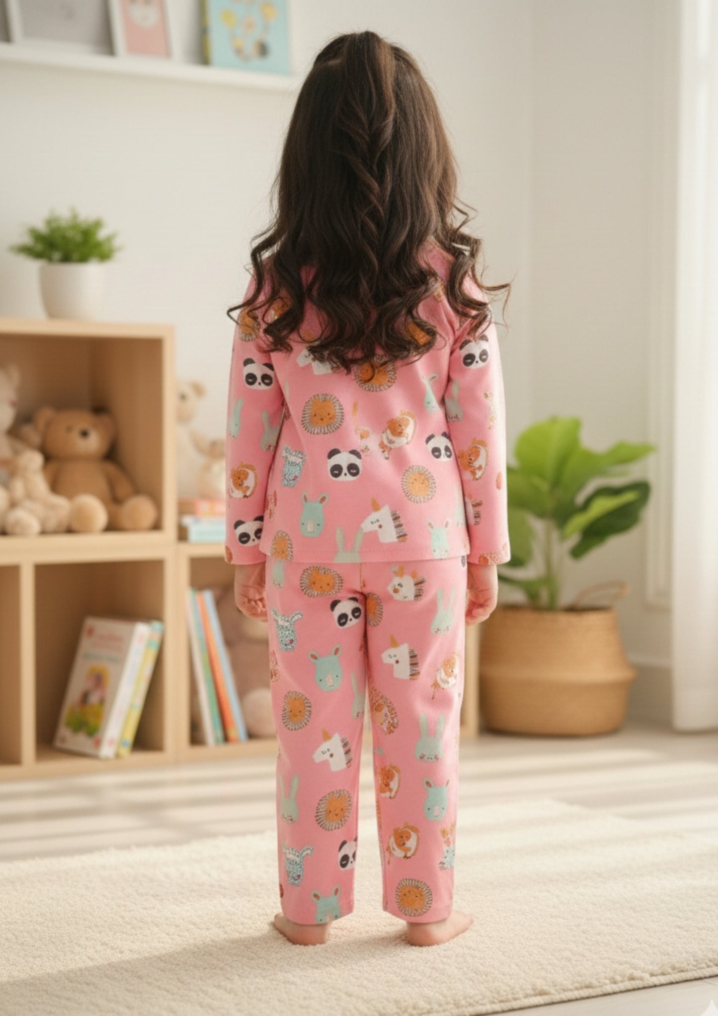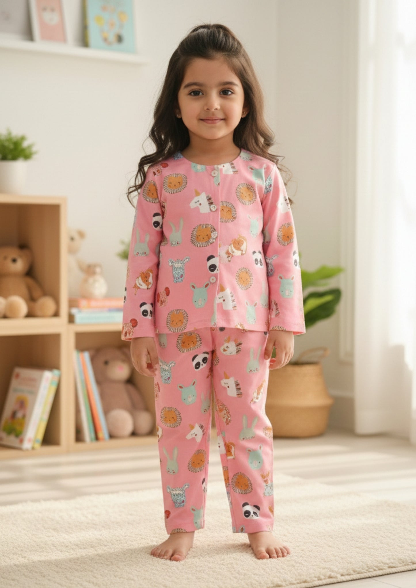The Blush Zoo Kids Set brings a charming touch to nightwear with its delightful teddy and animal print scattered across a soft pink base. Designed in a comfortable two-piece silhouette, it features a round-neck, long-sleeve top paired with matching full-length pants for effortless coordination. The relaxed fit allows little ones to move freely from playtime to bedtime, while the playful motifs add warmth and personality to their nightly routine. Perfect for both boys and girls, this unisex kids night suit blends comfort, color, and a sweet, storybook-inspired appeal.