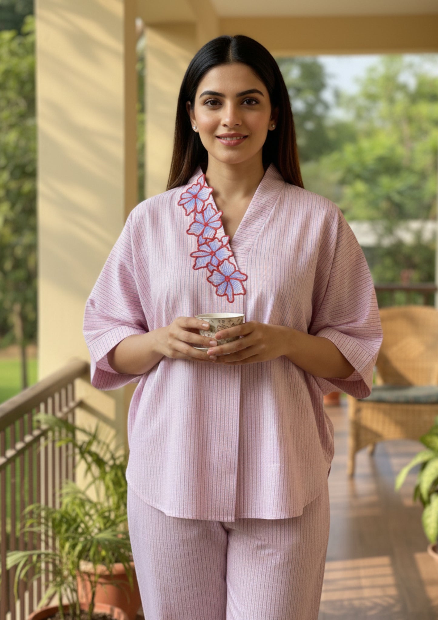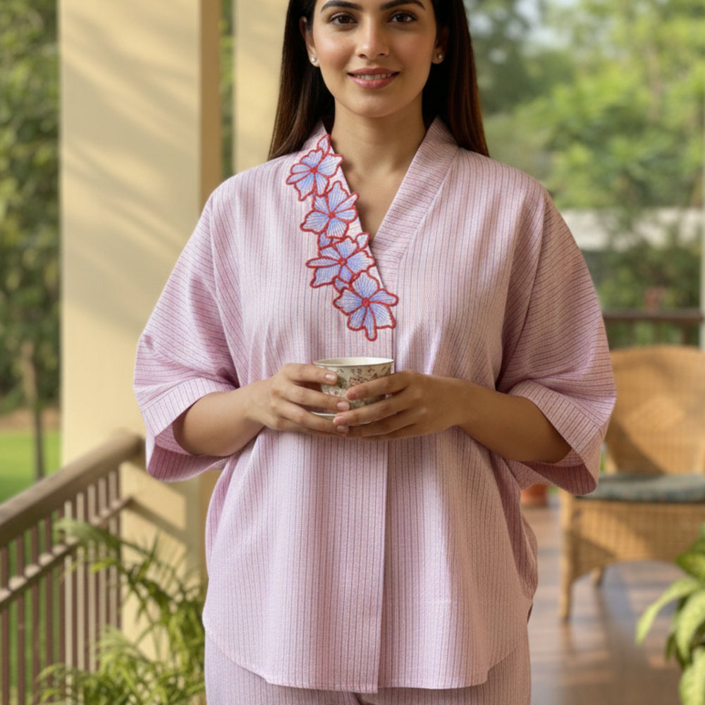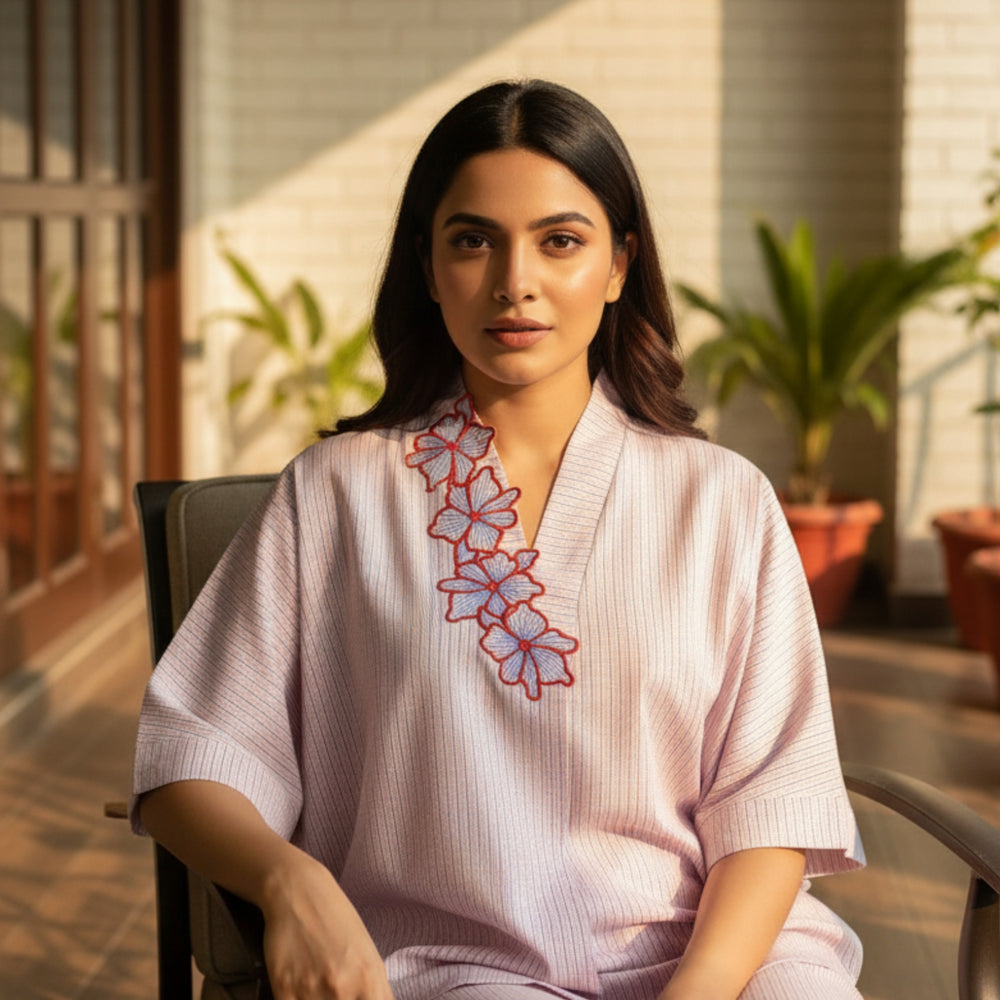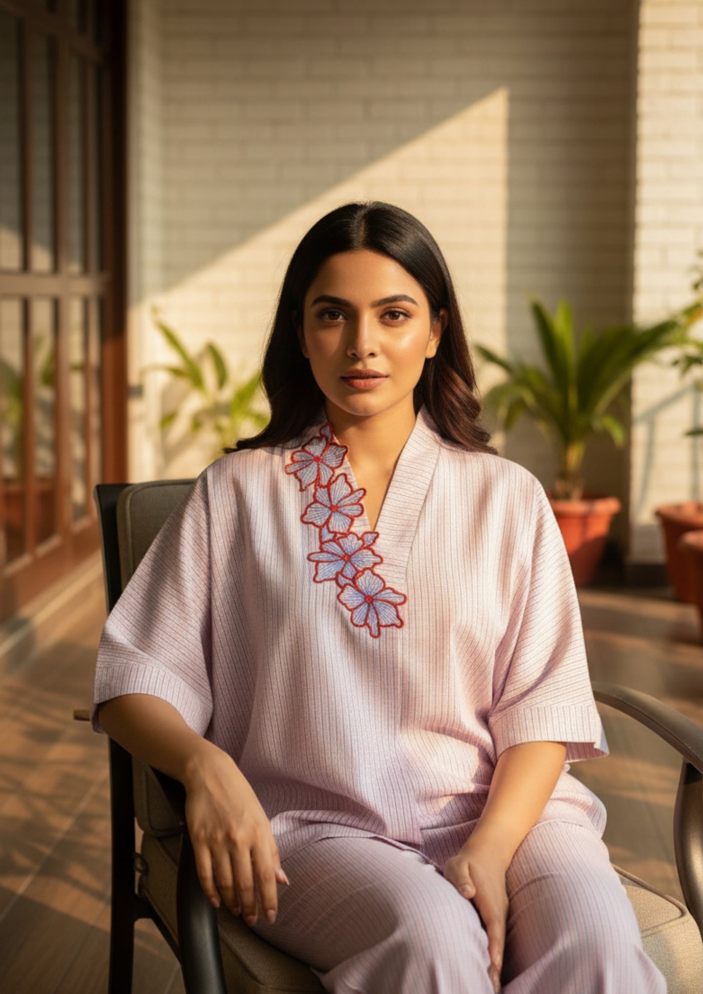 Celeste Charm is crafted in a calming powder-blue shade and elevated with delicate embroidery along the V-neckline. The relaxed cape-style top paired with straight-fit bottoms creates a silhouette that is effortlessly elegant yet unbelievably comfortable.