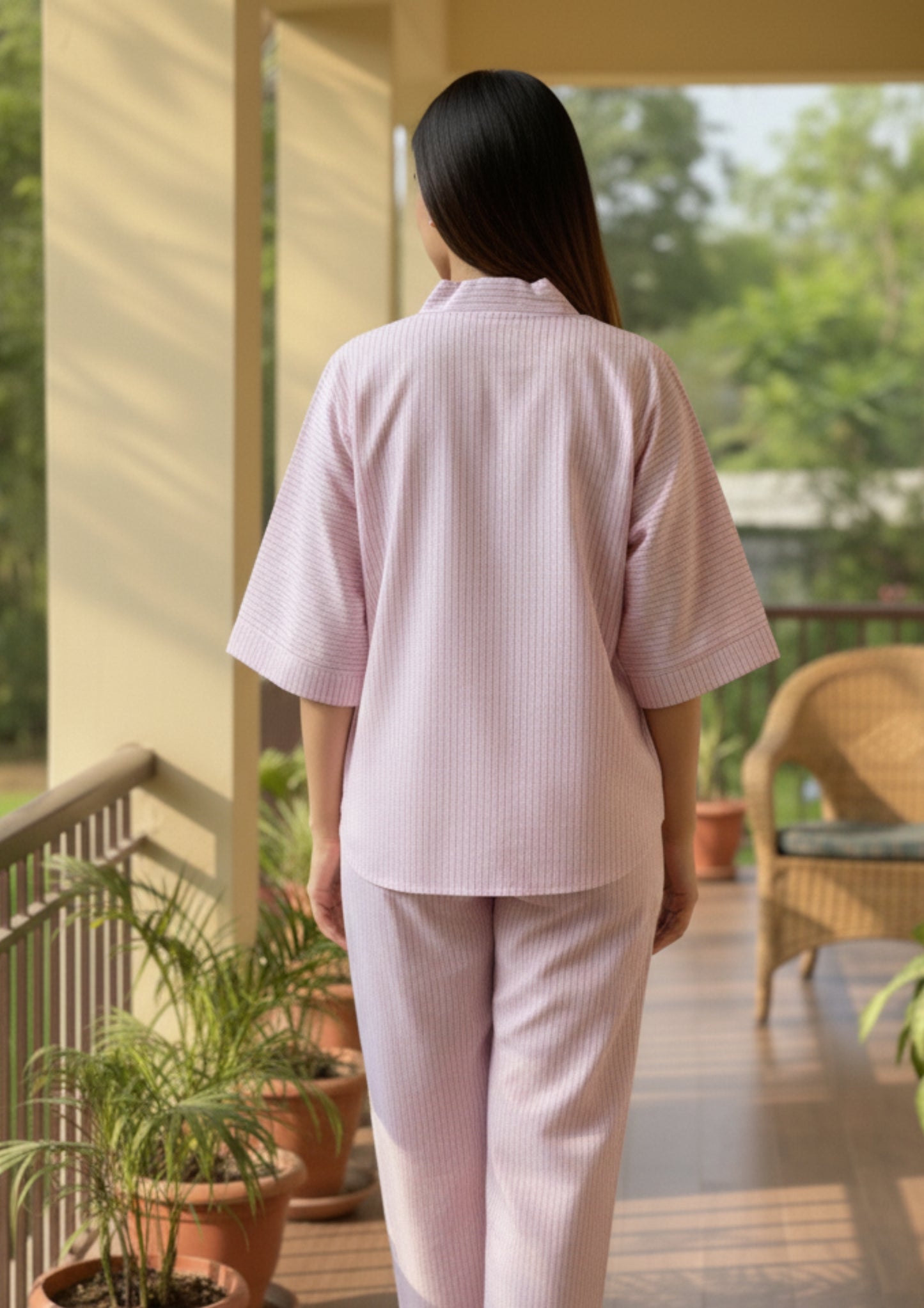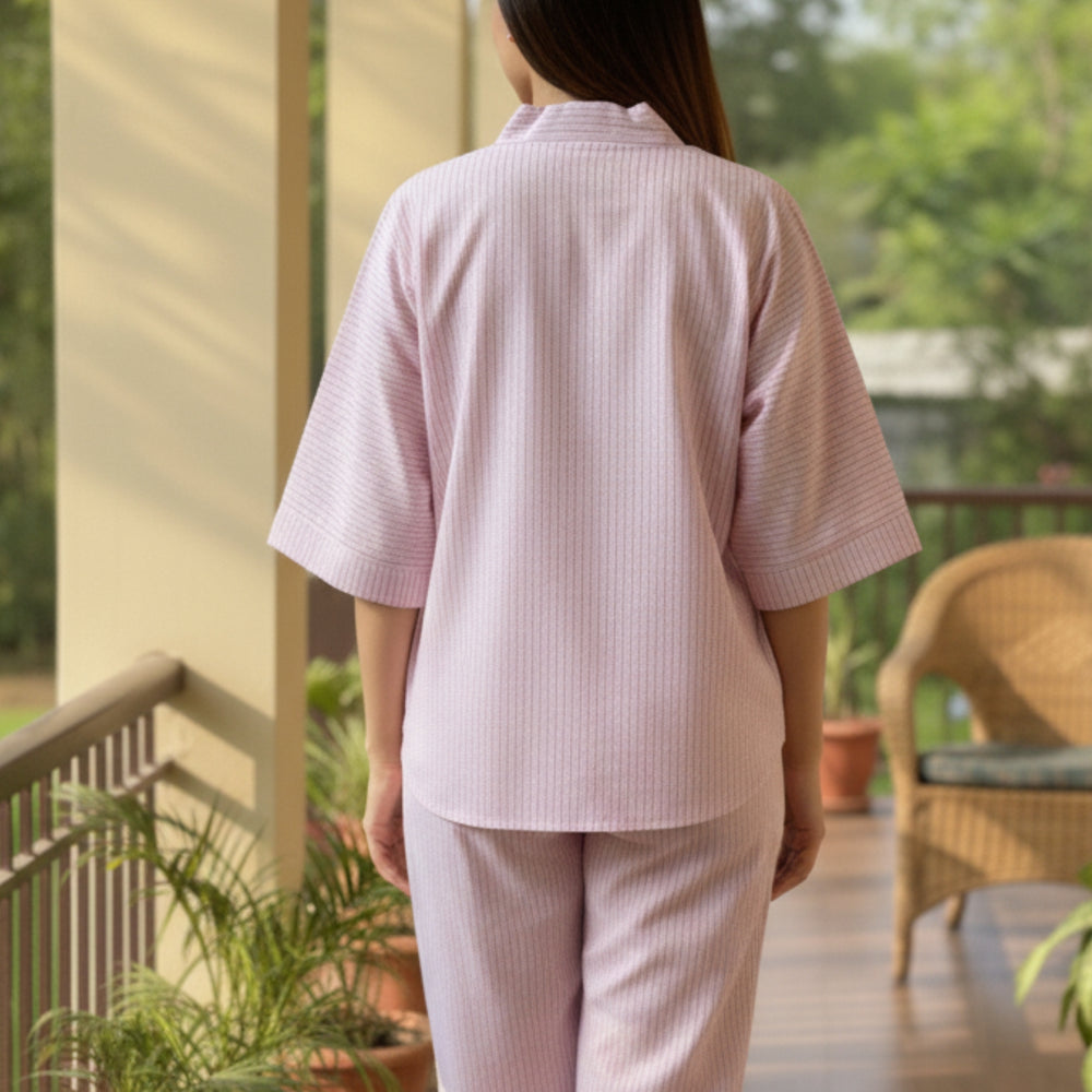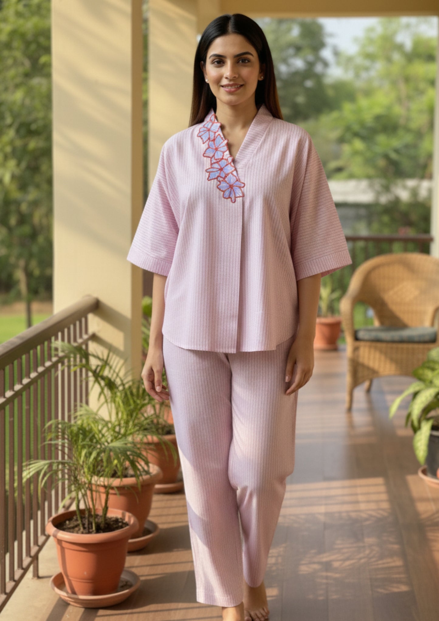 Celeste Charm is crafted in a calming powder-blue shade and elevated with delicate embroidery along the V-neckline. The relaxed cape-style top paired with straight-fit bottoms creates a silhouette that is effortlessly elegant yet unbelievably comfortable.
