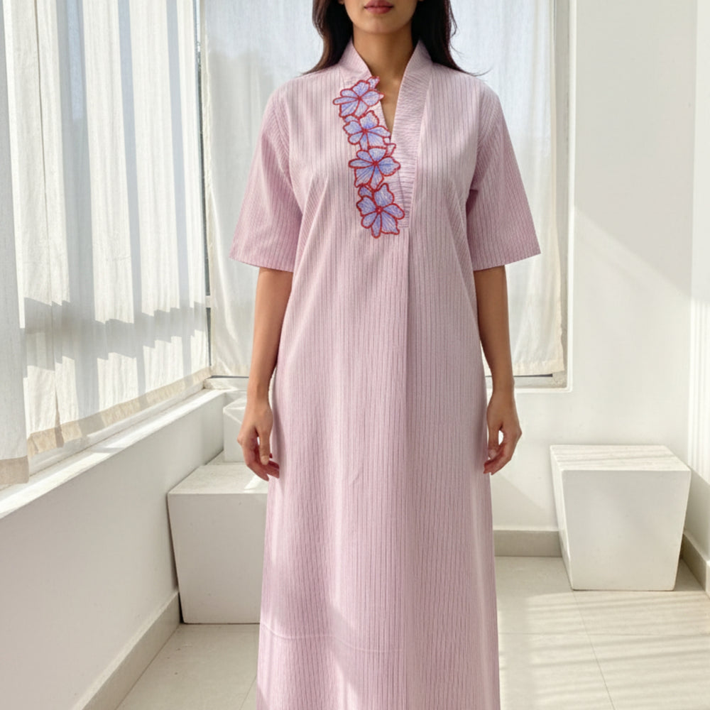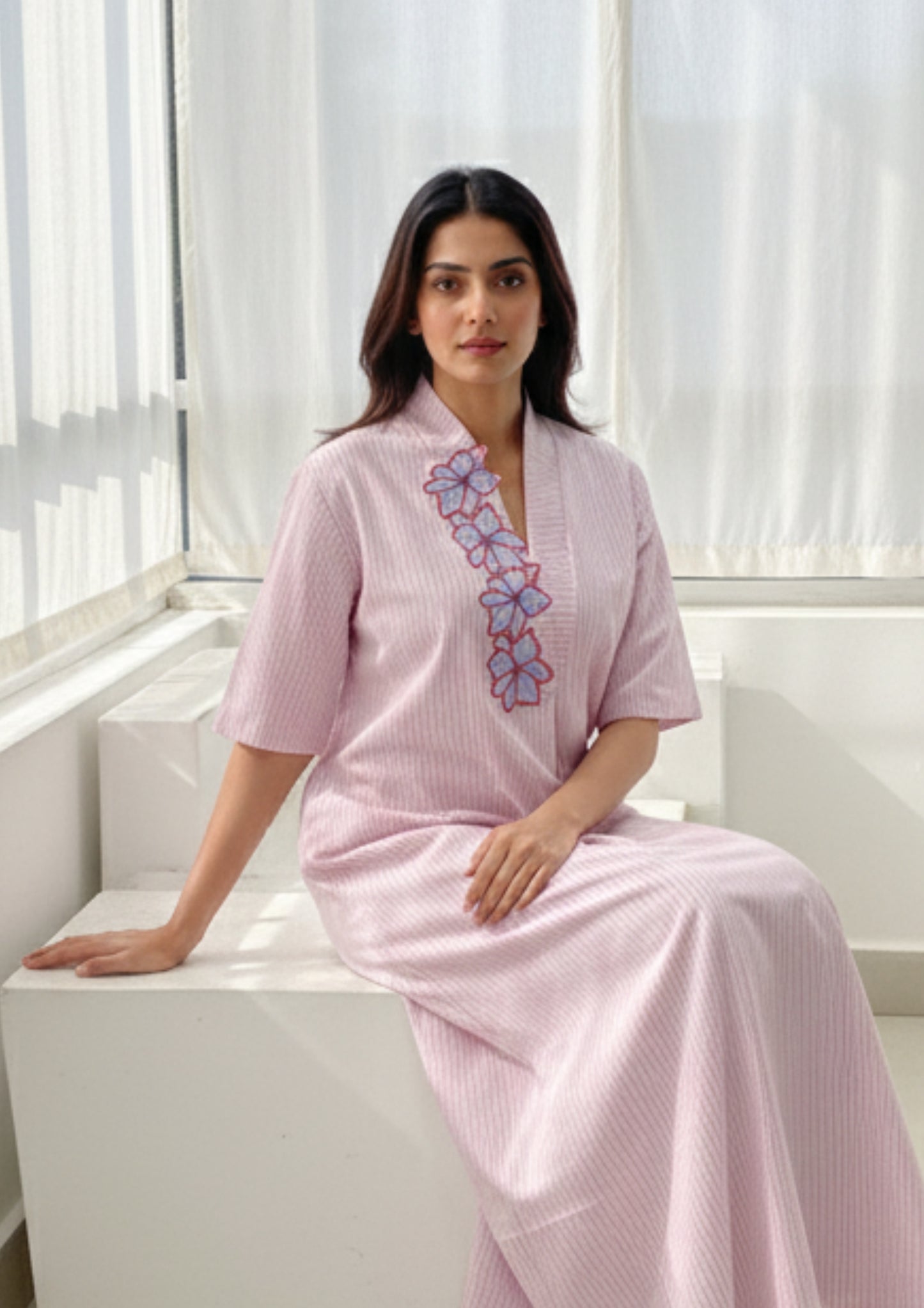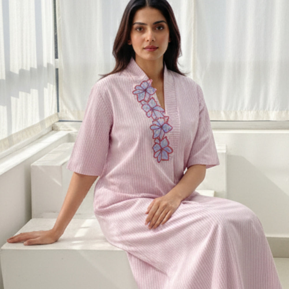 Introducing Blush Bloom Serenity, a embroidered V-neck nighty designed for women who love elegance wrapped in effortless comfort. The soft blush fabric drapes beautifully, while the neckline features delicate floral embroidery — each petal crafted by hand, adding a touch of couture detail to your everyday unwind.