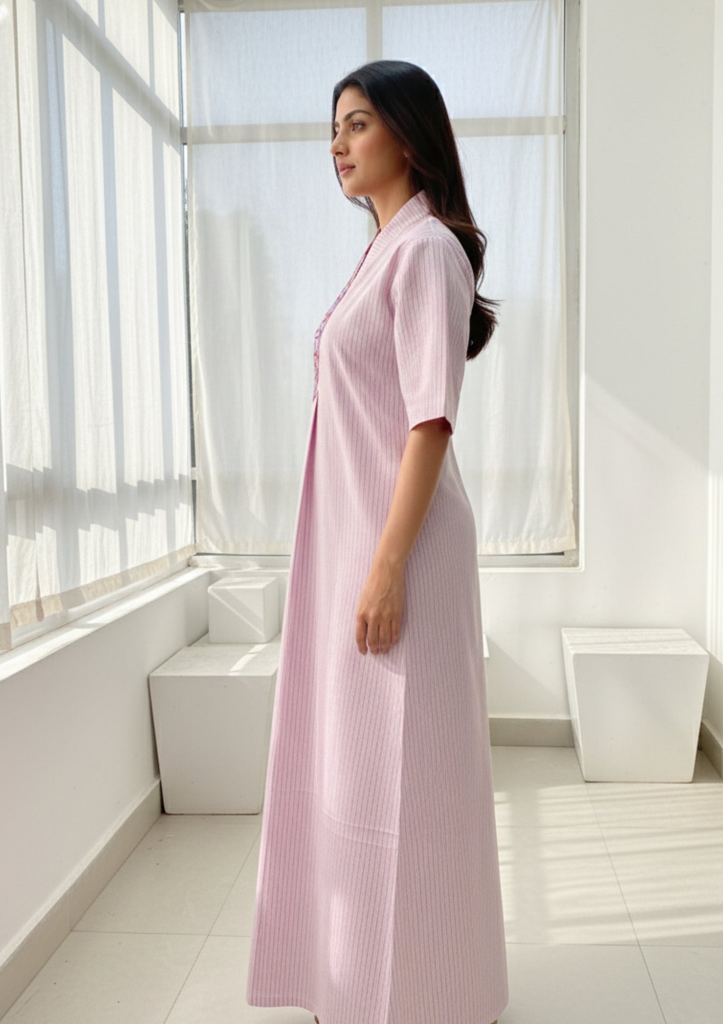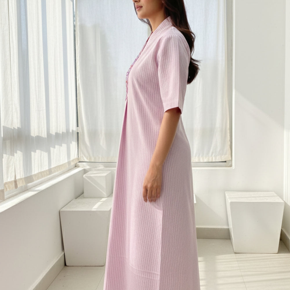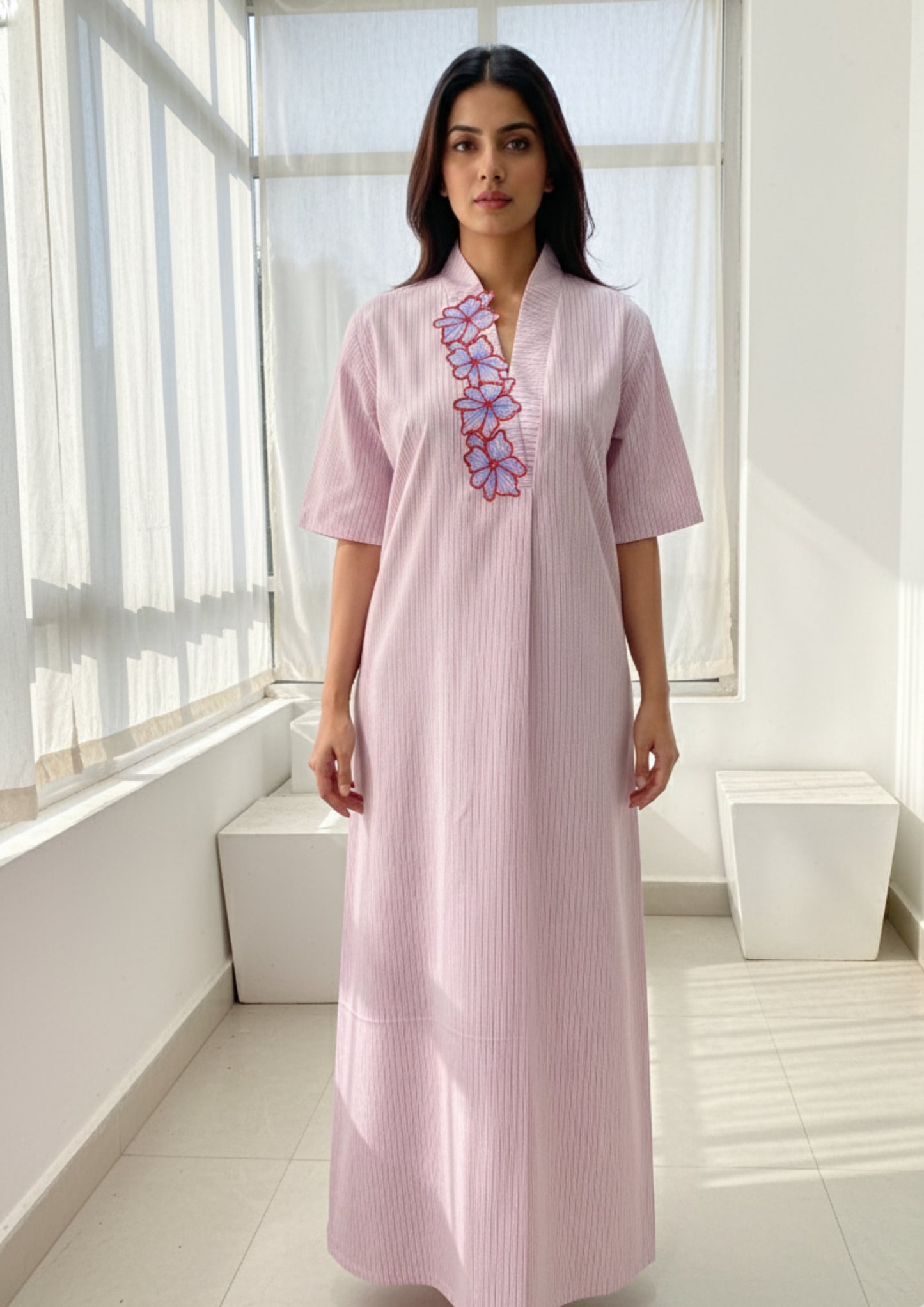 Introducing Blush Bloom Serenity, a embroidered V-neck nighty designed for women who love elegance wrapped in effortless comfort. The soft blush fabric drapes beautifully, while the neckline features delicate floral embroidery — each petal crafted by hand, adding a touch of couture detail to your everyday unwind.