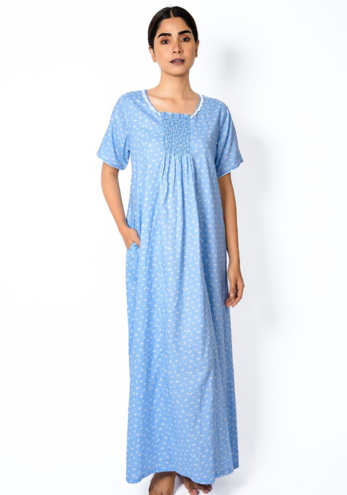 Regular price ₹ 1,255.00Ease into comfort with this airy cotton nighty, designed with soft gathers and a lace-accented neckline for a touch of everyday elegance. The breathable cotton fabric offers a light and cozy feel, while the relaxed fit ensures freedom of movement from dusk to dawn.