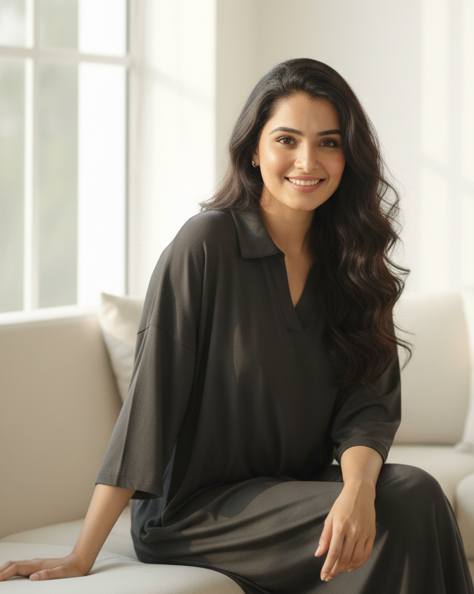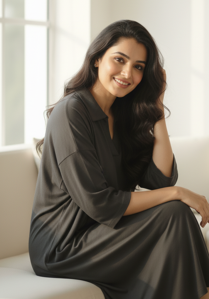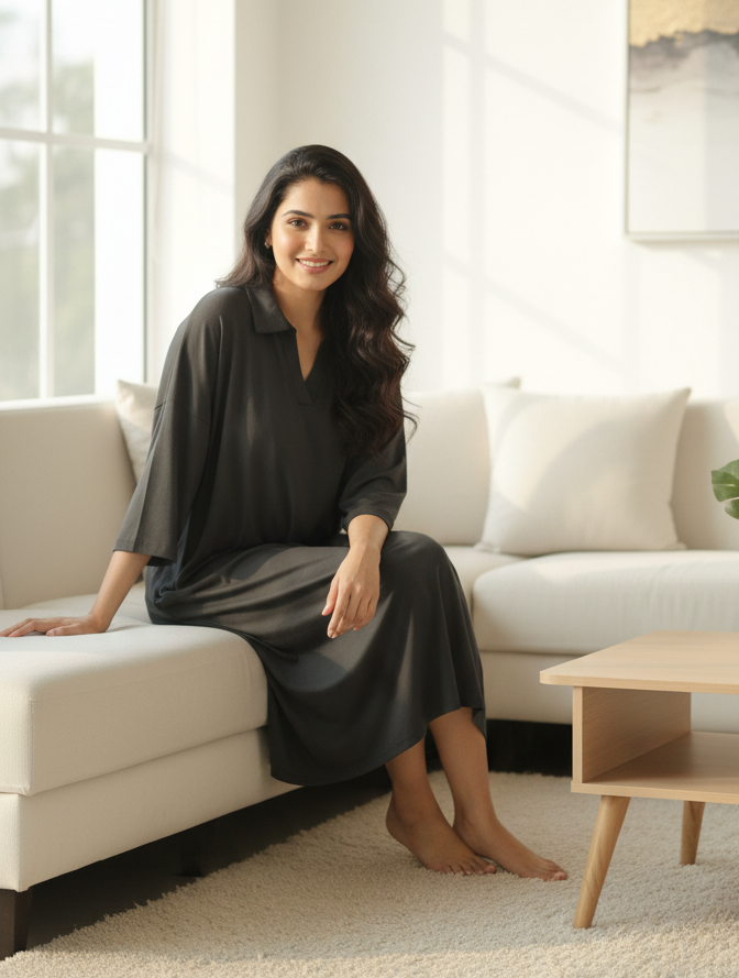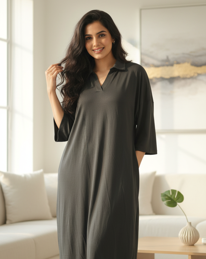 The Midnight Cloud Relaxed Sleep Shirt Set is designed for women who crave effortless style with absolute comfort. Crafted in a luxe, fluid fabric, the sleep shirt drapes beautifully with a soft collar and a clean V-notch neckline that adds refinement to a minimal silhouette. Paired with matching shorts (not pictured), this set is lightweight, breathable, and perfect for warm nights, lazy weekends, or unwinding after a long day. Understated, modern, and incredibly soothing to wear, it is your go-to blend of simplicity and sophistication.