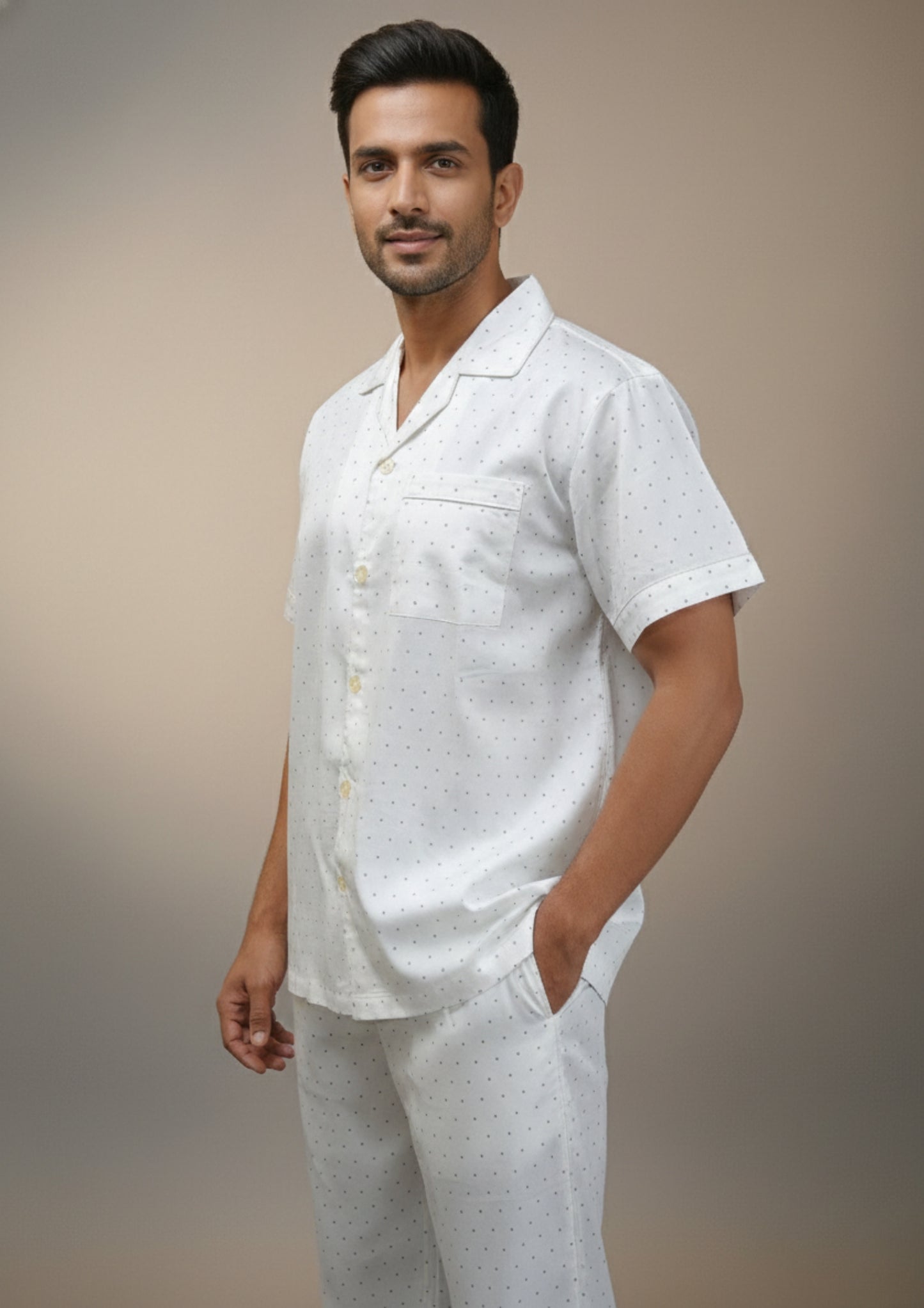 The button-down shirt features a relaxed collar and subtle all-over print for a refined finish, paired with straight-fit pajama pants that allow ease of movement. Lightweight and skin-friendly, this night suit is perfect for restful sleep, relaxed mornings, and elevated lounging at home.