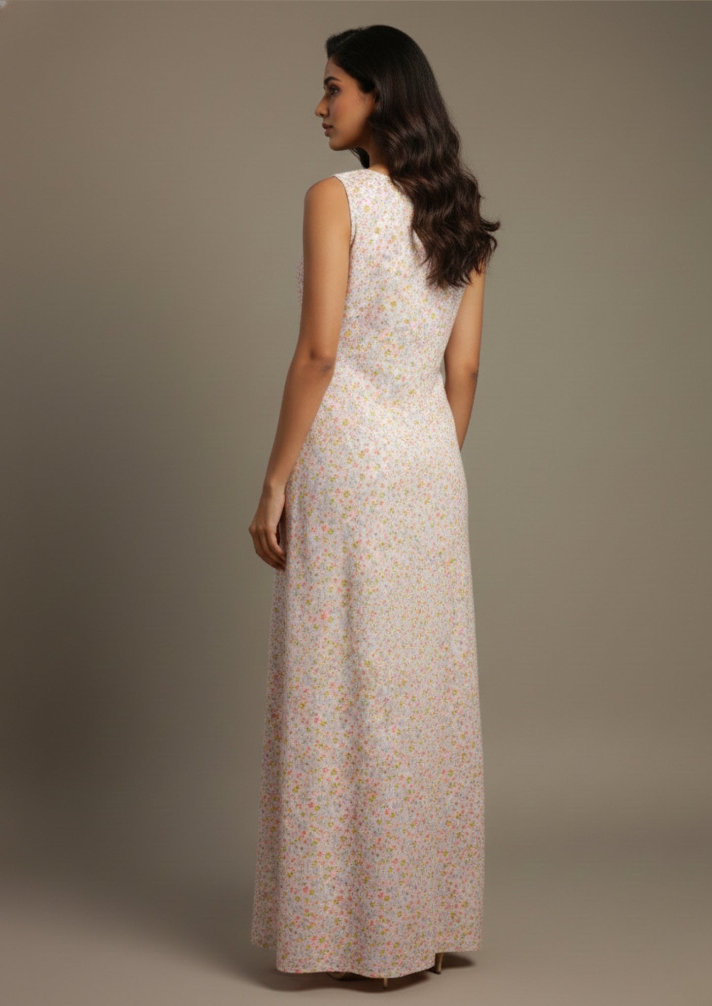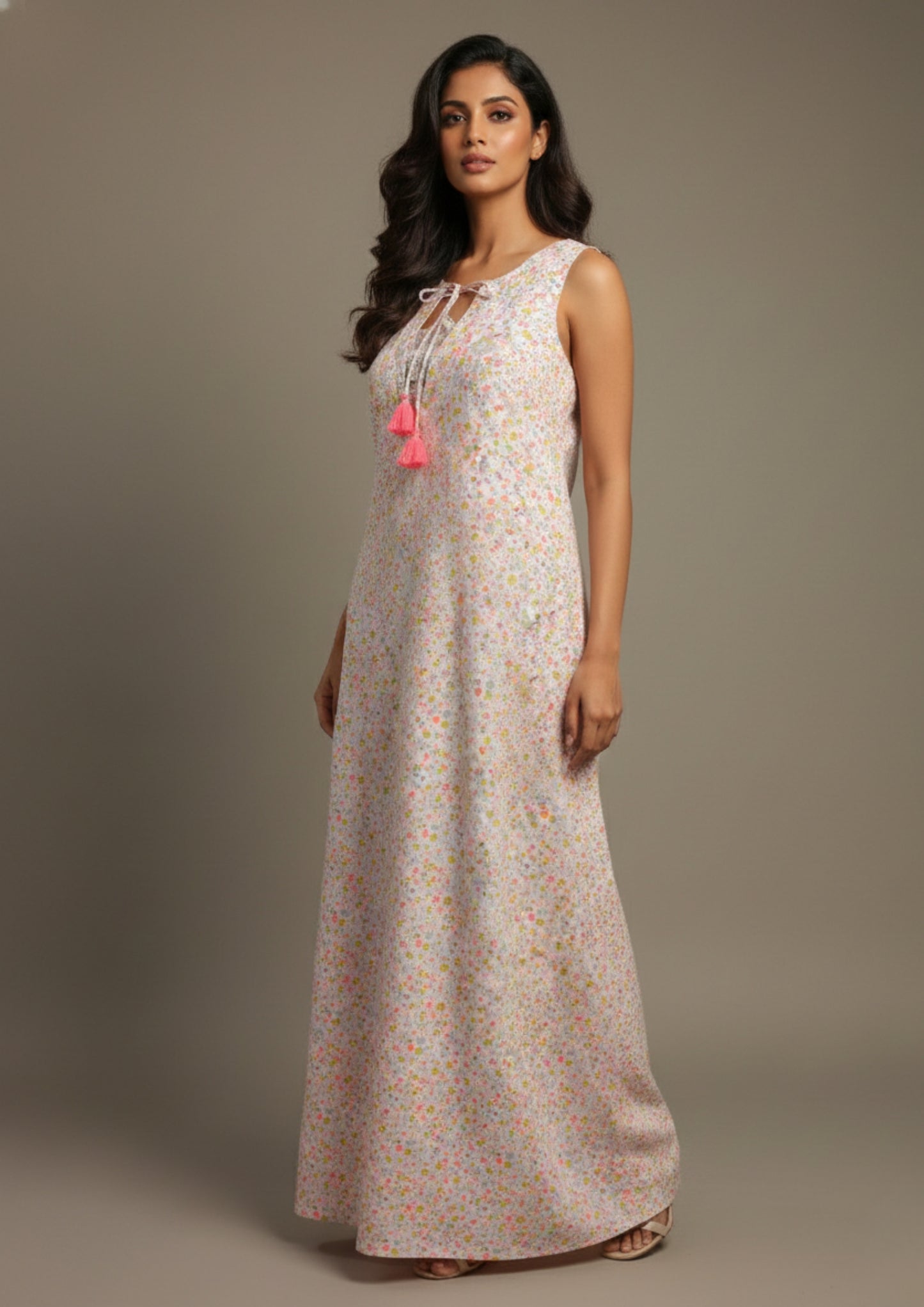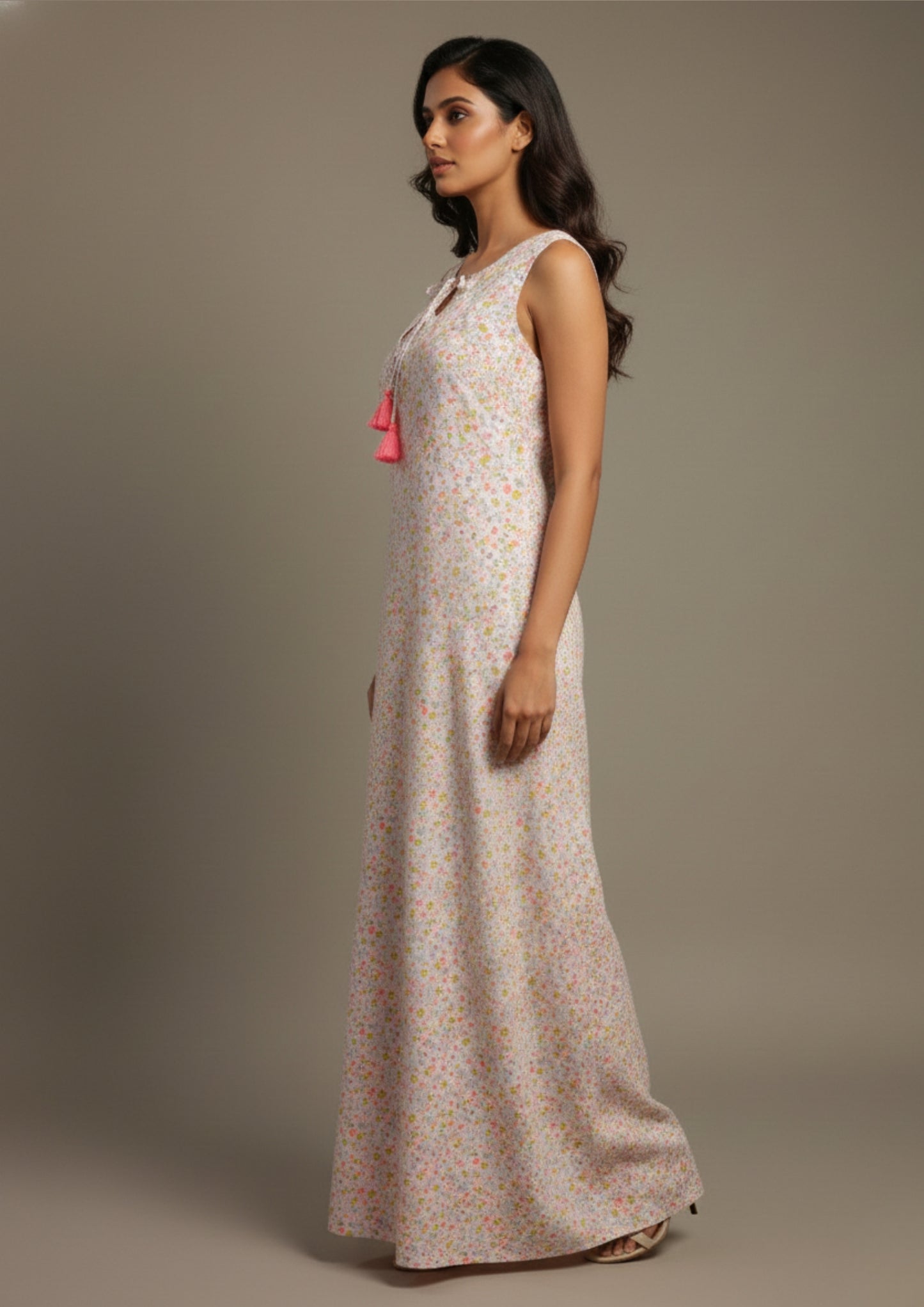 The delicate multi-color floral print adds a cheerful charm, while the tie-up neckline with tassel detailing brings a subtle, feminine accent. Its flowy full-length silhouette allows free movement, making it perfect for sleeping, lounging, or unwinding at home.