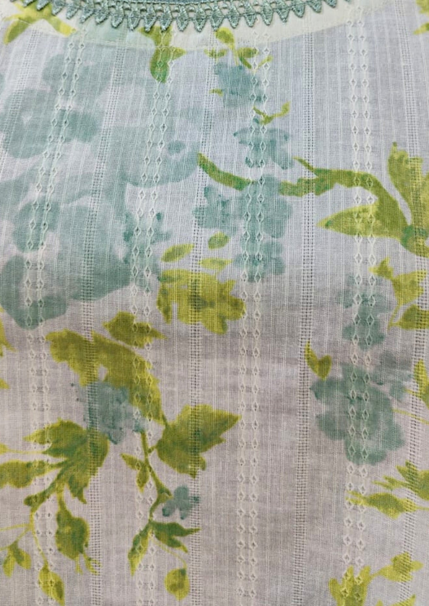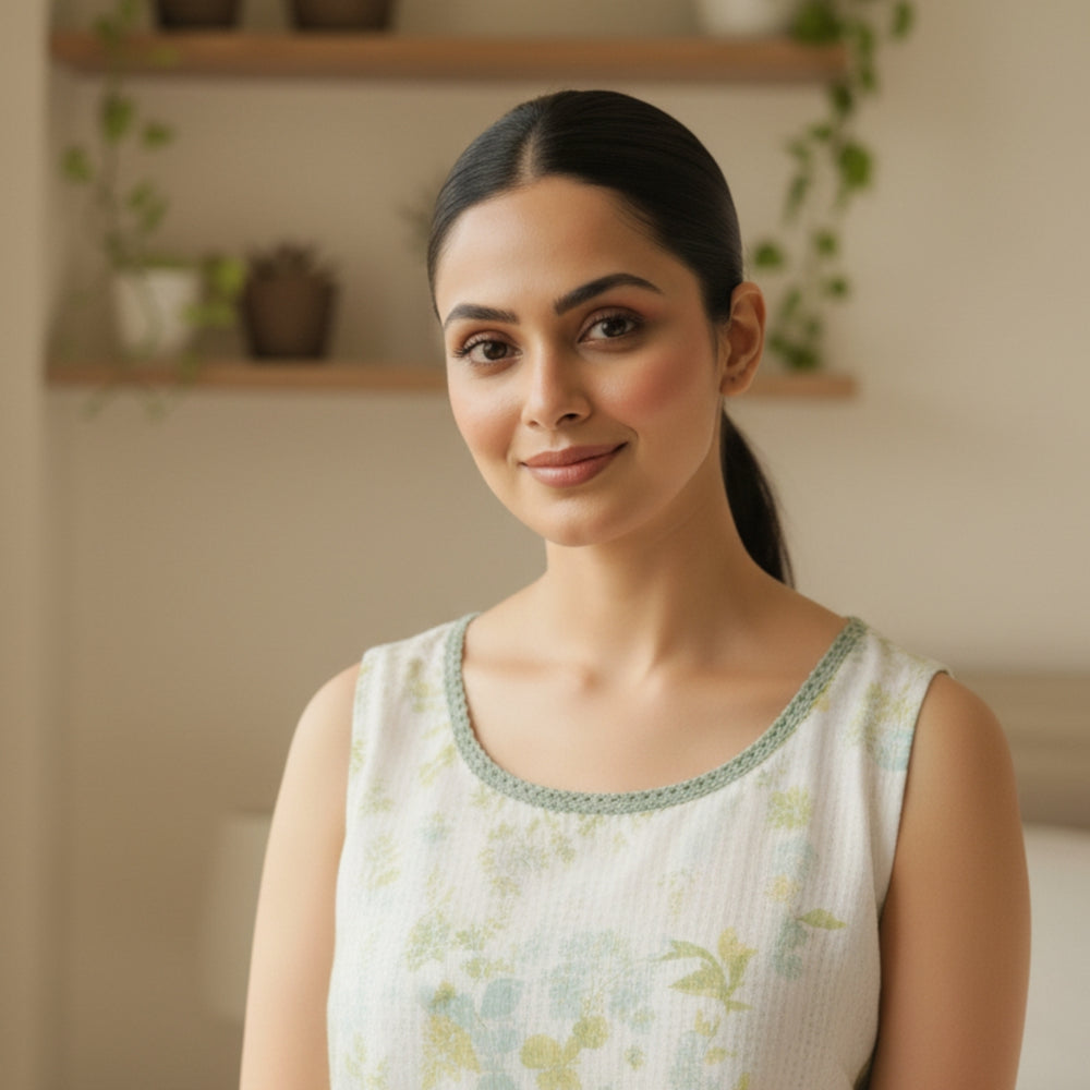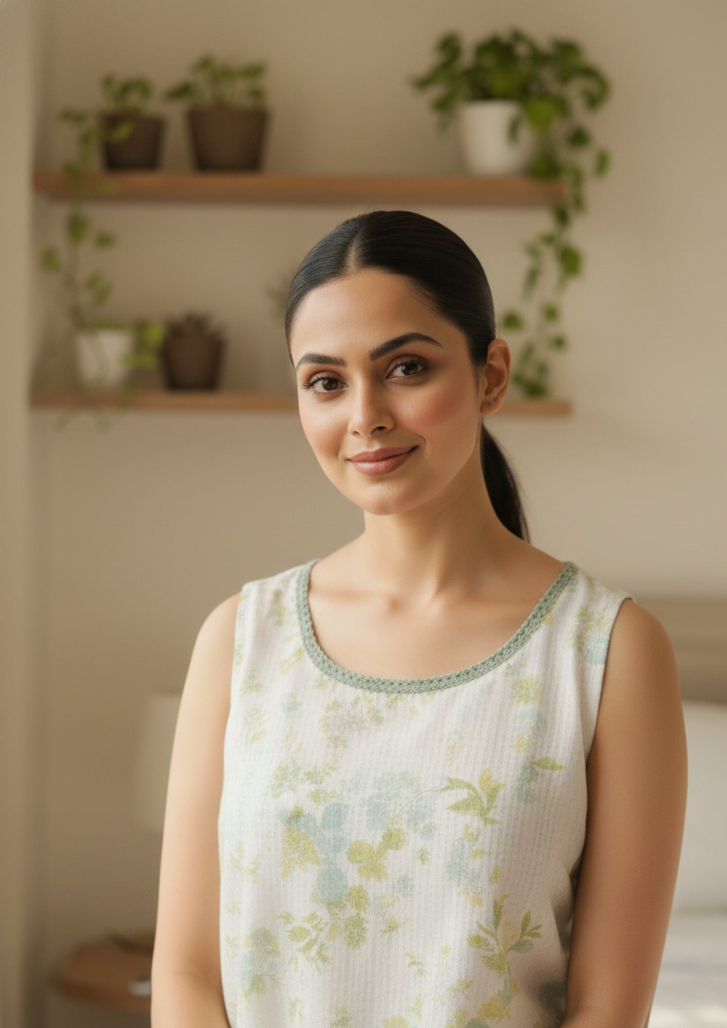 The sleeveless top comes with a delicate hand-embroidered neckline, adding a touch of artisanal charm, while the matching shorts ensure easy movement and relaxed comfort. Light, airy, and graceful — this set is your perfect companion for warm days or effortless lounging.