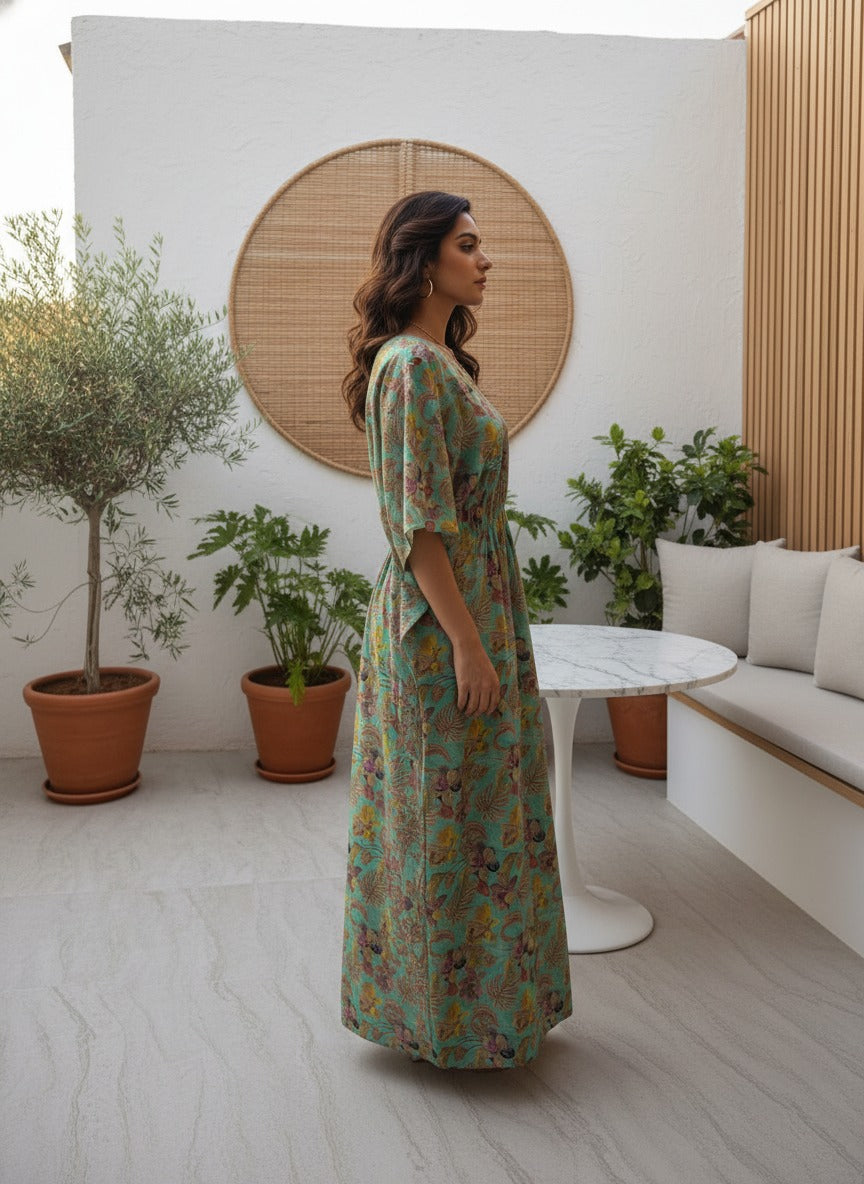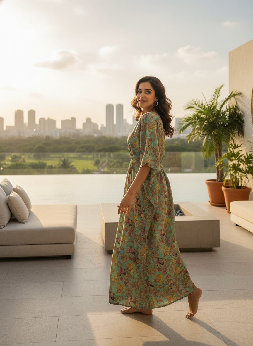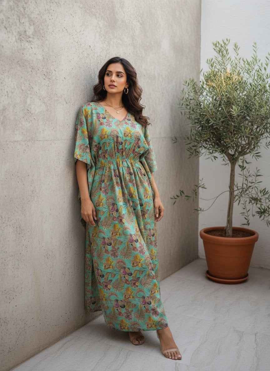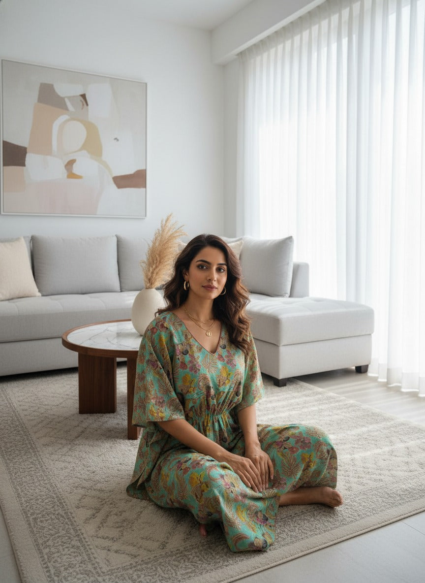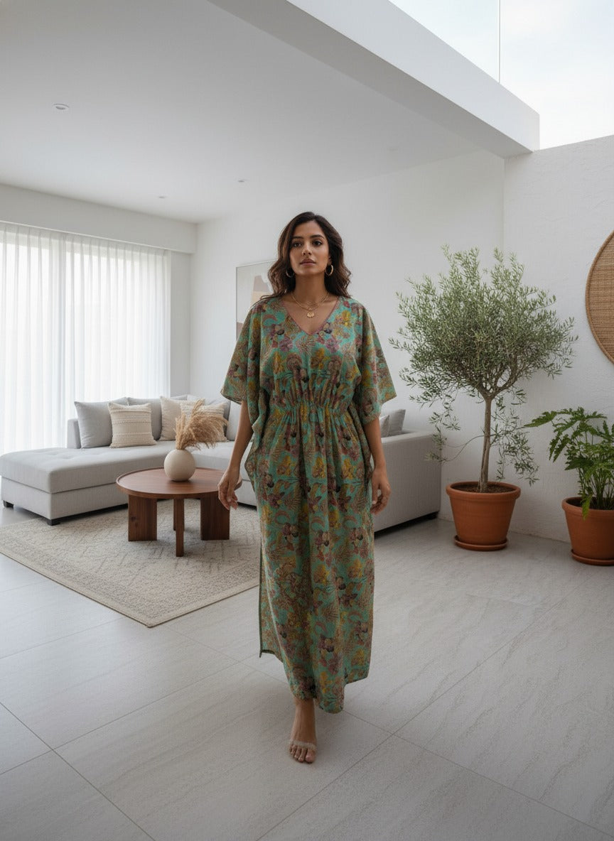 Regular price ₹ 2,588.00Step into effortless elegance with the Verdant Bloom Kaftan Lounge Dress, crafted for women who love comfort wrapped in luxury. This free-flowing kaftan features a beautifully gathered waistline that flatters every silhouette while allowing maximum ease. Its soft, breathable fabric drapes gracefully, enhanced by an enchanting all-over botanical print that brings calm, vacation-like vibes to your everyday moments. Perfect for home lounging, casual outings, resort stays, or relaxed evenings—this kaftan makes comfort look sophisticated.