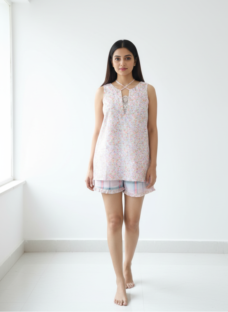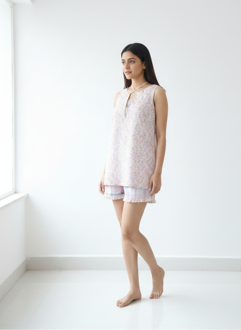 Paired with lightweight, easy-fit shorts in a complementary print, this set feels airy on the skin and moves with you naturally. Gentle, breathable, and thoughtfully designed — it’s perfect for everyday sleepwear that feels pretty yet practical.