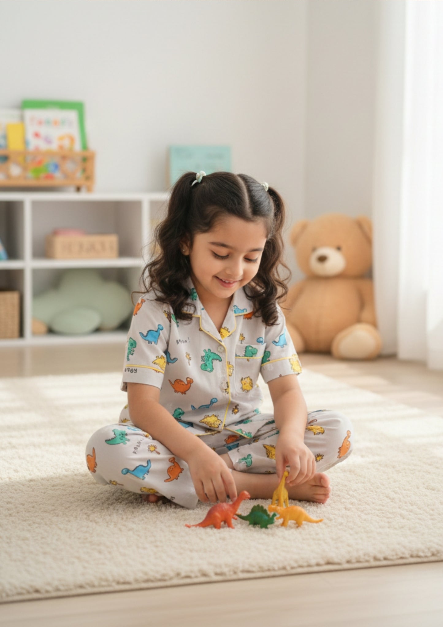 Regular price ₹ 664.00The Dino Roar Kids Set brings imagination to life with its vibrant dragon-inspired print scattered across a soft neutral base. Designed in a timeless two-piece silhouette, it features a short-sleeve, collared button-down top accented with contrast piping, paired with matching full-length pants for a coordinated finish. The relaxed fit allows effortless movement from playtime to bedtime, while the colorful character motifs add a playful, story-driven charm. Perfect for both boys and girls, this unisex kids night suit blends comfort, personality, and everyday ease in one delightful set.
